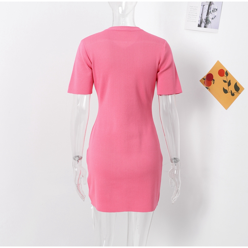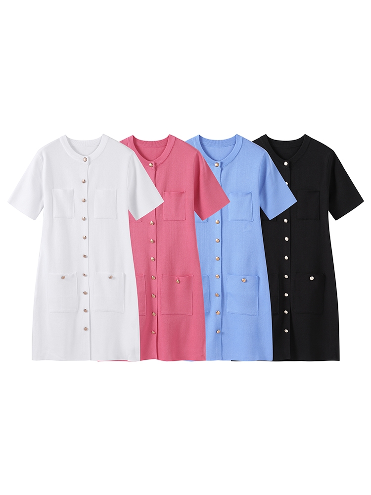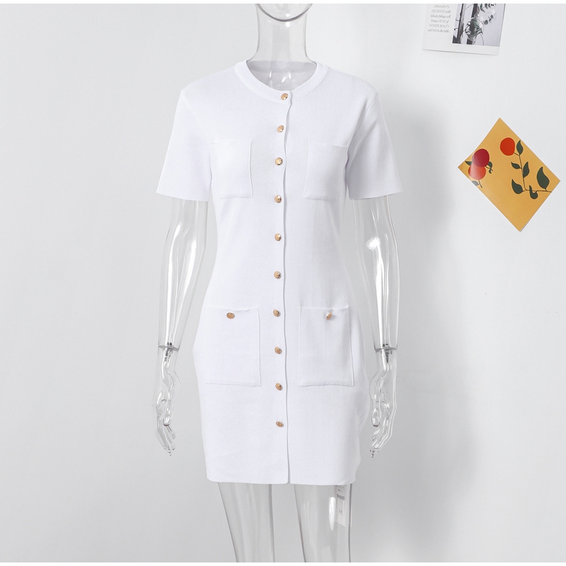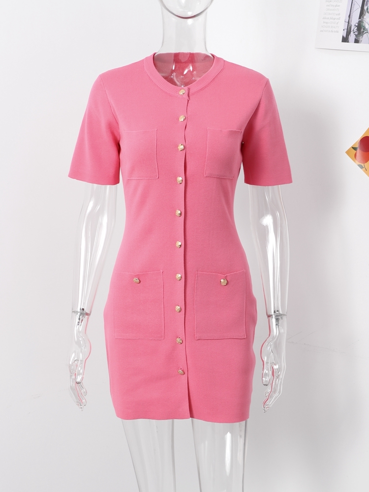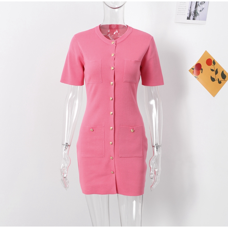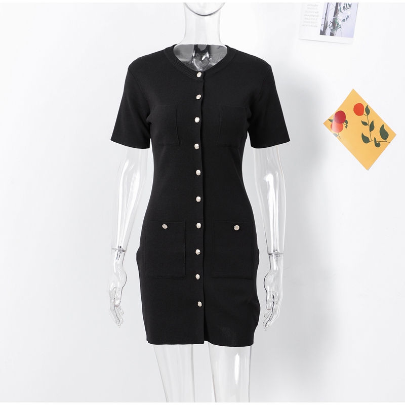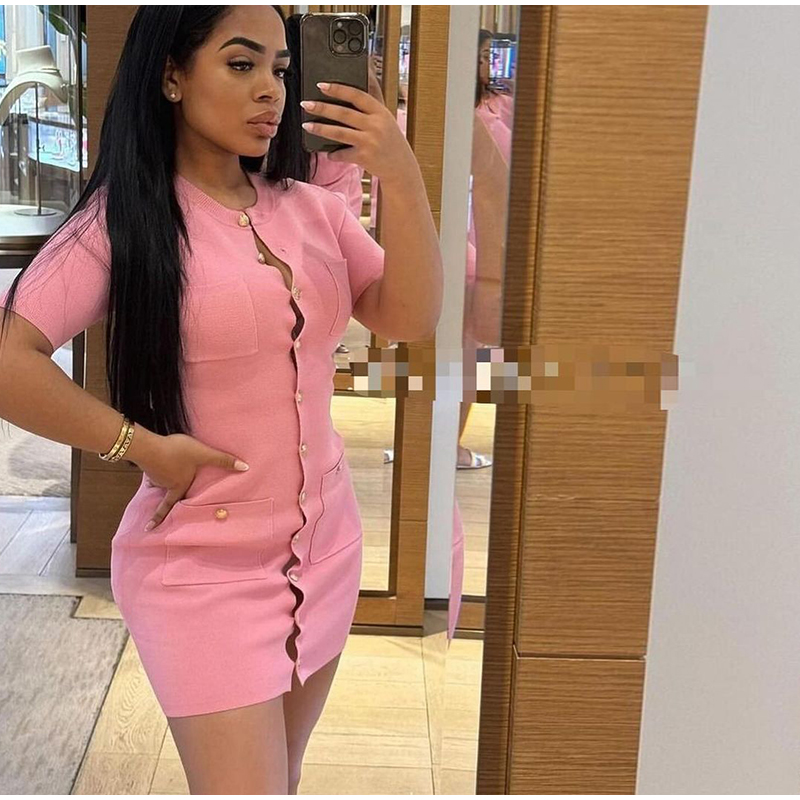 Knitted Casual Mini Dress Women Single Breasted Slim Short Sleeve Solid Pocket Hip Package Dresses Female 2024 New Office Robe