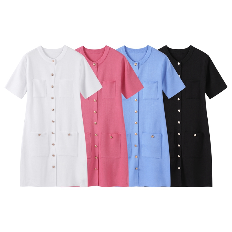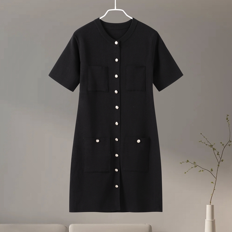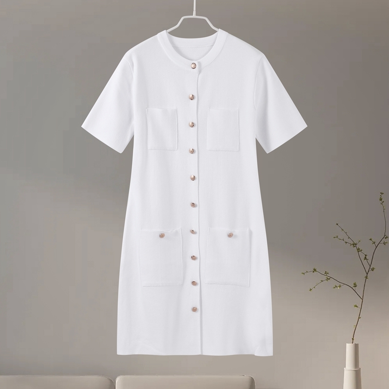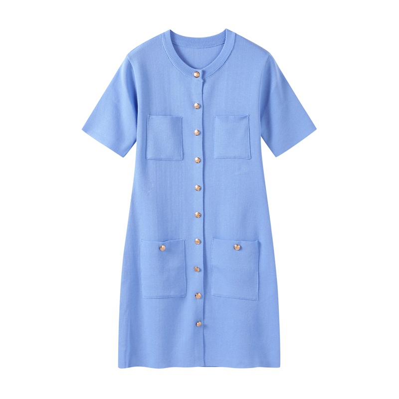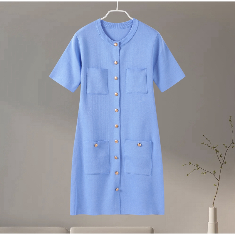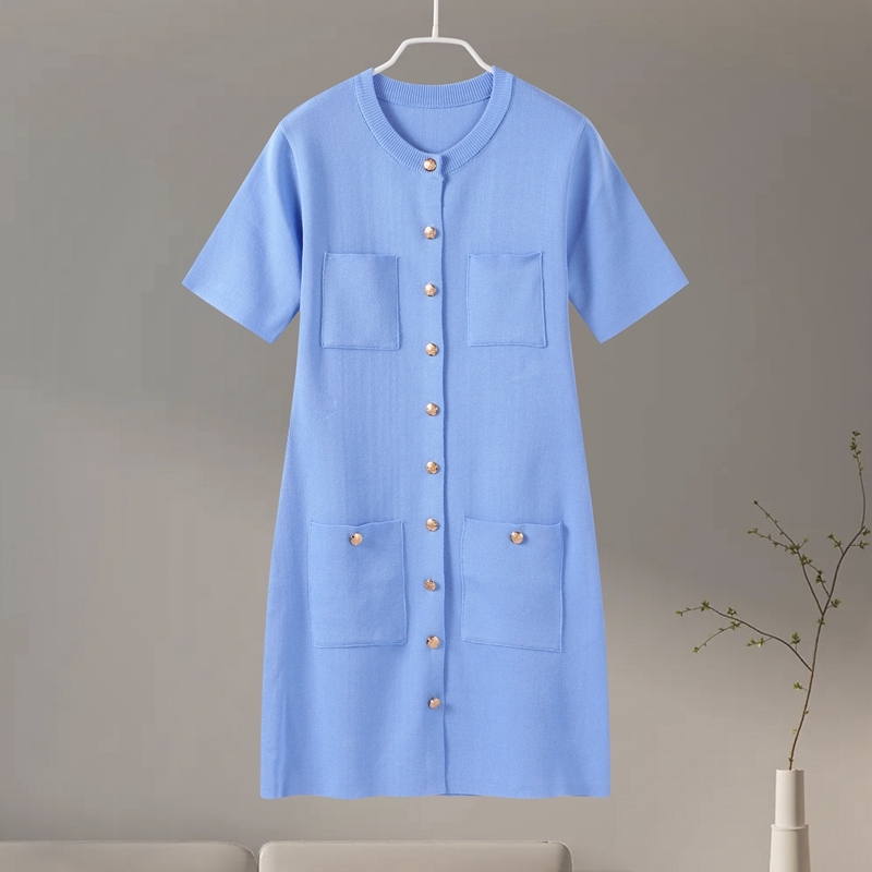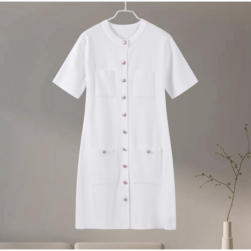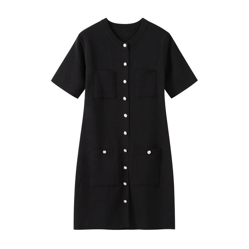 Knitted Casual Mini Dress Women Single Breasted Slim Short Sleeve Solid Pocket Hip Package Dresses Female 2024 New Office Robe
