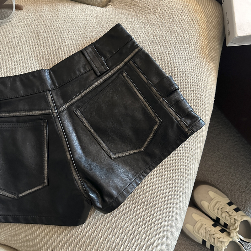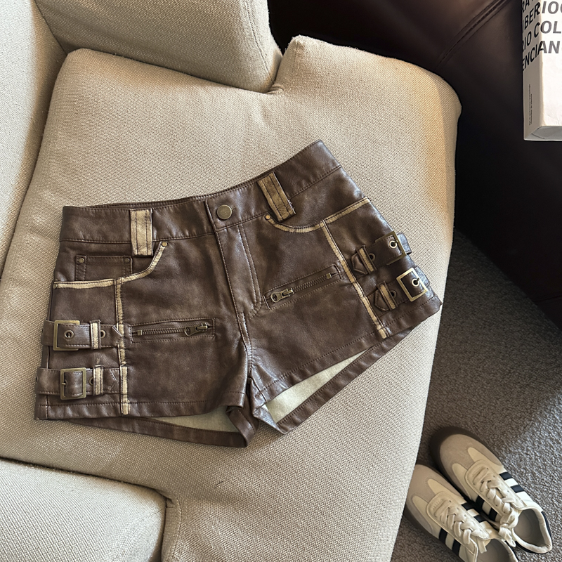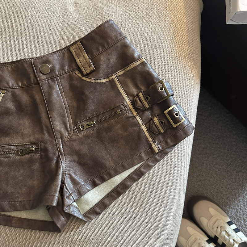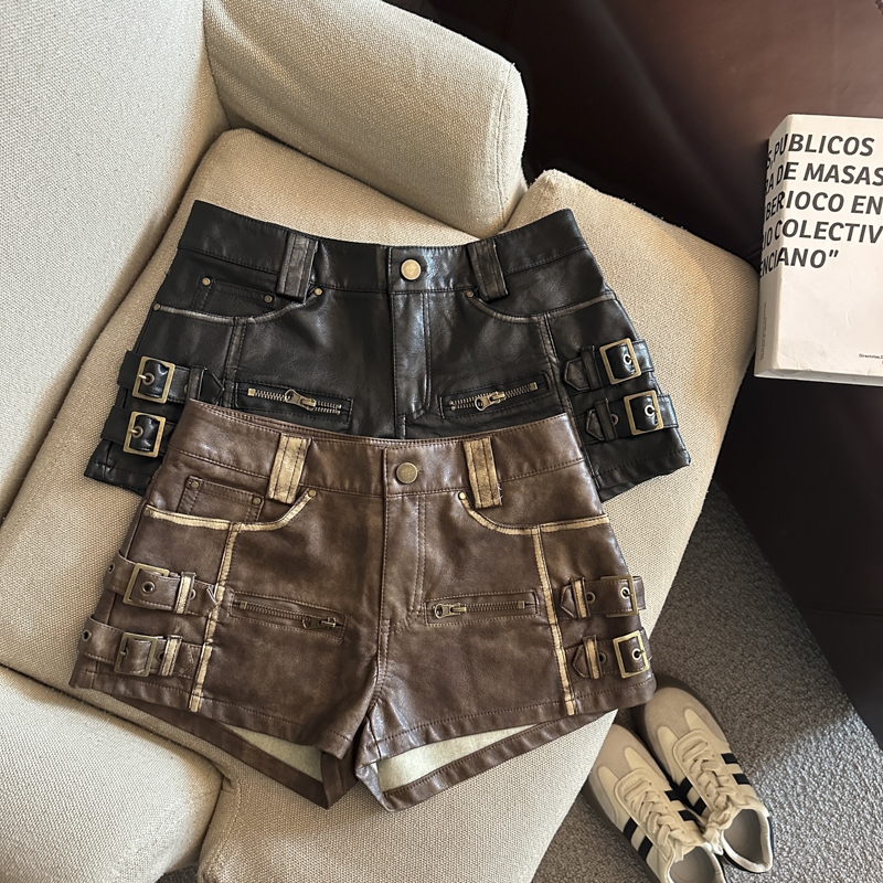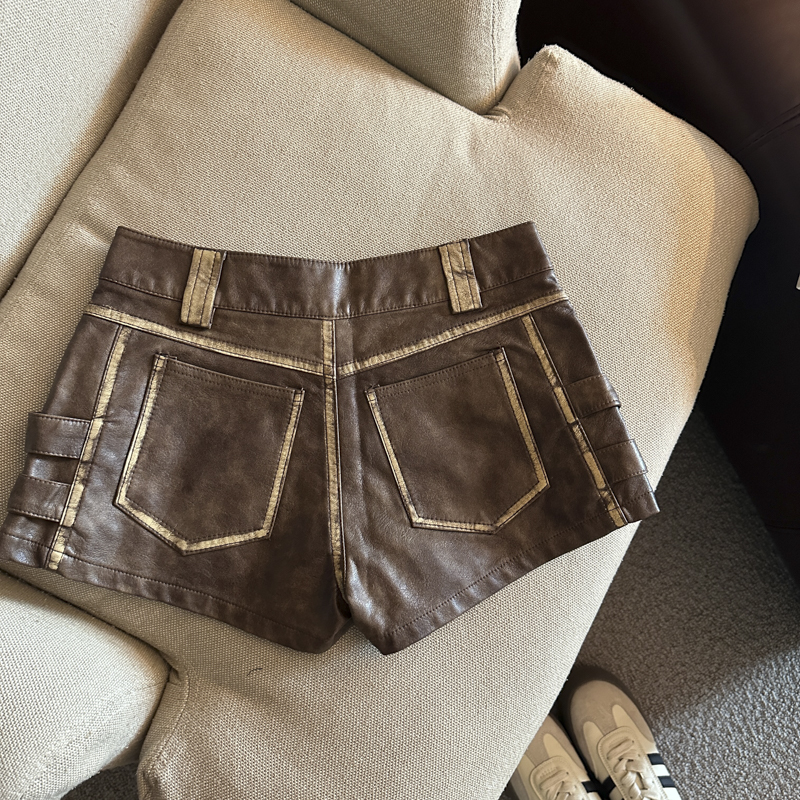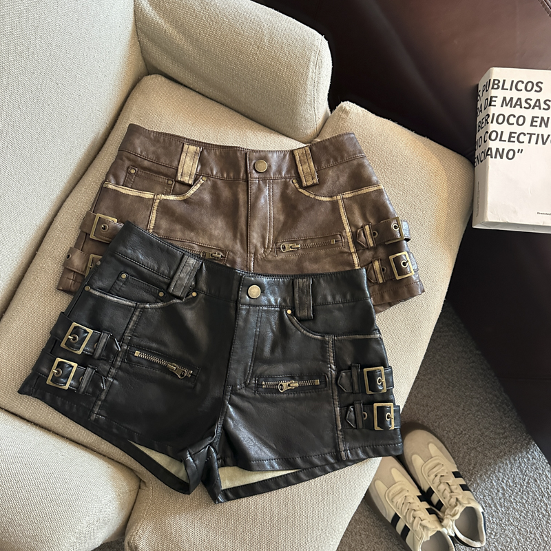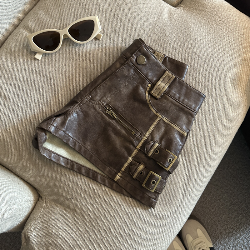 Korean Vintage Women’s Black Pu Leather Sexy Club Shorts Summer Brown High Waist Fashion Ladies Vacation Short Pant Streetwear