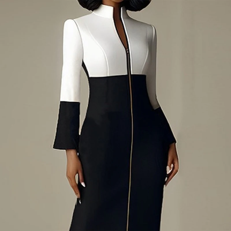 Krisstargirl 2025 New Women’s Bodycon Dresses Contrast Color V-neck with Zipper Long Sleeves Formal Occasion Office Midi Dresses