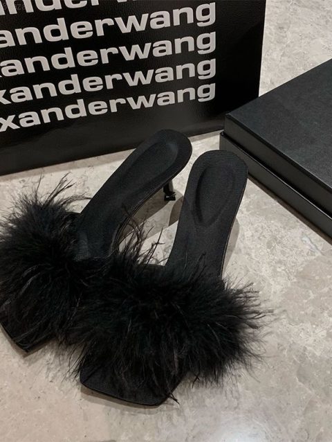 Korean Oversized Plush Sandals Sexy Black Feather Shoes for Women Elegant Versatile Peep-toe High-heeled Shoes New 2023 Spring