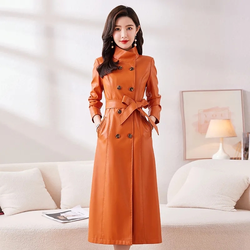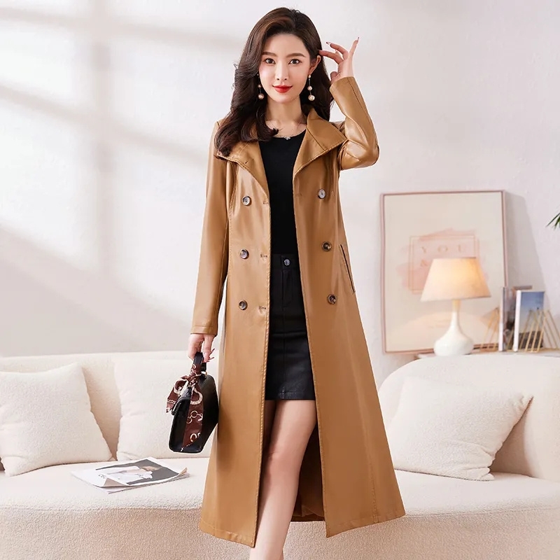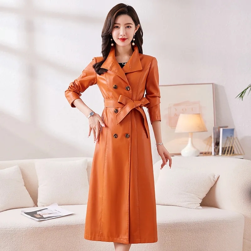 Leather Trench Coat For Women X-Long Windbreaker Double-Breasted Belt Slim Outerwear Ladies Coats Large Size M-7XL Spring Autumn