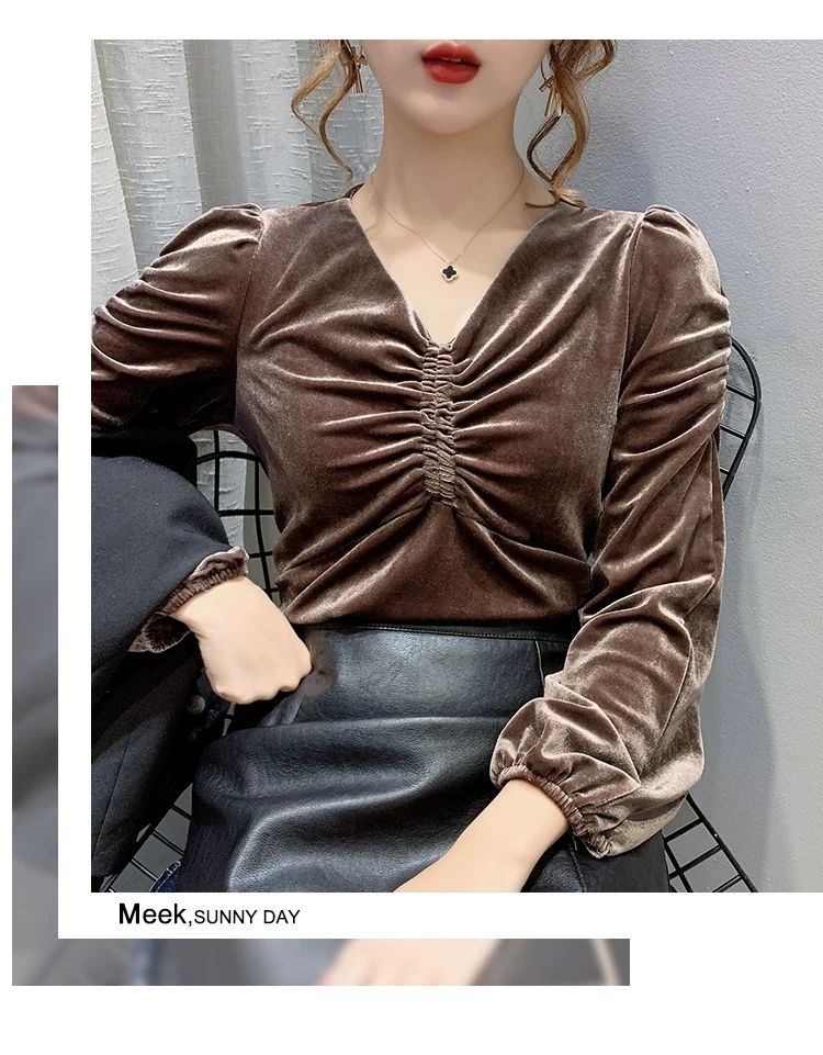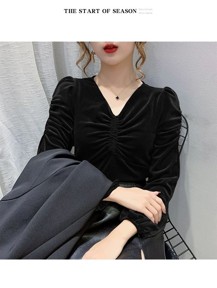 Long Sleeve Pleated V Neck Solid Office Tops Spring Autumn Slim Simplicity All-match Fashion T Shirts Casual Trend Women Clothes