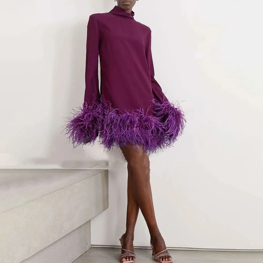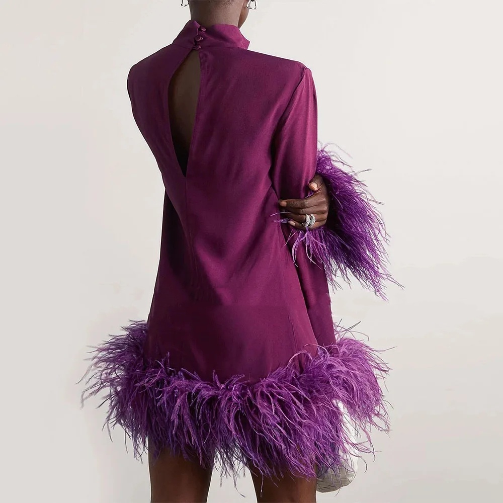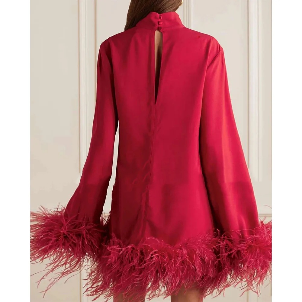 Mini Feather Long Sleeves Luxury Women’s Cocktail Gowns Short A Line High Collar Cut Out Sexy Party Gown Evening Party Dress