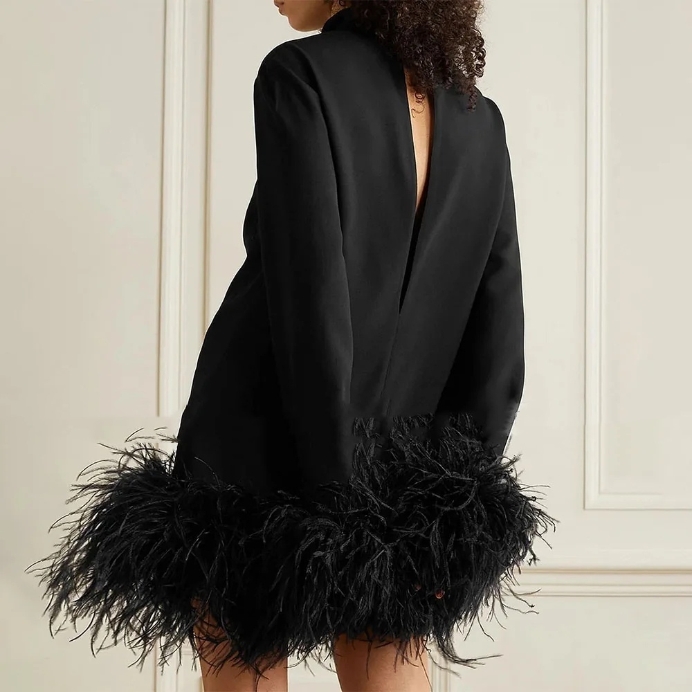 Mini Feather Long Sleeves Luxury Women's Cocktail Gowns Short A Line High Collar Cut Out Sexy Party Gown Evening Party Dress