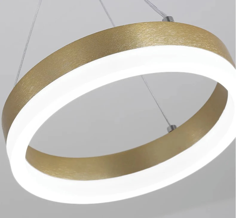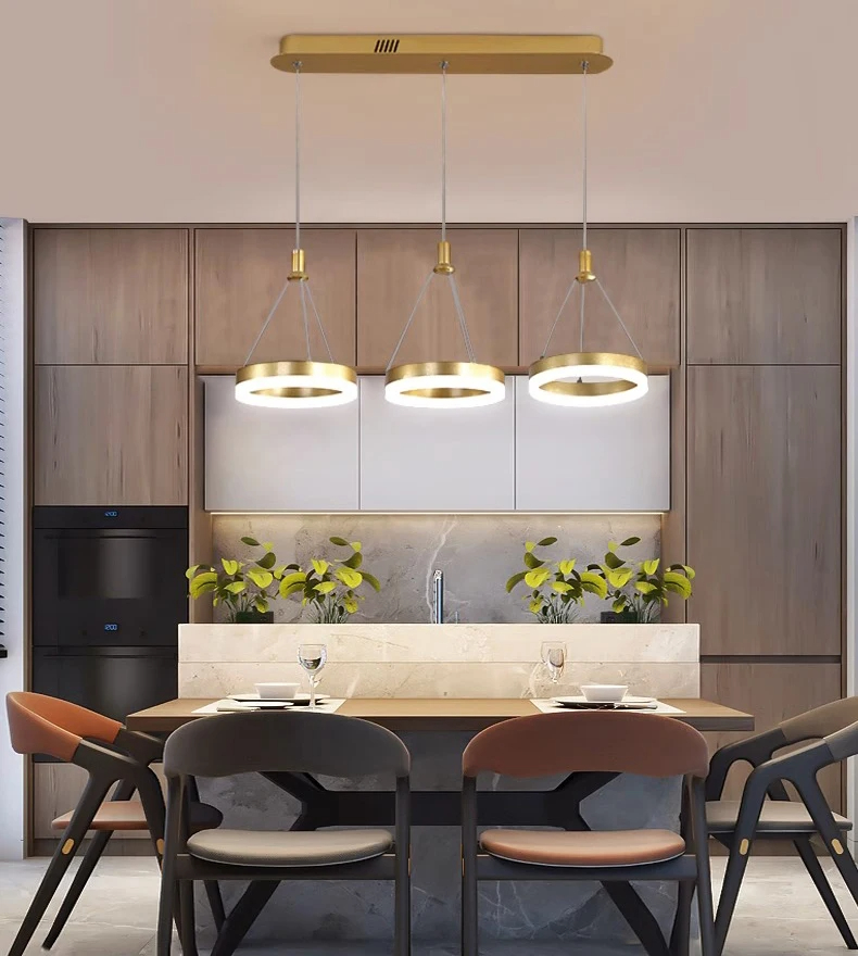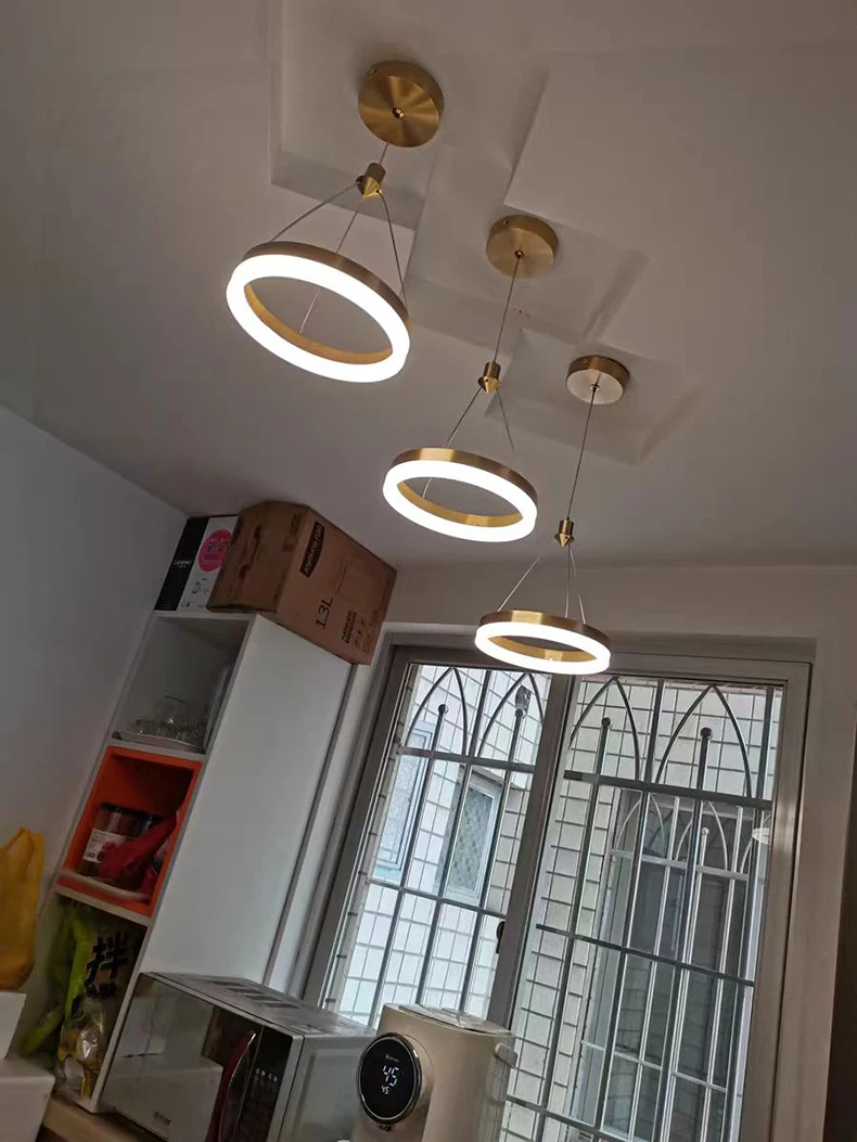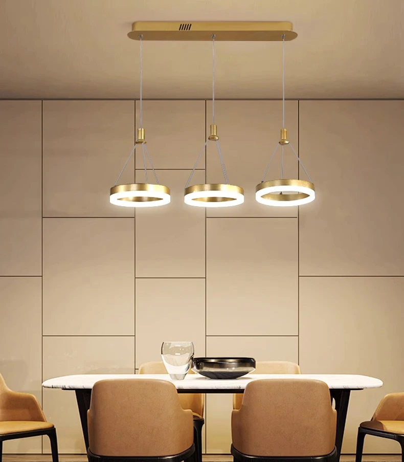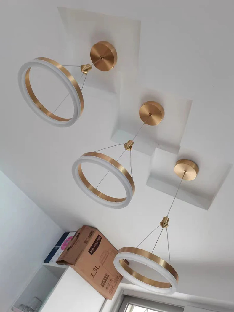 These golden ring chandeliers are amazing The warm glow and sleek design make my dining area feel like a fancy bistro So chic