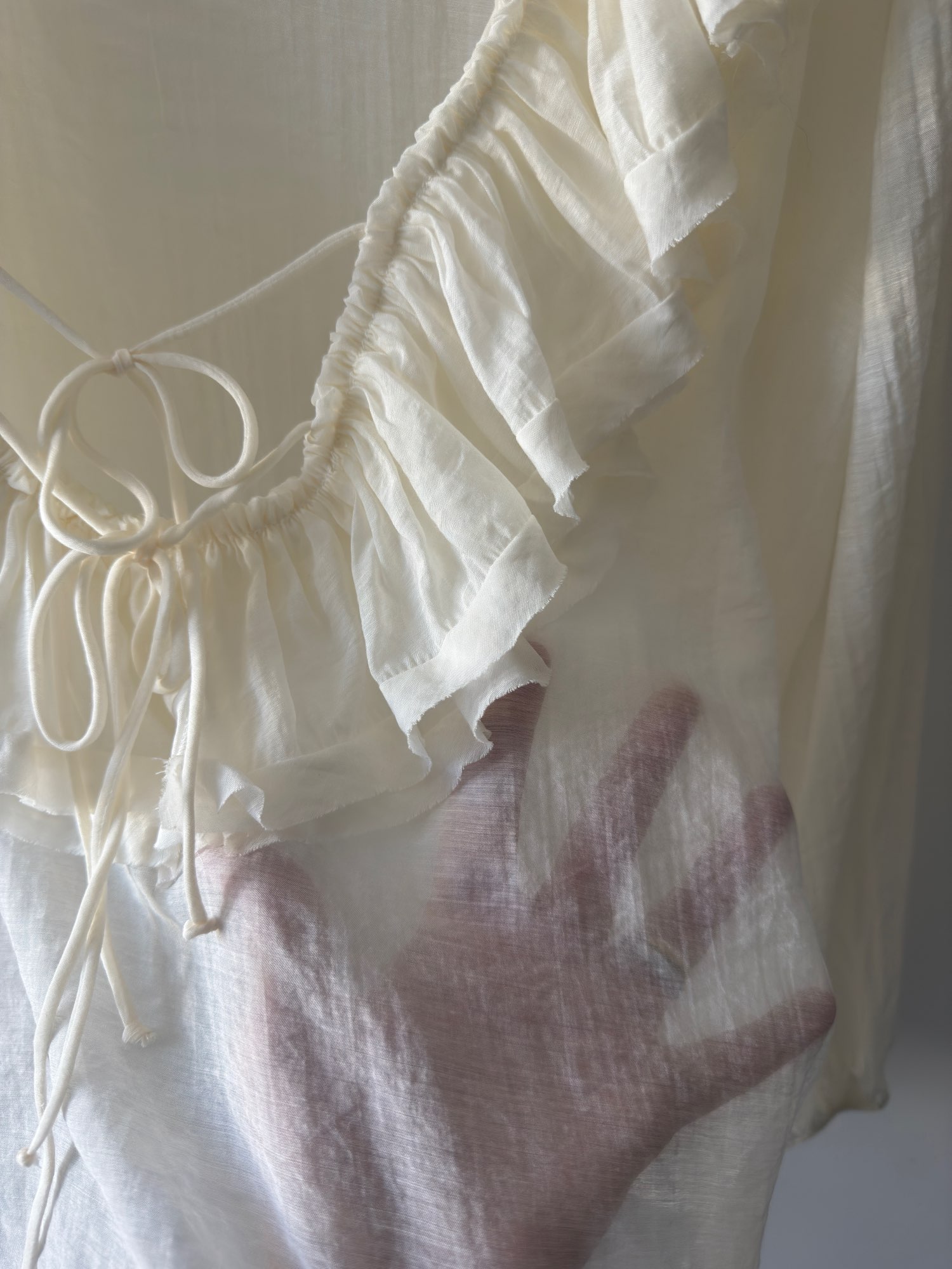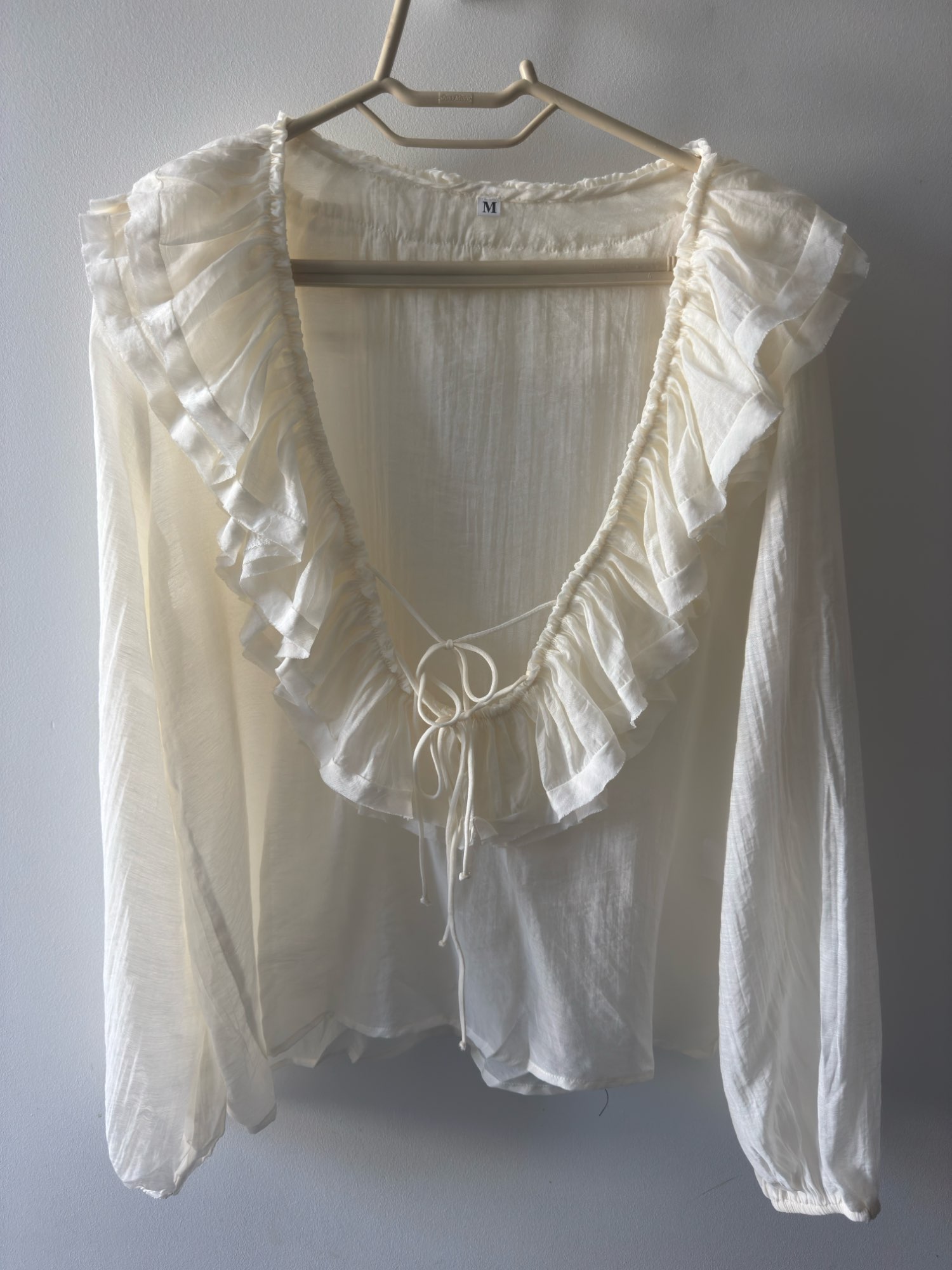 Muy satisfecha! La blusa es preciosa, la tela es vaporosa y hermosa, nada brillante. Es transparente pero se puede usar con un top o un bralette abajo y se verá hermosa