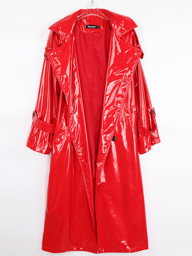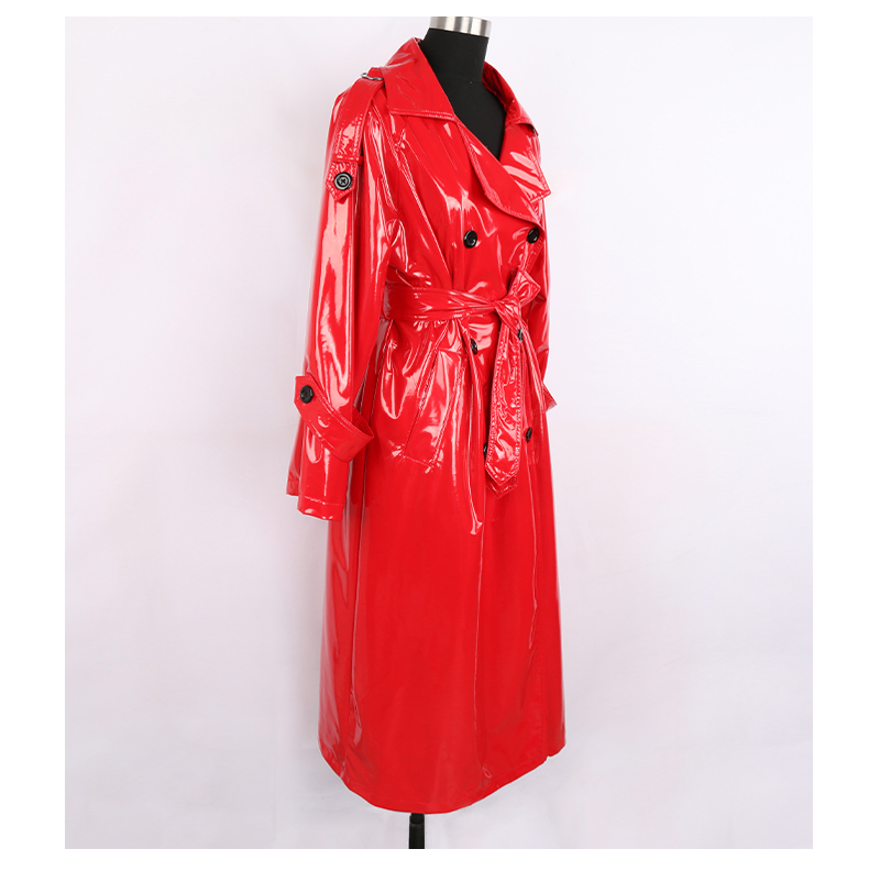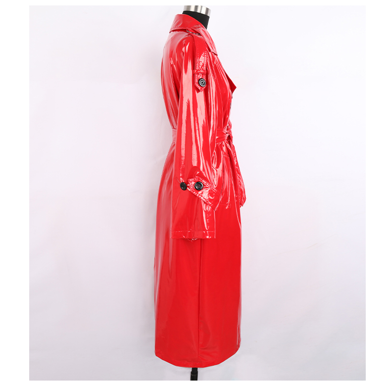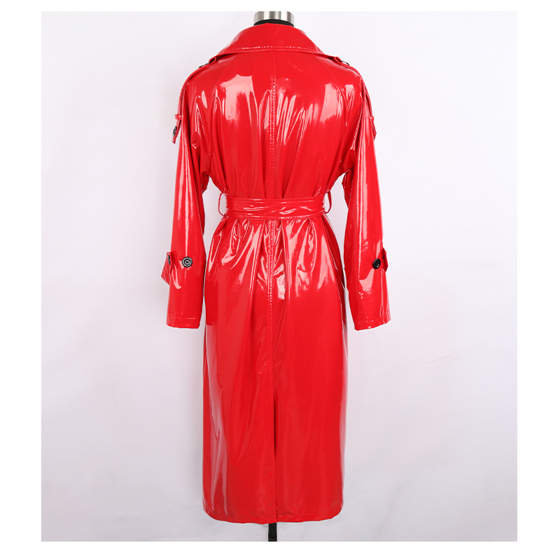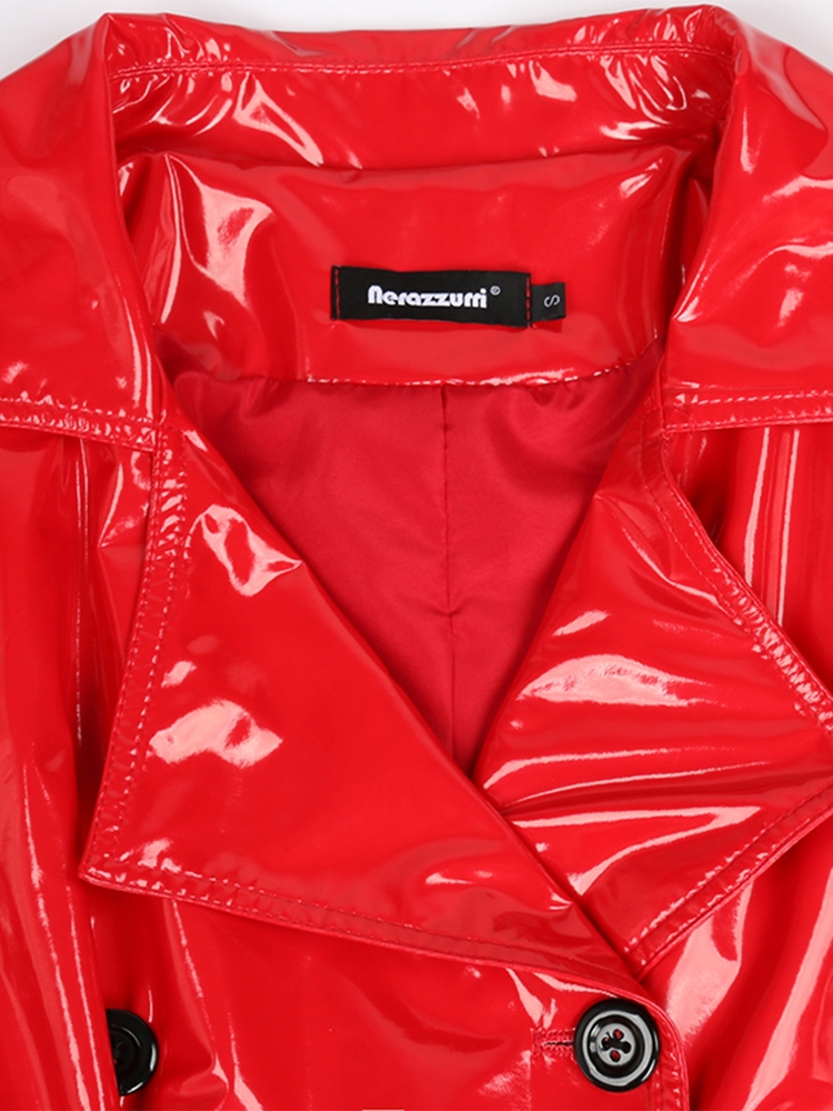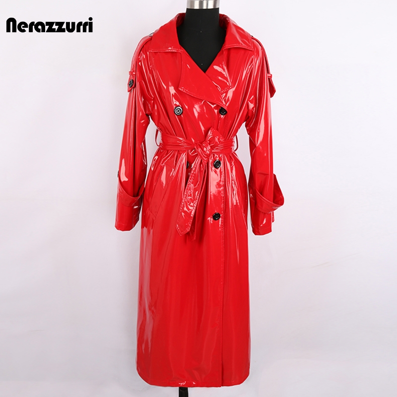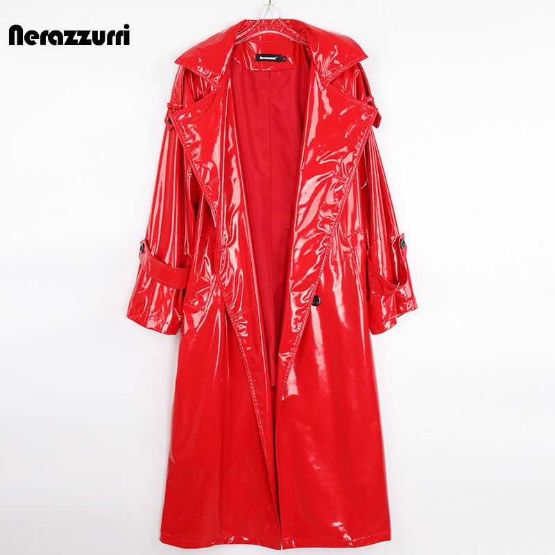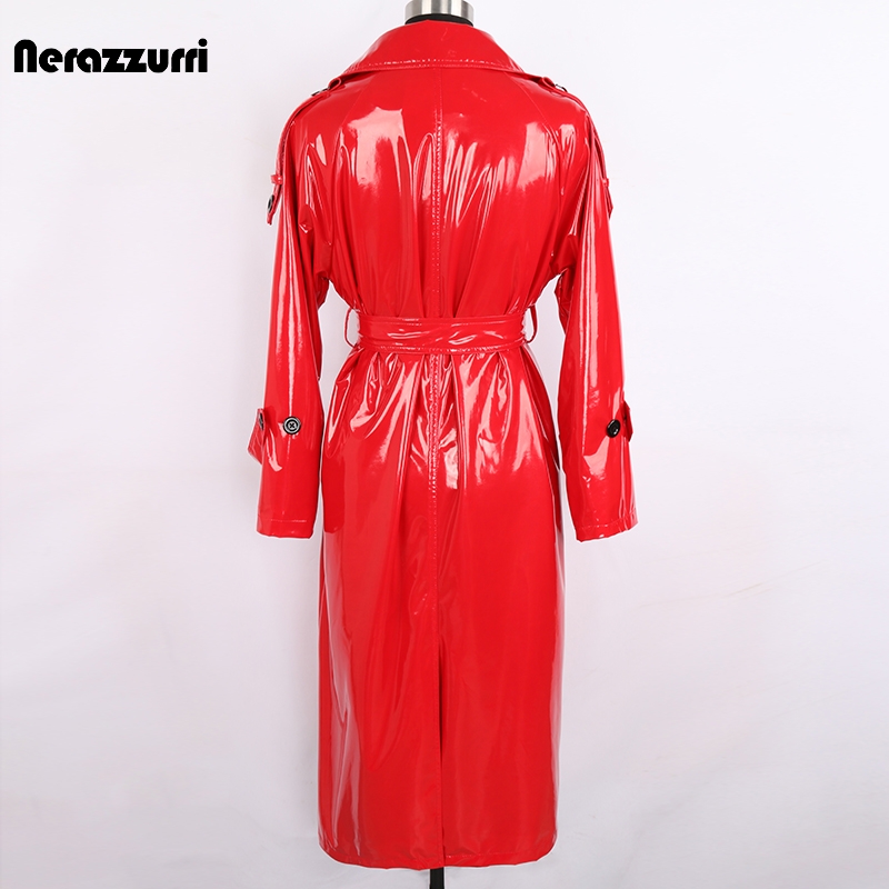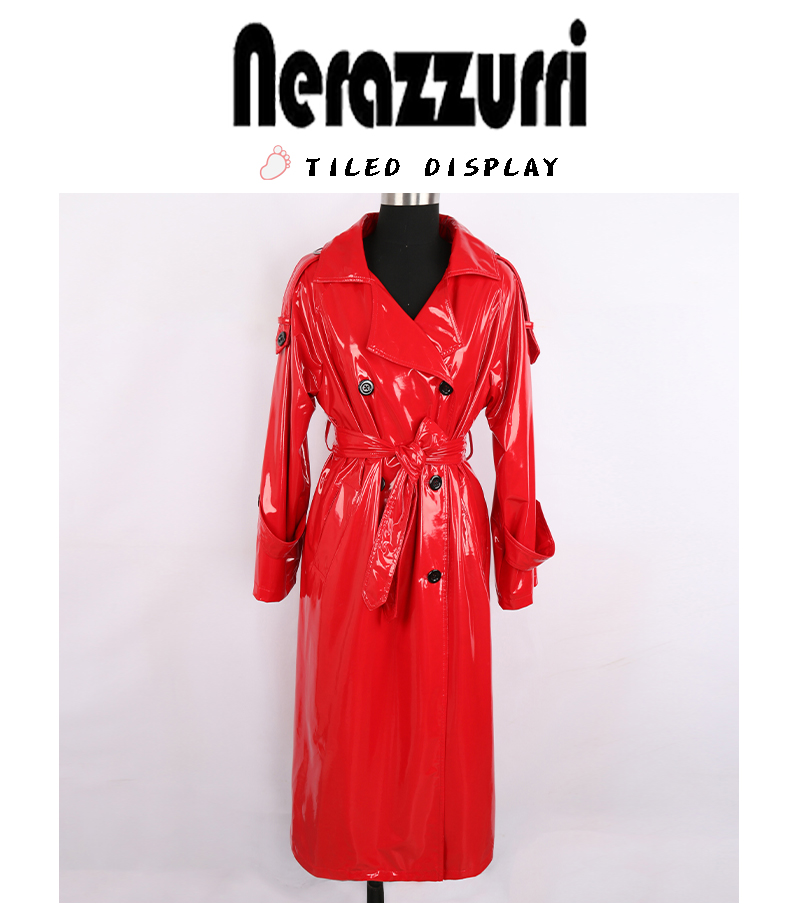 Nerazzurri Autumn Long Red Waterproof Shiny Reflective Patent Leather Trench Coat for Women Double Breasted Plus Size Fashion