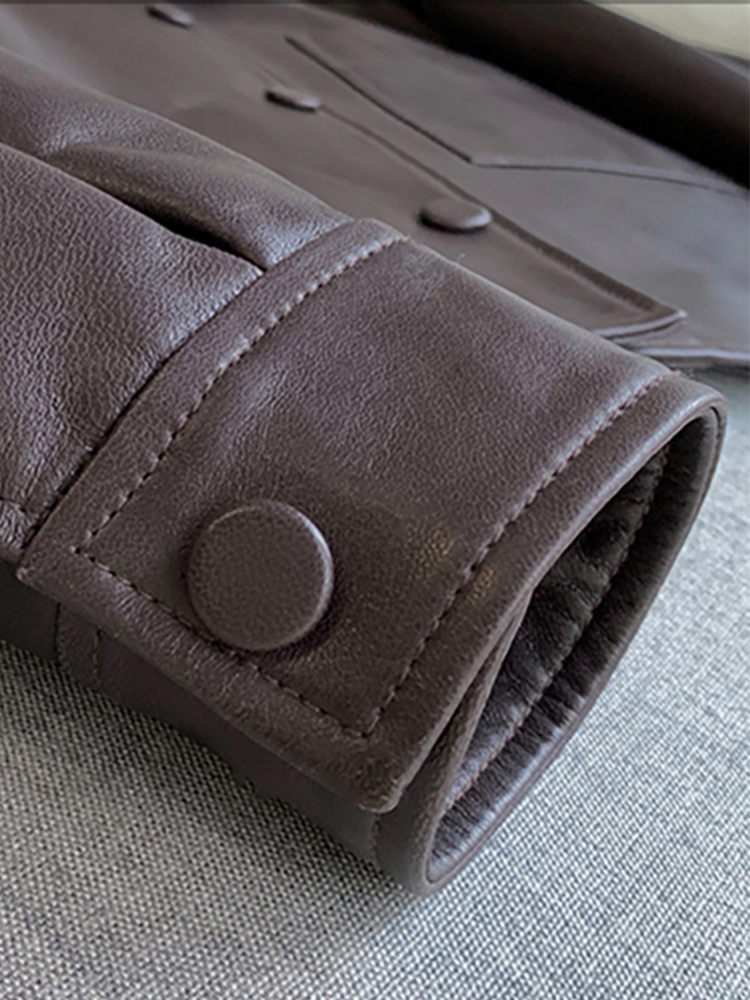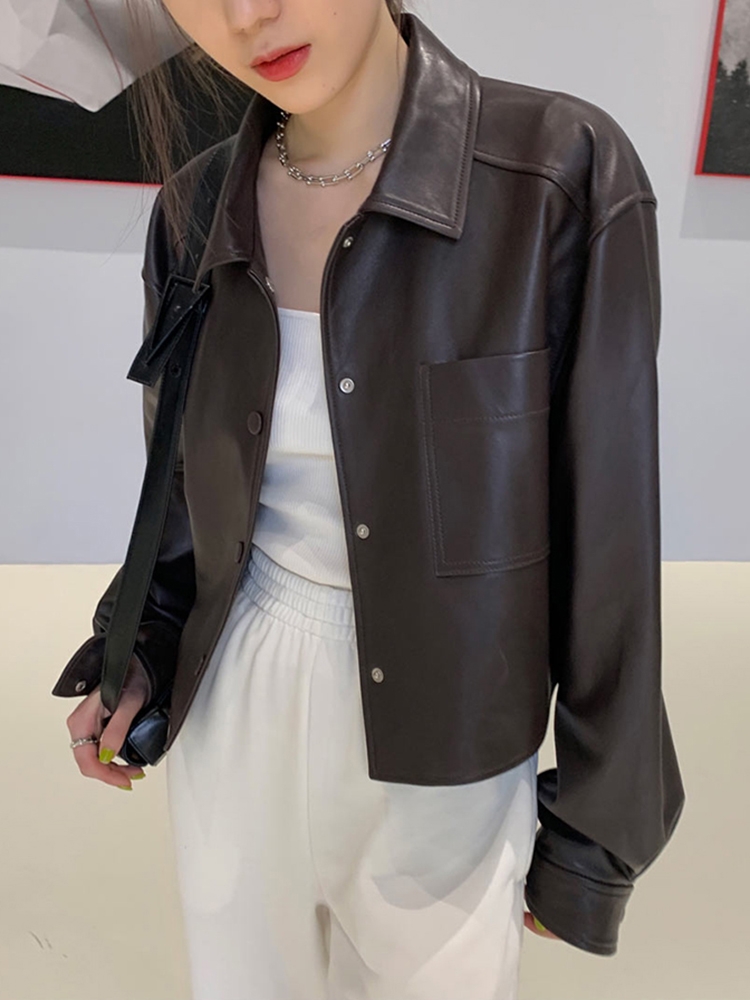 Nerazzurri Spring Autumn Brown Short Soft Pu Leather Jacket Women Long Sleeve Pocket Loose Casual Korean Fashion Clothing 2025