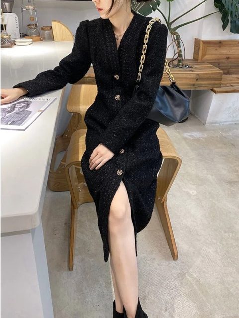 Women Hepburn Style Luxury Chic Vintage Single Breasted Woolen Dresses Office Lady Elegant V Neck Long Sleeve Slim Dress Vestido
