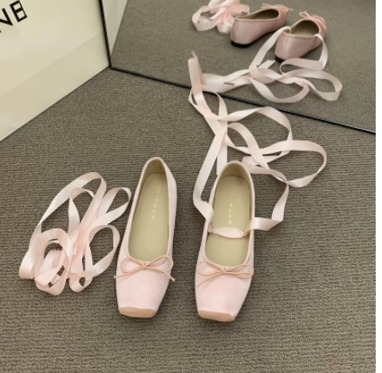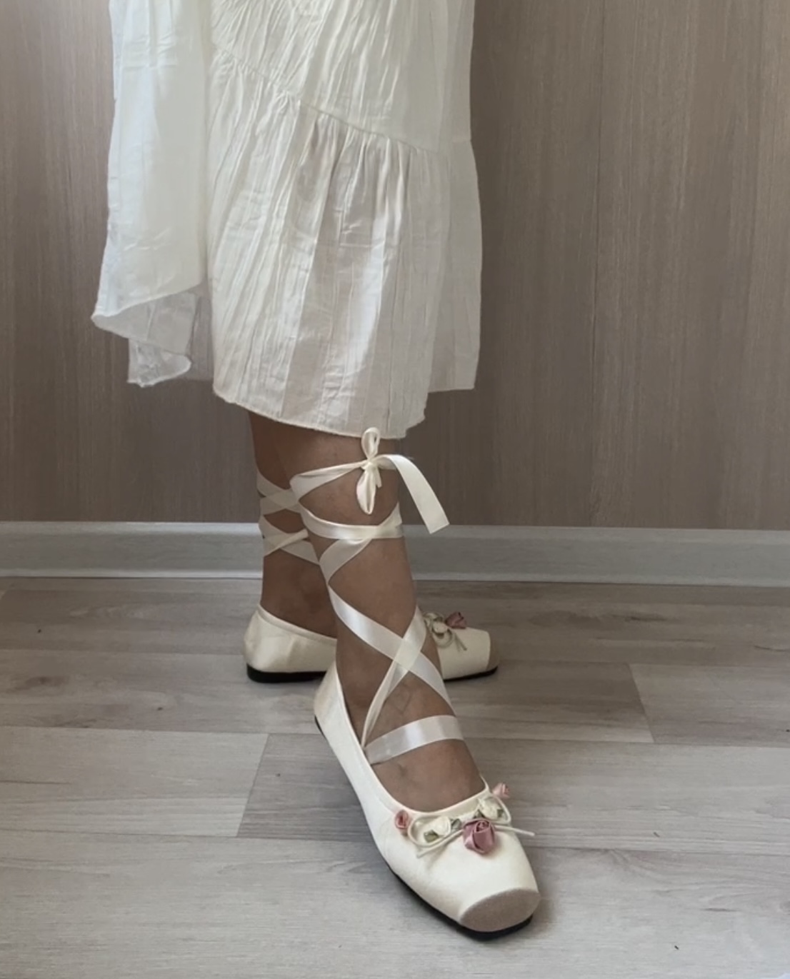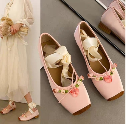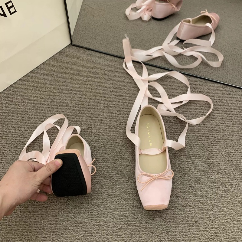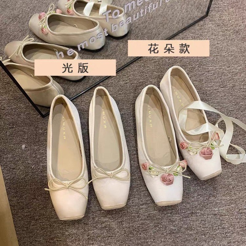 NEW Classic Silk Ballet Shoes Lace Up Ballet Shoes Women Square Toe Bowtie and Rose Flower Women Flats Elegant Valentine Shoes