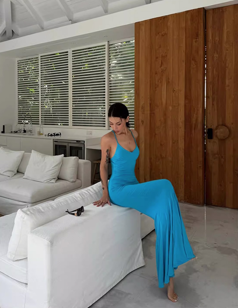 New In Dresses Women’s Blue Elastic Spaghetti Straps Ankle Length Dresses Slip Party Cocktail Evening Dress Holiday Beach Wear