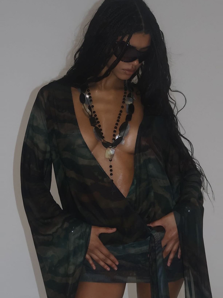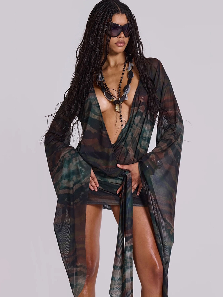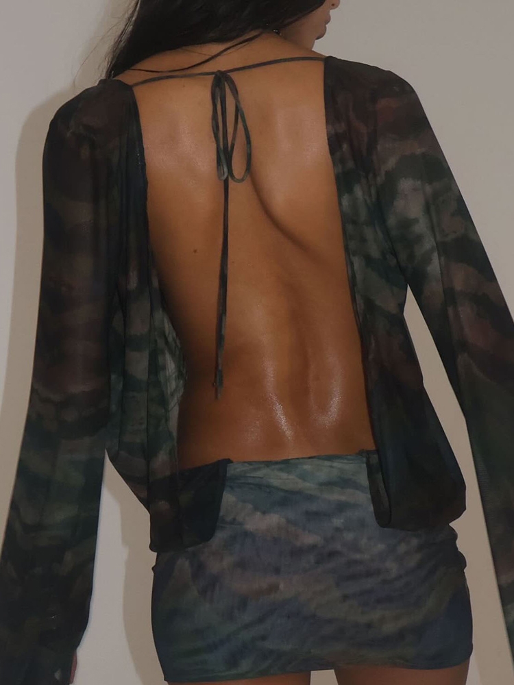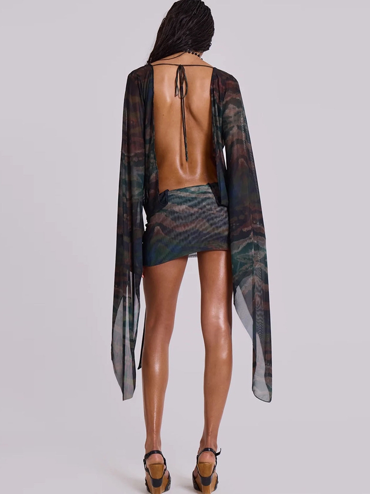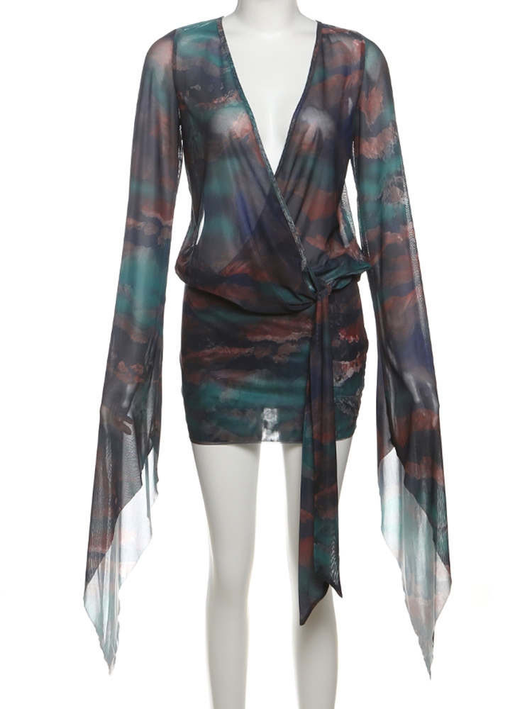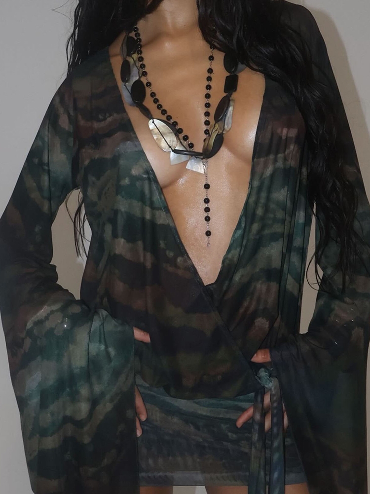 Nibber Sexy See Through Tie-Dye Dress Women Deep V-Neck Lace-Up Backless Loose Full Sleeve Summer Party Coquette Mini Bodycon