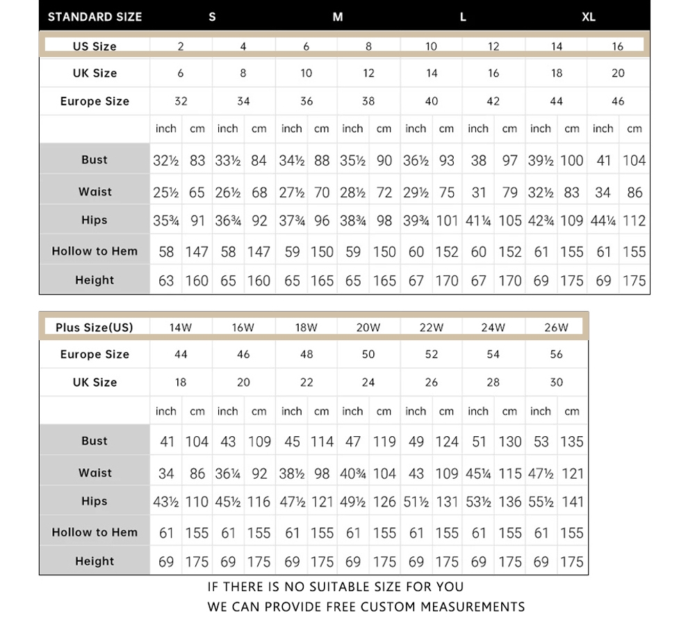 US Size | 10, 12, 14, 14 W, 16W, 18, 18 W, 2, 20W, 22, 22W, 24, 24W, 4, 6, 8, Custom size |