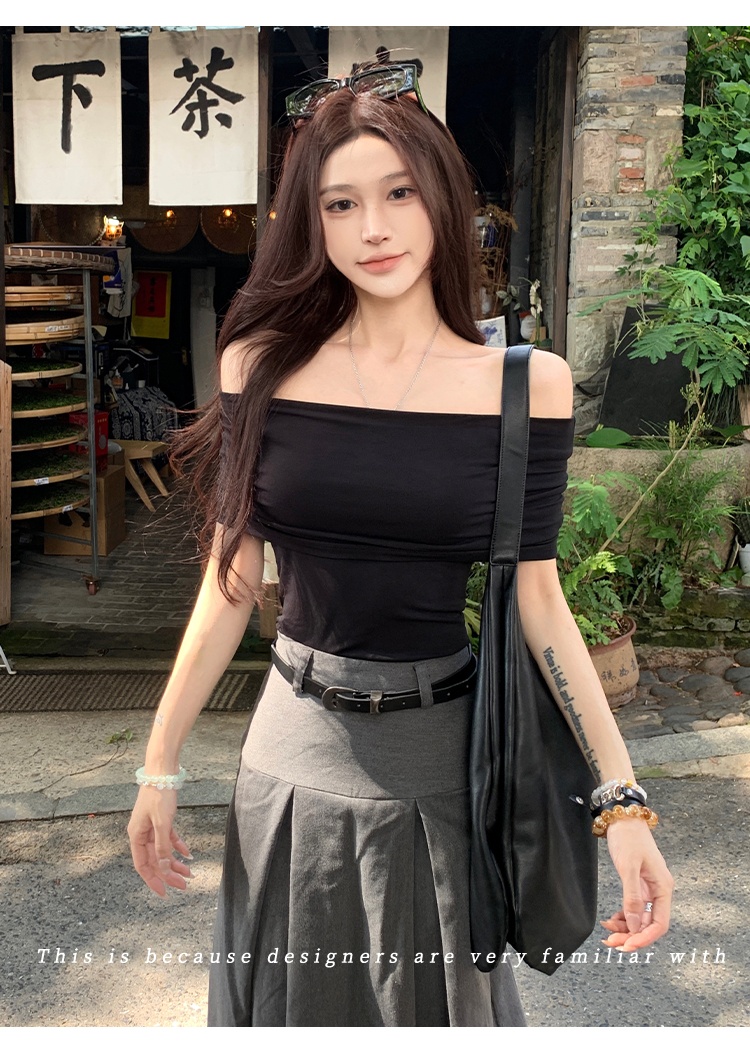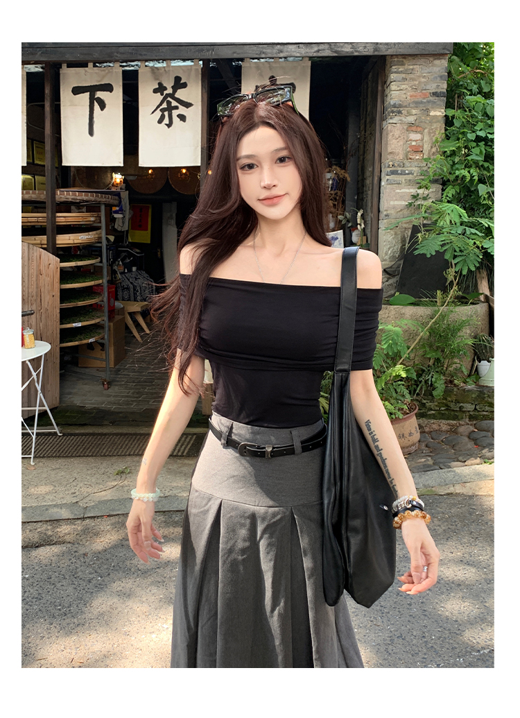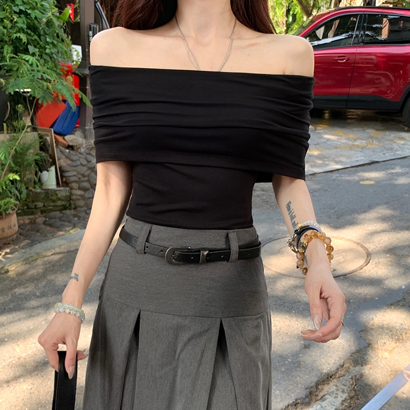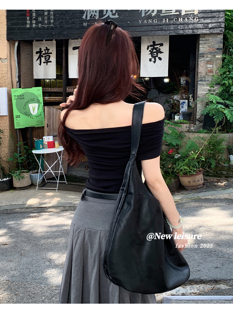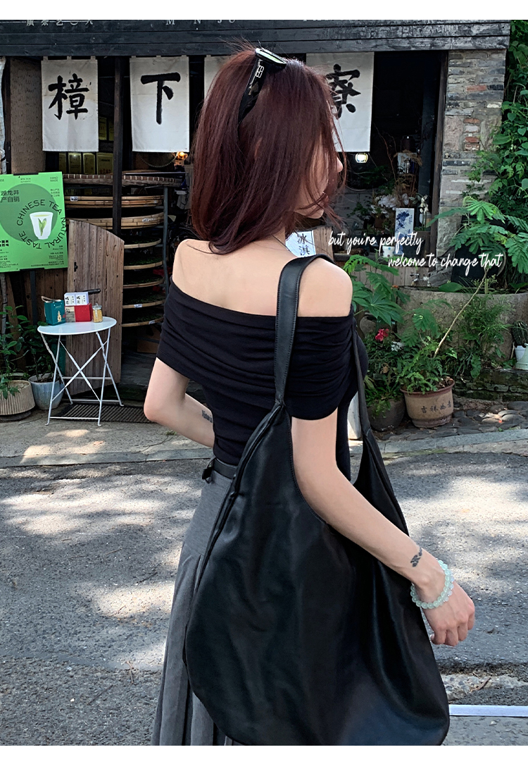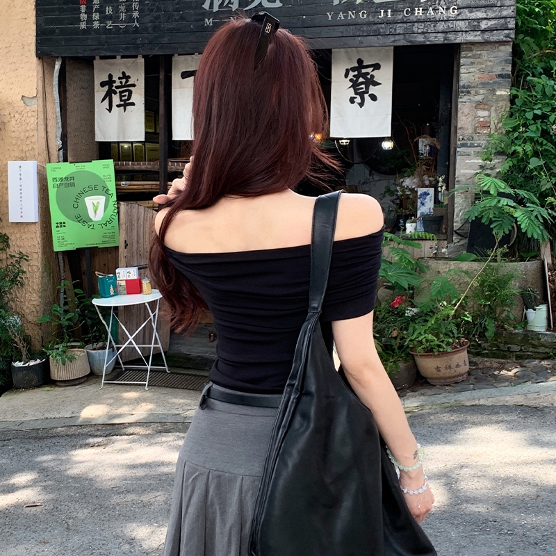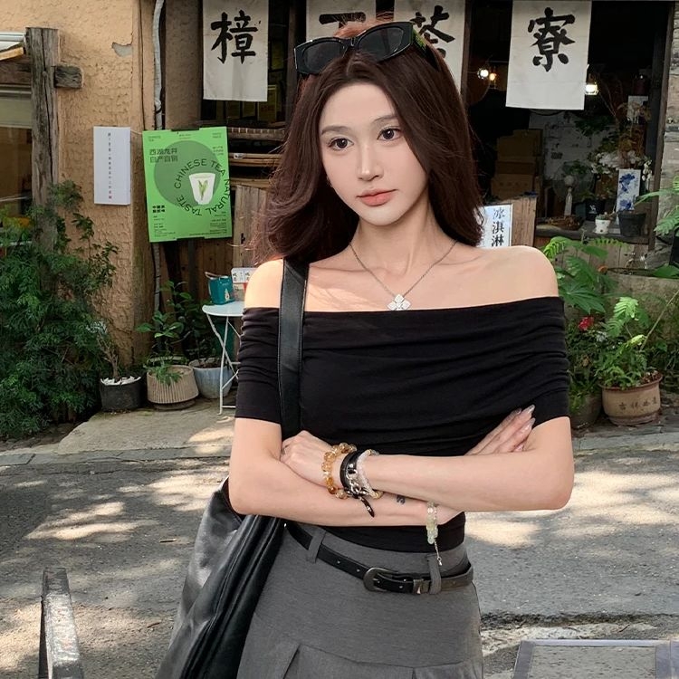 One Shoulder Tops Women Premium Black Short Sleeve Strapless Niche Design French Strapless Unique Beautiful