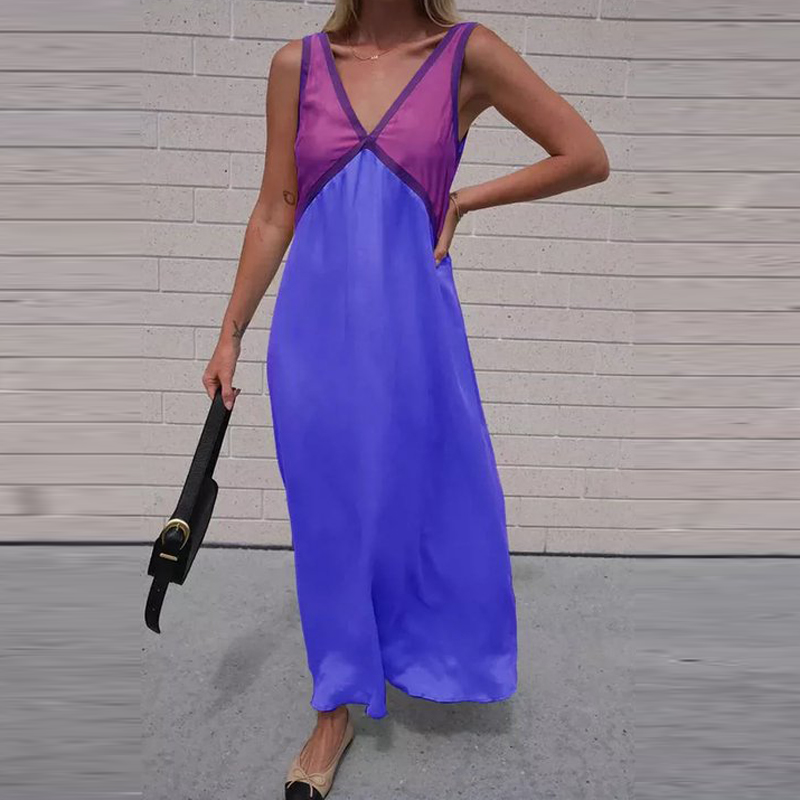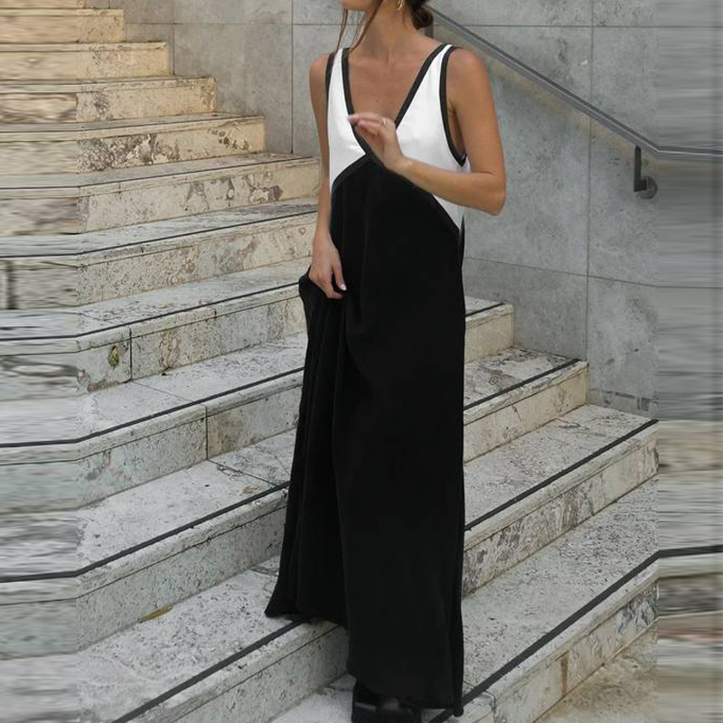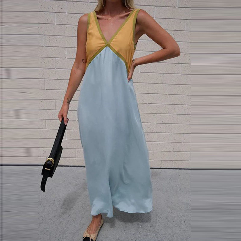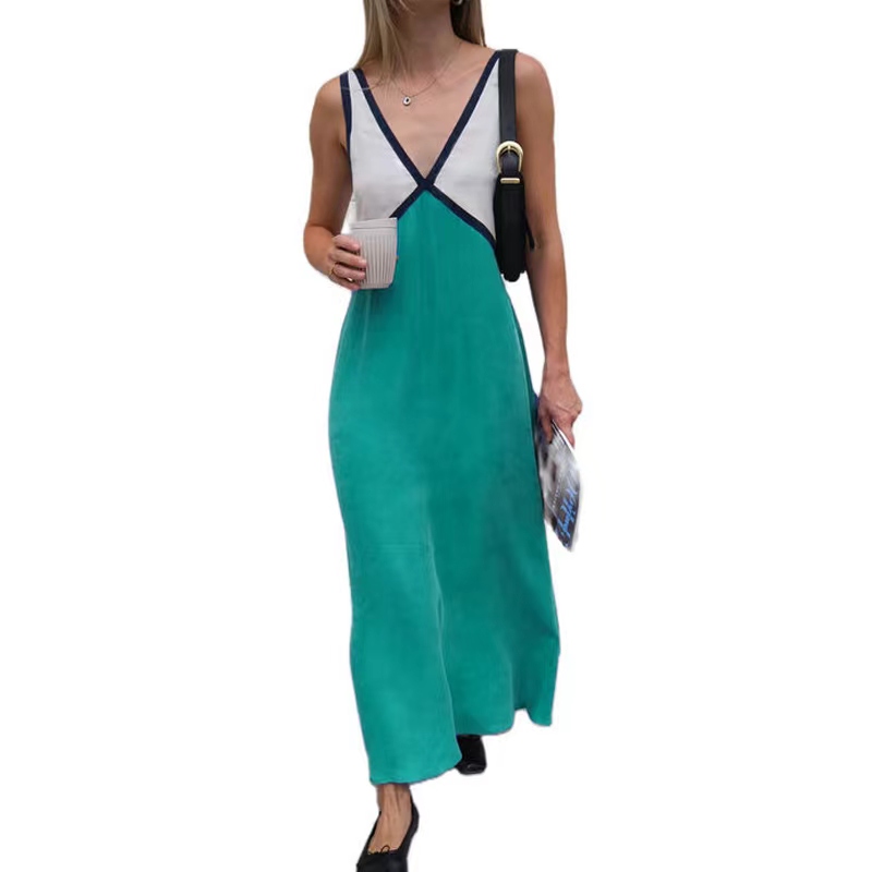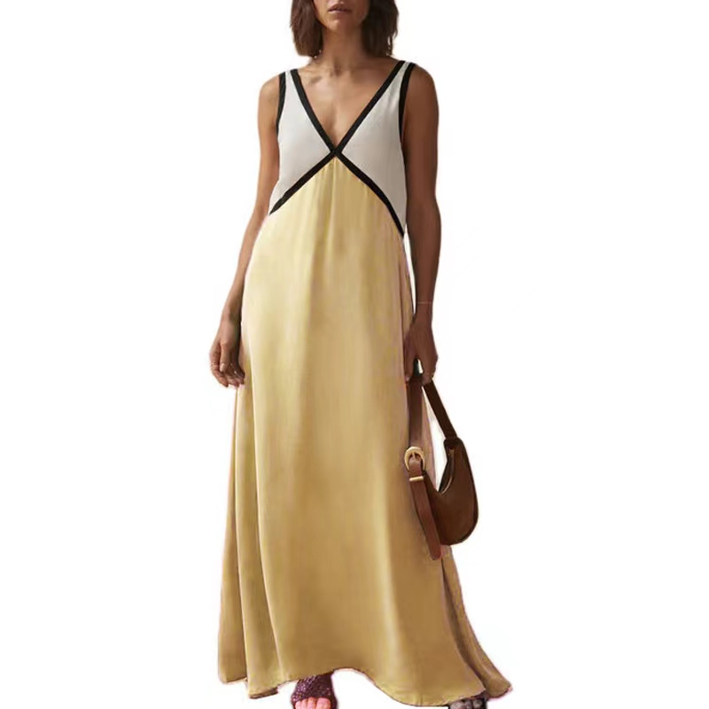 Patchwork Contrast Color Sleeveless Dress Women Sexy V-neck Midi Dresses 2024 Spring Summer Fashion Lady Elegant Casual Robes