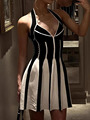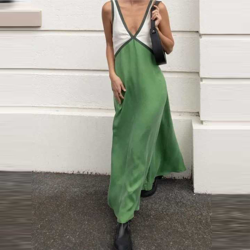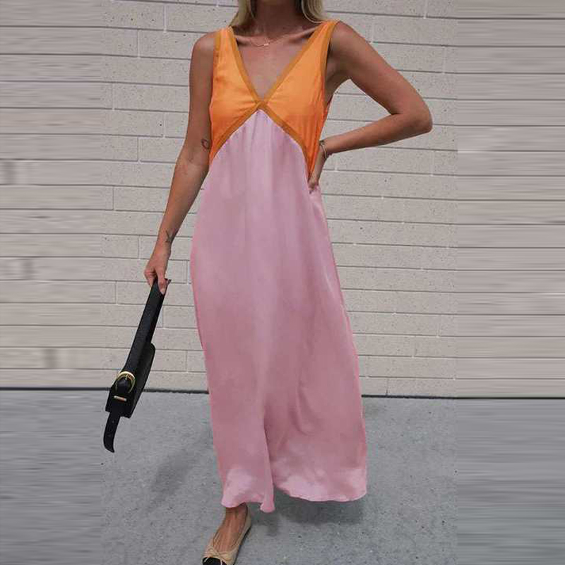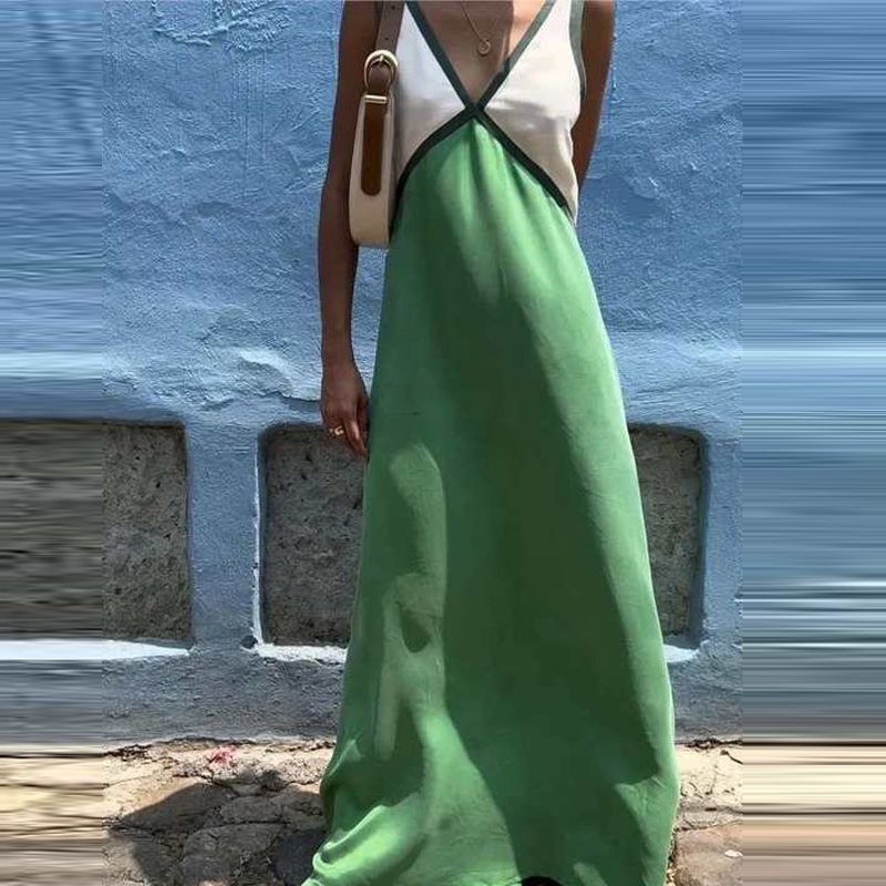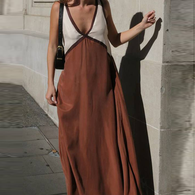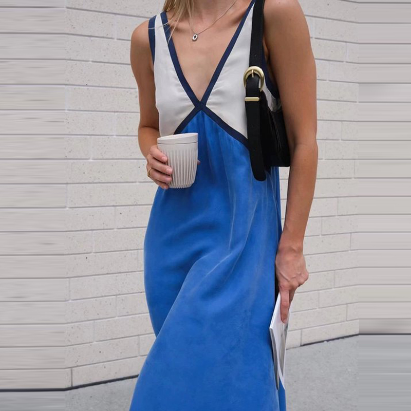 Patchwork Contrast Color Sleeveless Dress Women Sexy V-neck Midi Dresses 2024 Spring Summer Fashion Lady Elegant Casual Robes