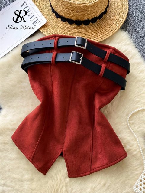 SINGREINY American Retro Fake Suede Tank Top Women Strapless Sashes Design Sexy Blouse Streetwear Irregular Vintage Camisole