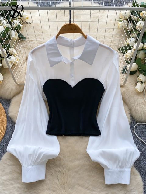 SINGREINY Senior Gentle OL Blouse Female Polo Collar Lantern Sleeves Patchwork Chic Shirts Autumn Light Luxury Vintage Short Top
