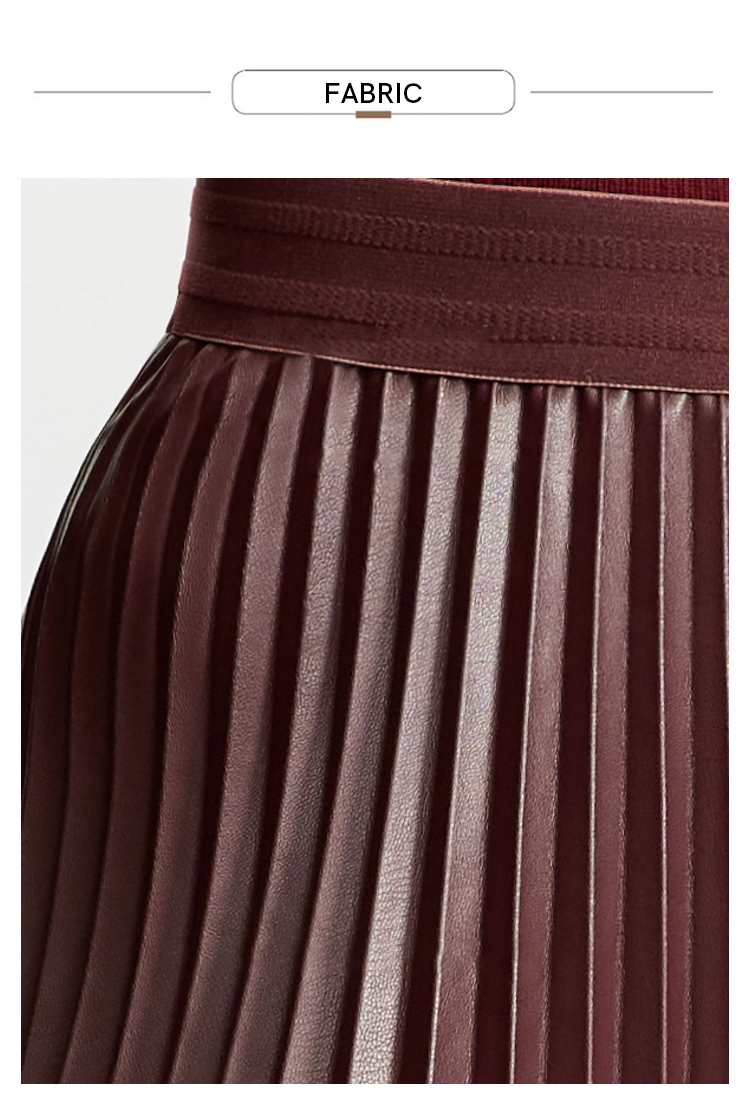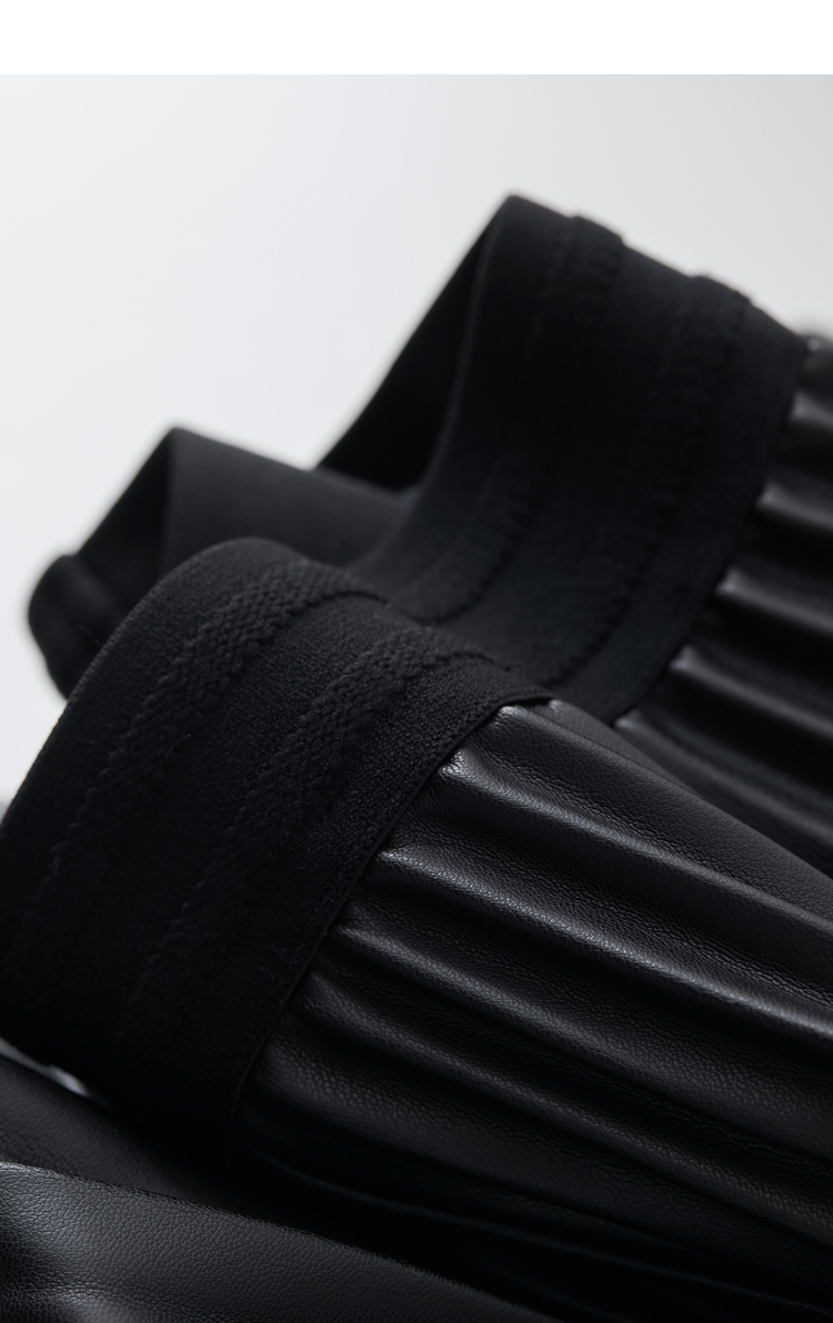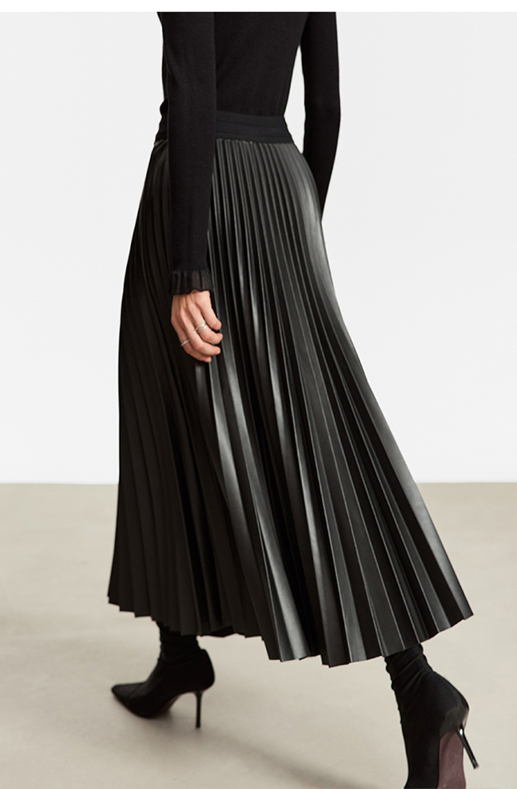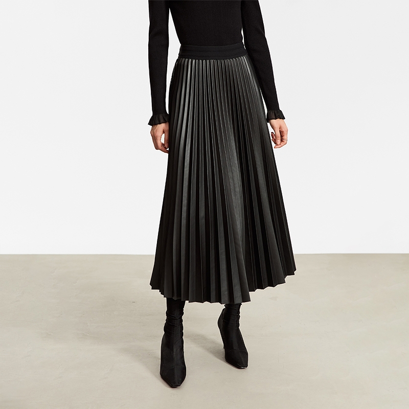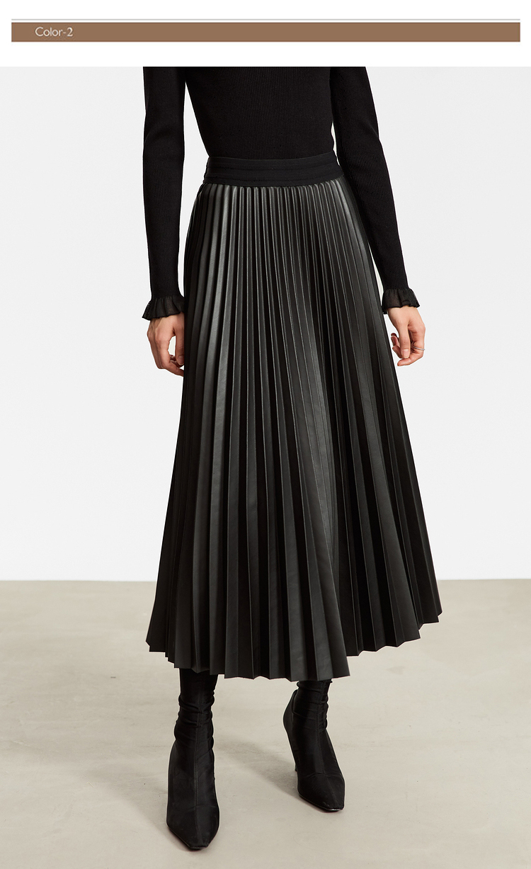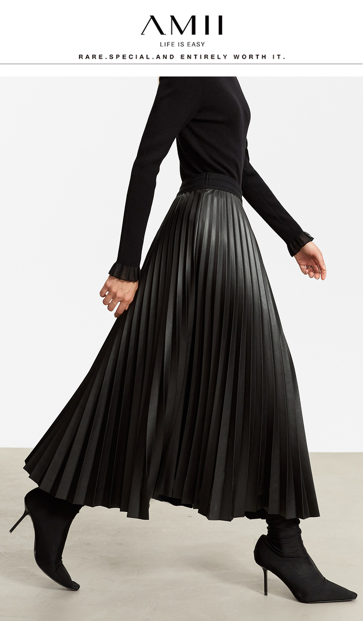 Waistline: NaturalnMaterial: PU LeathernSilhouette: A-line PleatednDresses Length: Mid-CalfnElasticity: Slight StretchnSeason: Winternnn**Elegant Design and Versatility**nThe AMII Minimalist Retro Fashion Women Skirts 2024 Winter New A-line Pleated PU Simple Office Lady Leather Skirt Female 12323021 is a testament to timeless style. Designed with a natural waistline and a slight stretch for comfort, this long pleated skirt is a perfect blend of elegance and practicality. The A-line silhouette flatters various body types, while the pleats add a touch of sophistication to the overall look. The mid-calf length makes it suitable for both casual and professional settings, making it a versatile addition to any wardrobe.nn**Comfort Meets Durability**nCrafted from premium PU leather, this black pleated skirt not only offers a sleek and polished appearance but also ensures durability for the colder months. The leather material provides a slight stretch, allowing for ease of movement while maintaining its shape throughout the day. The 105℃挥发物≤:AMII specification ensures that the skirt meets high-quality standards, making it a reliable choice for the fashion-conscious woman.nn**Perfect for the Modern Woman**nWhether you're heading to the office or stepping out for a casual gathering, this skirt is designed to meet the needs of the modern woman. Its solid pattern and simple yet chic design make it a staple piece that can be easily paired with various tops and accessories. The folds serve as a subtle decoration that adds depth to the skirt's overall look. Although not customizable, the skirt's solid pattern and classic design ensure it remains a timeless addition to any wardrobe.