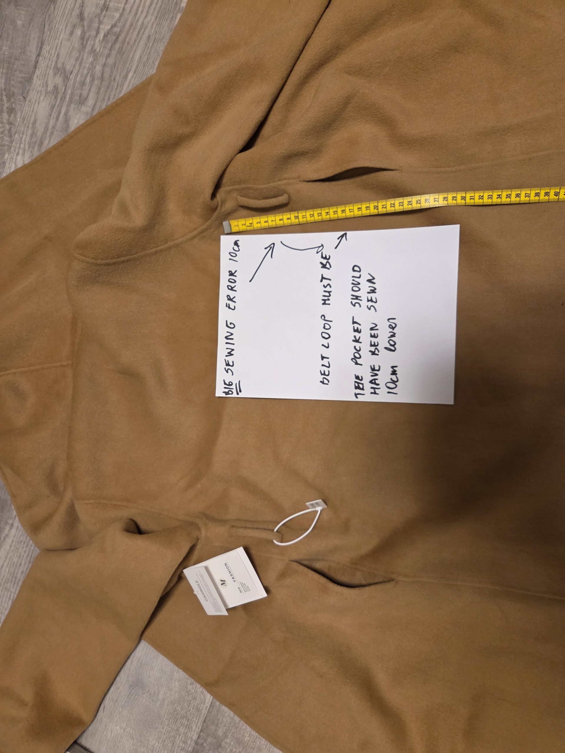 The jacket is sewn in such a way that the belt is positioned immediately below the armpits, and the pockets are 10 cm below the belt, making it nearly impossible to put a hand inside.