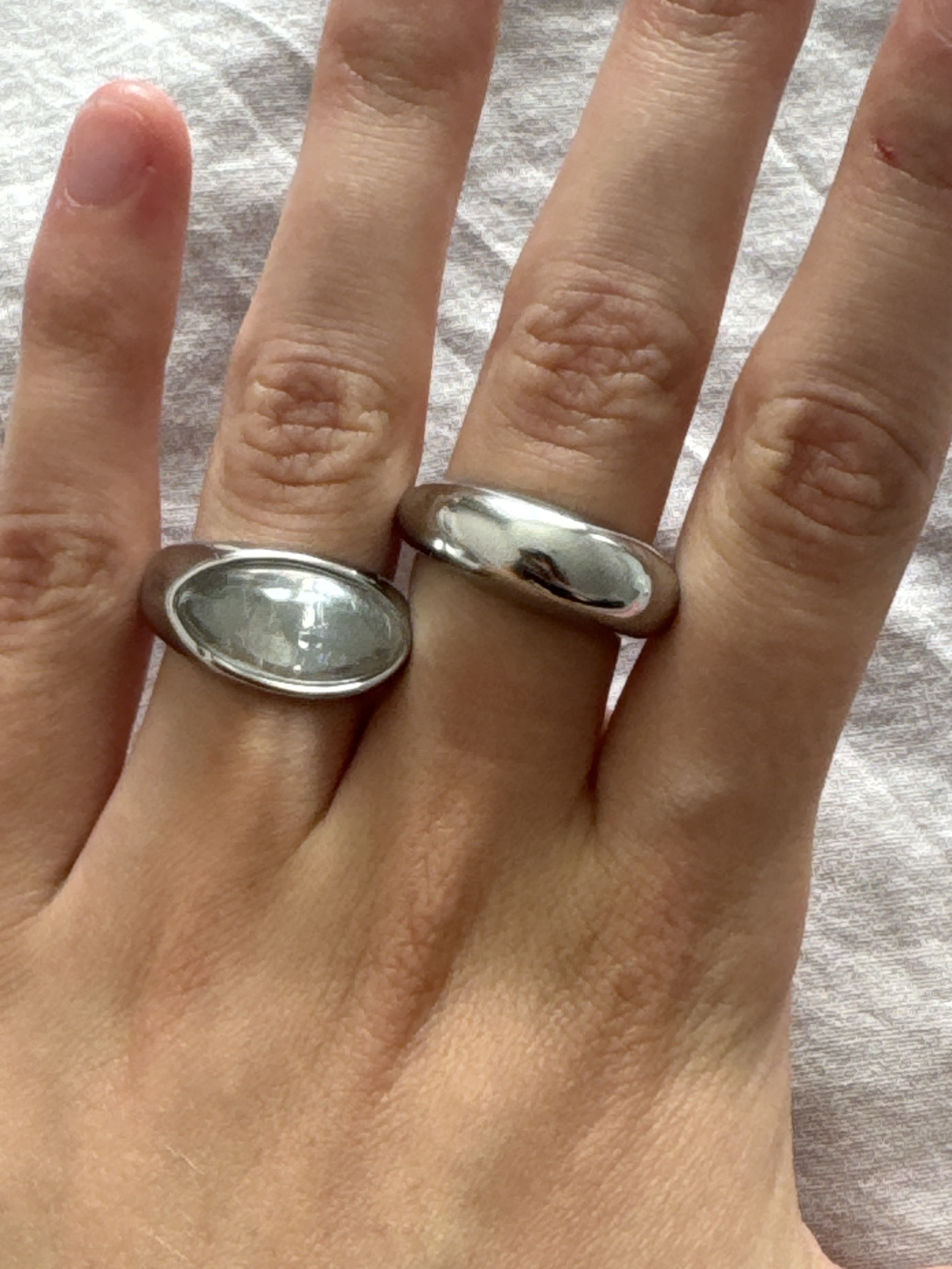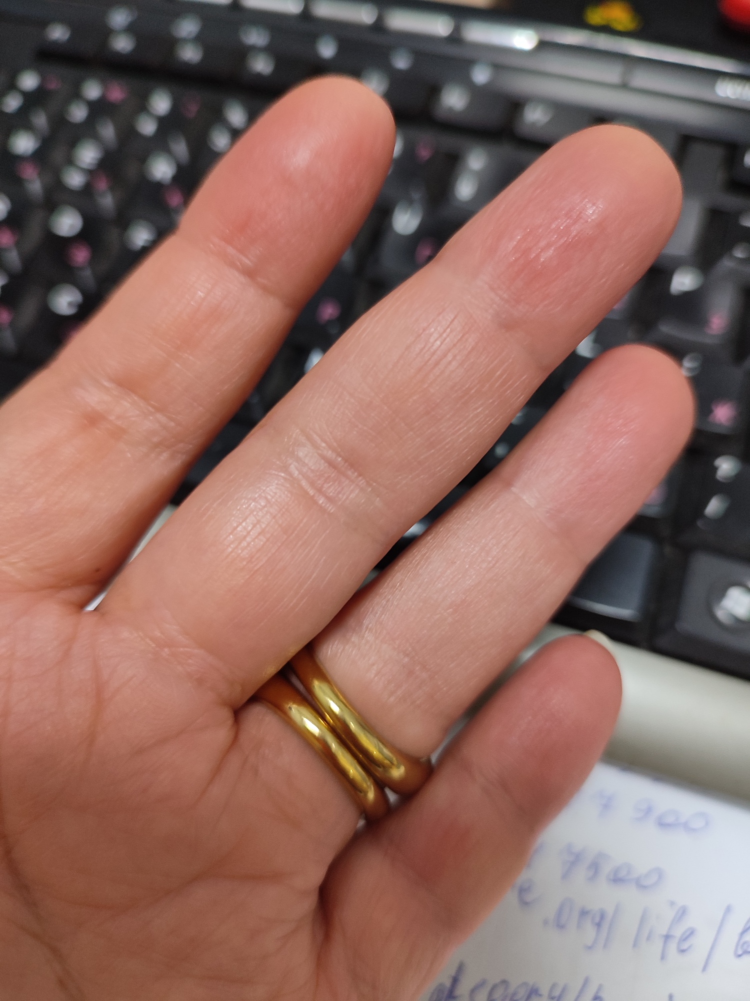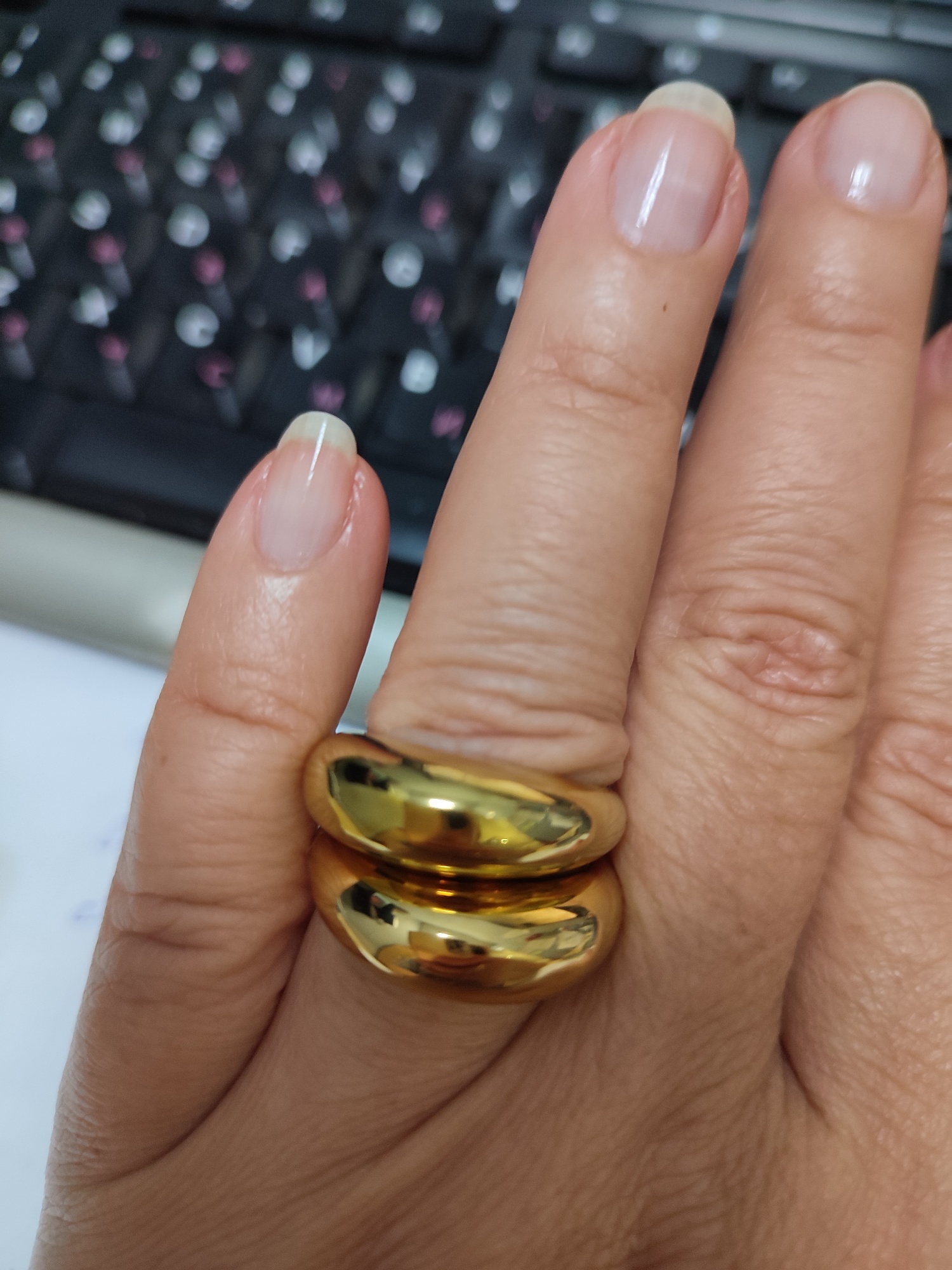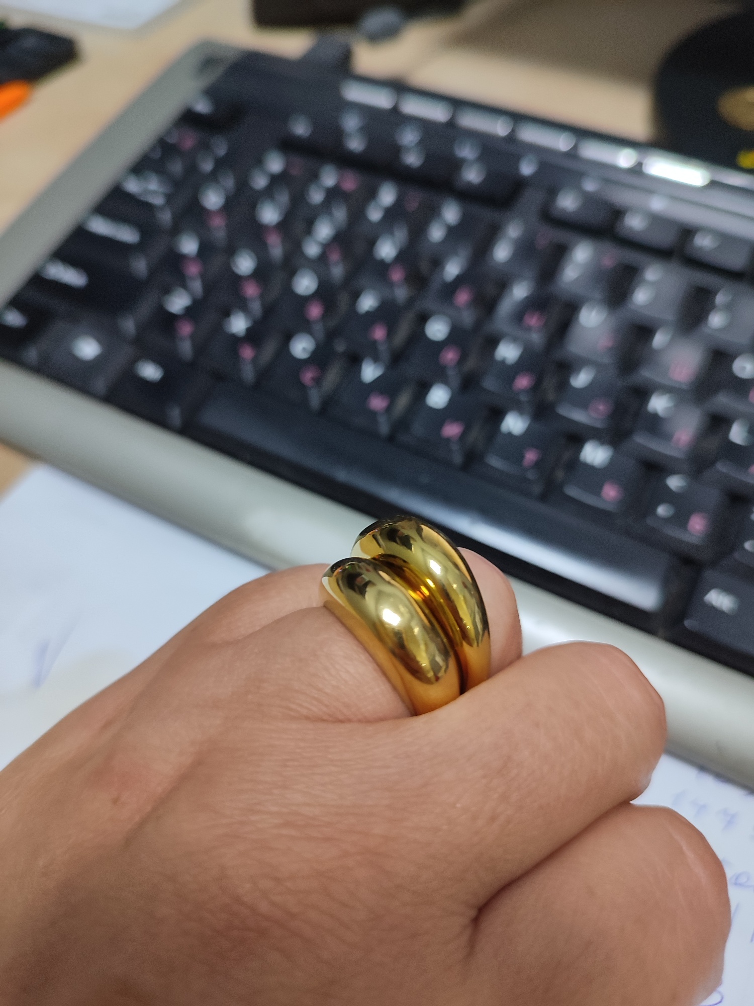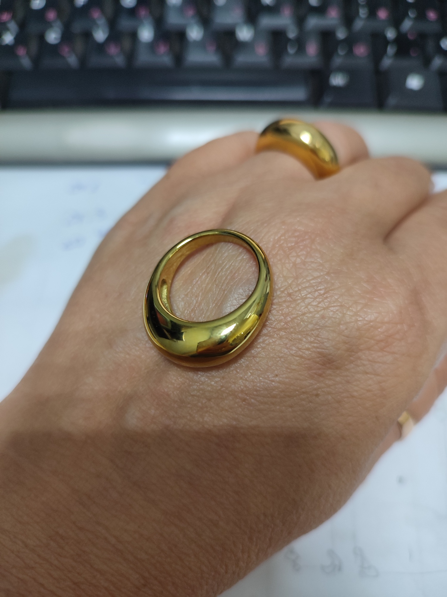 массивное, тяжёлое. сначала заказала одно, на пальце выглядит, как обручальное кольцо. заказала ещё одно. Качество хорошее. Цвет не облезает, кожу не красит. Спасибо.