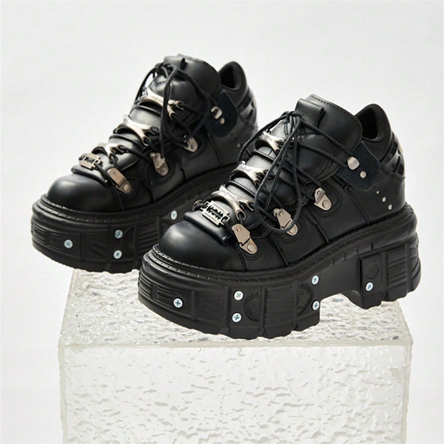 Punk Style Women Black Shoes Rock Metal Decor Lace-up Heel Height Platform Shoes Gothic Man Sneakers Women Ankle Boots 2025 New