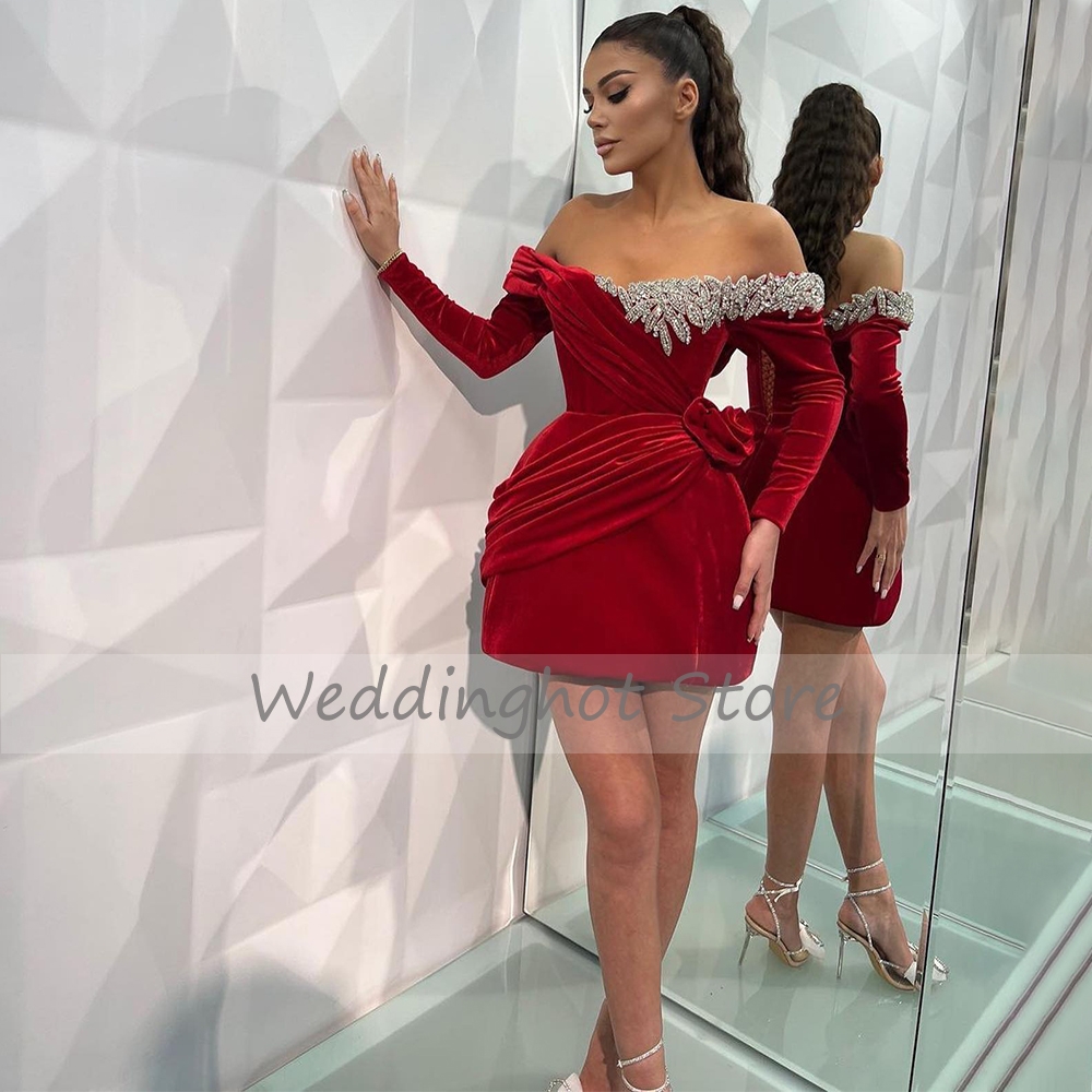 Red Velvet Cocktail Dress Mini Off the Shoulder Long Sleeves Gown Short Sparkle Crystal A Line Sexy Birthday Party