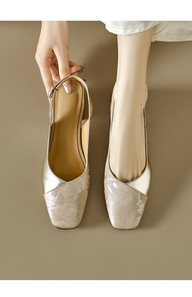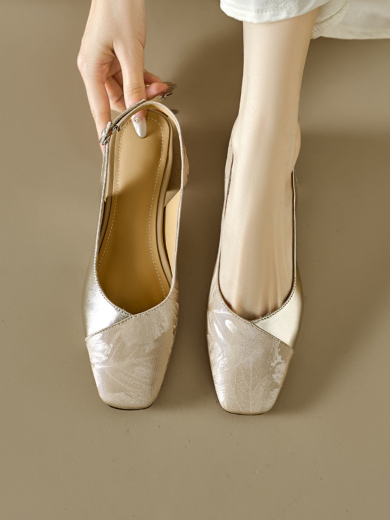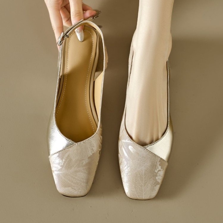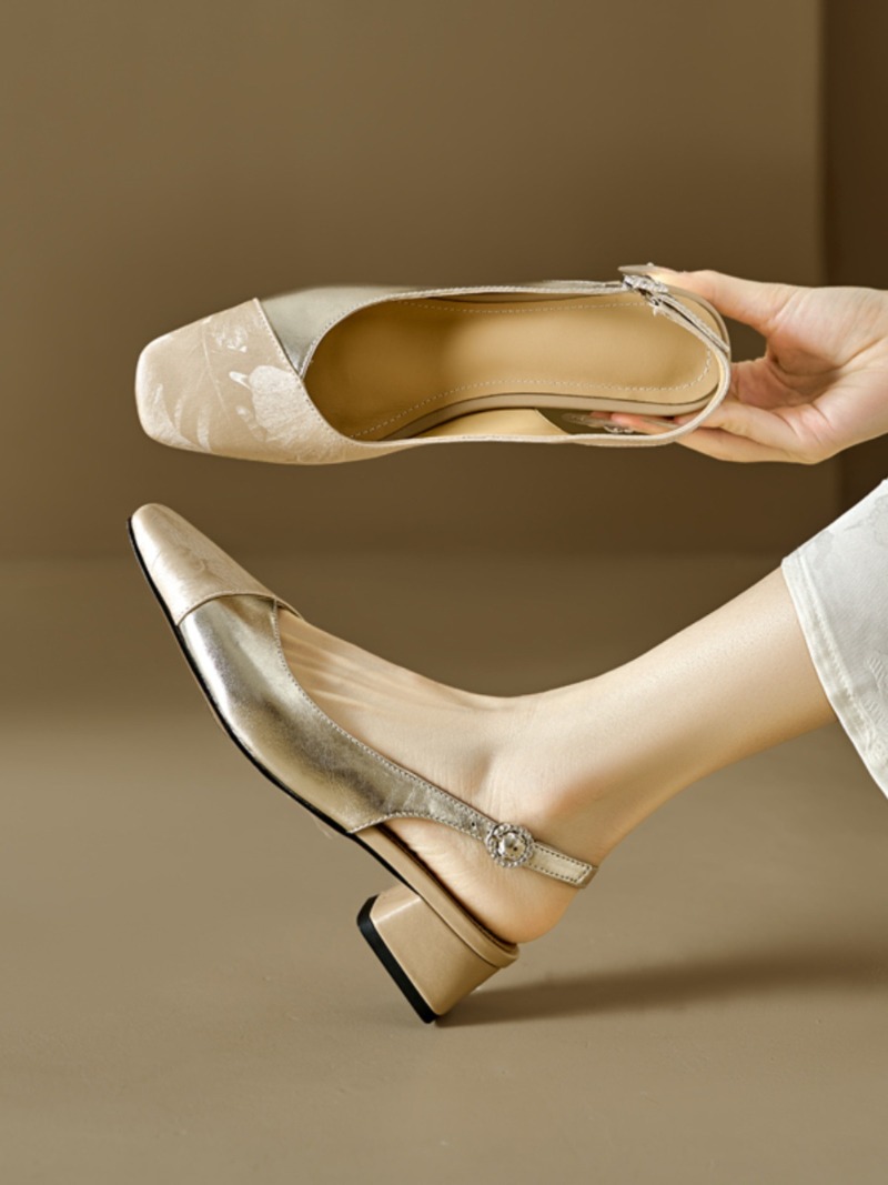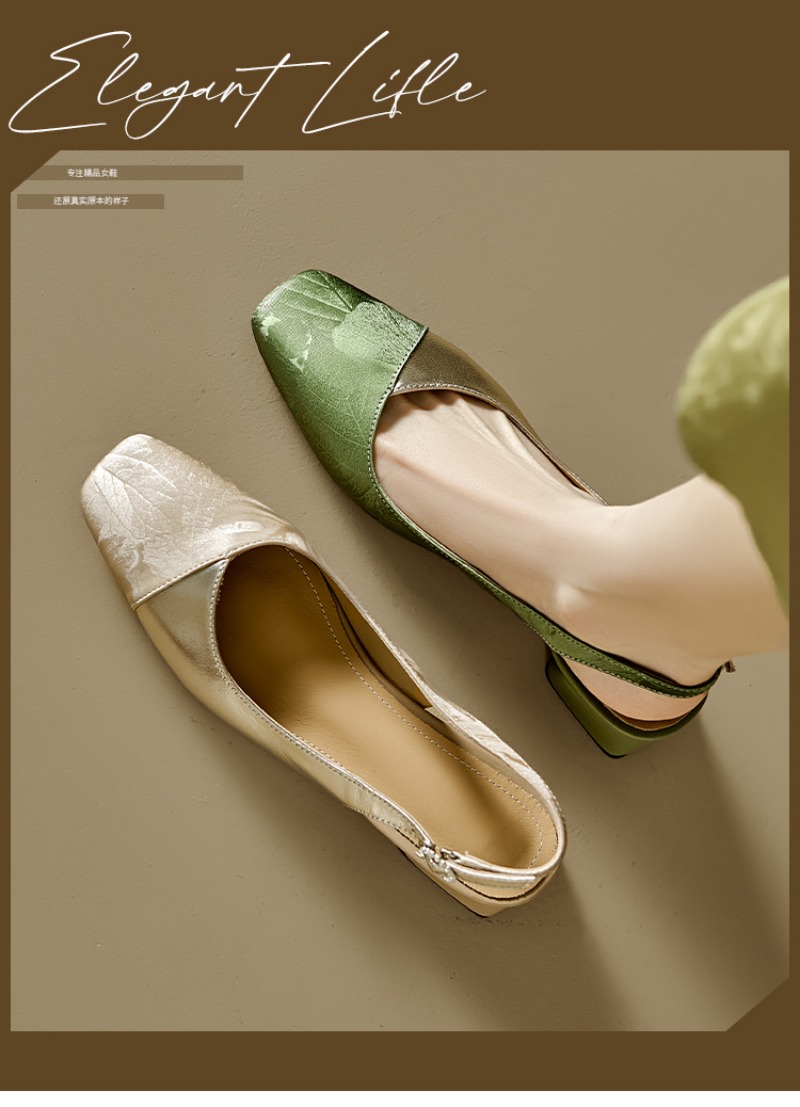 Retro Baotou Slingback Sandals for Women’s Summer New Square Headed Colors Leather Pacthwork Buckle Strap Middle Thick Heel Shoe