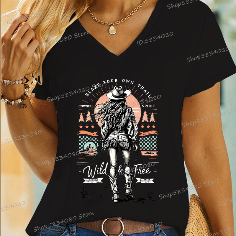Retro Cowgirl Wild and Free Printed T-shirt Vintage Desert Cowgirl Shirt Design V-neck Casual Tops Western Cowgirl Spirit Tshirt