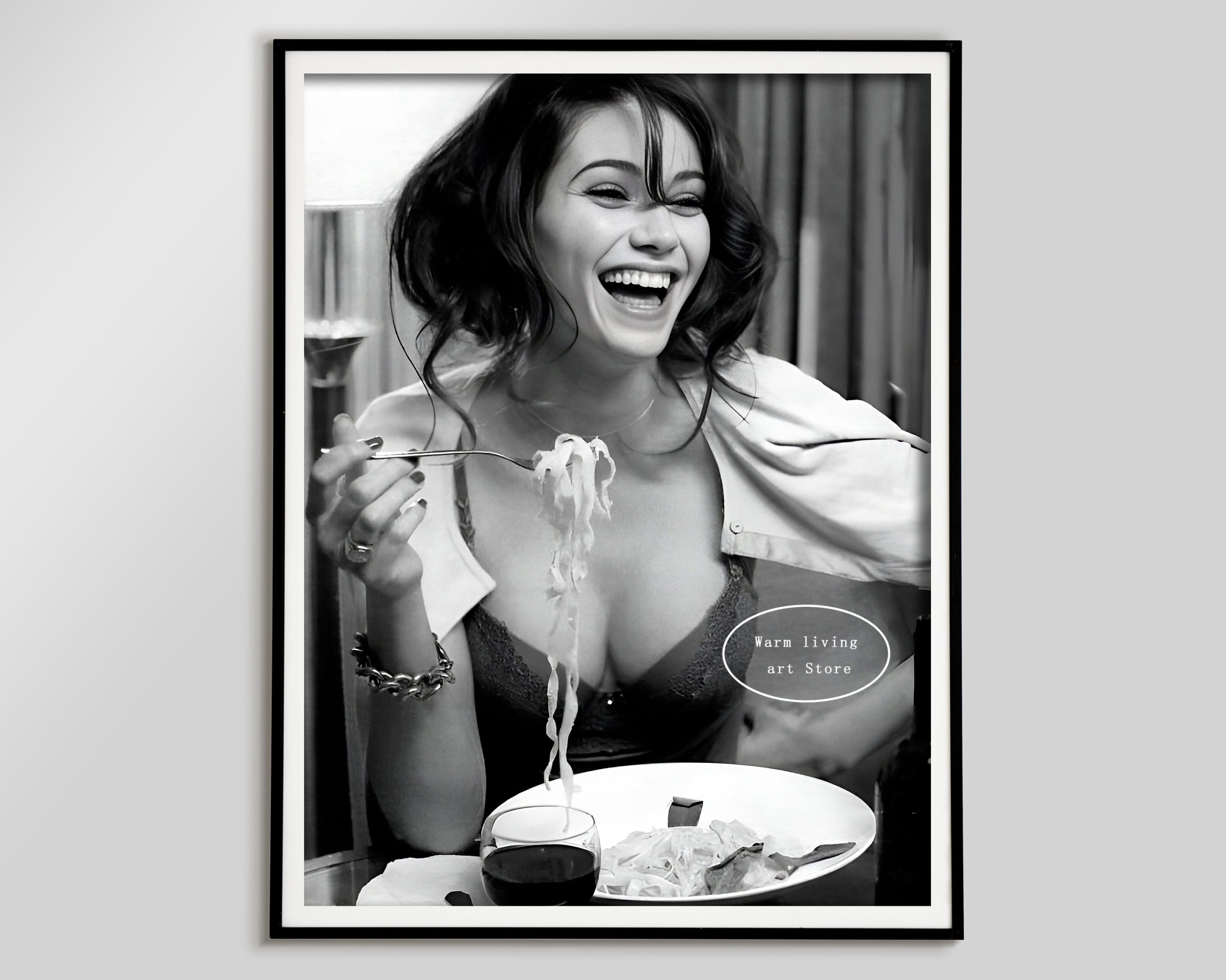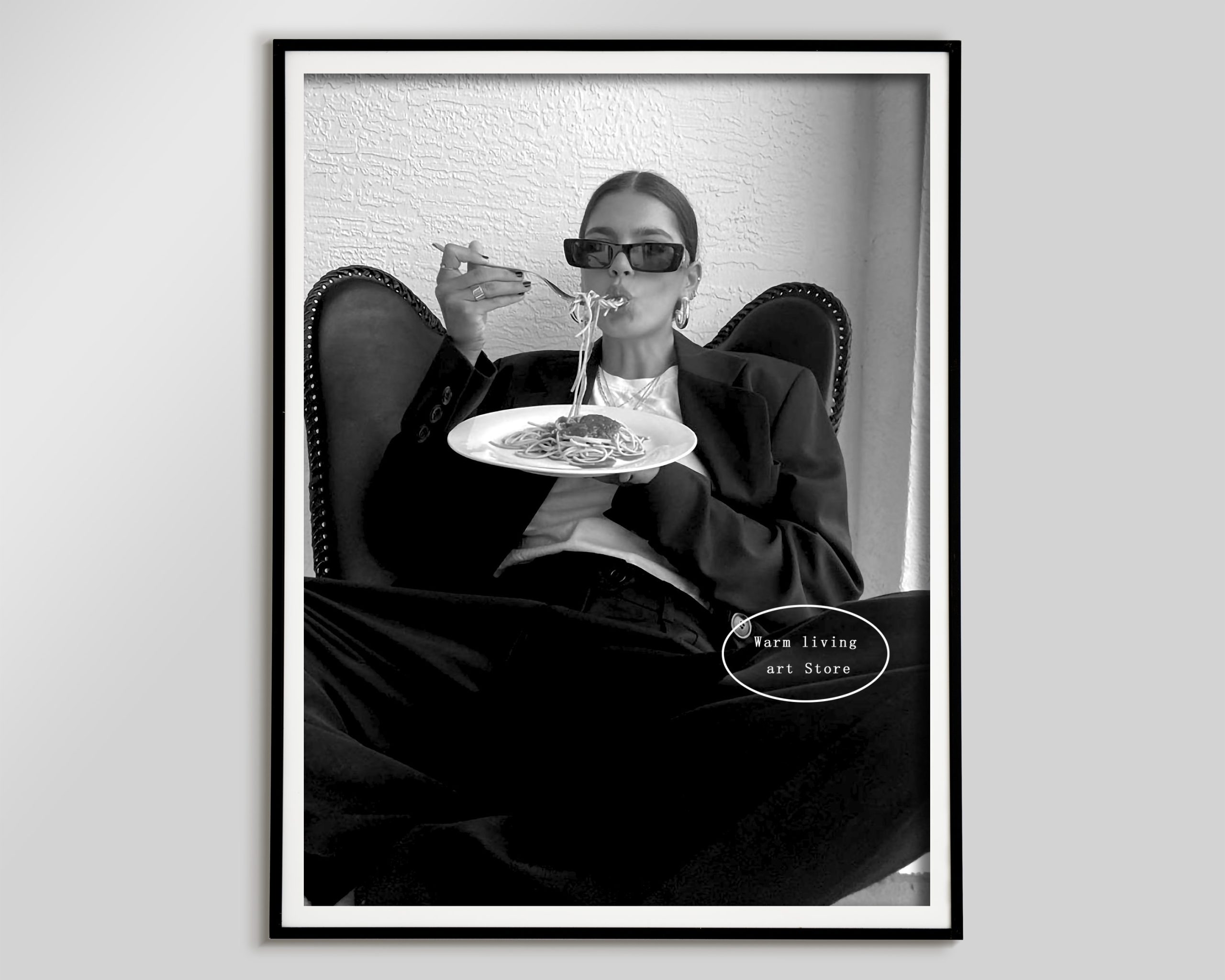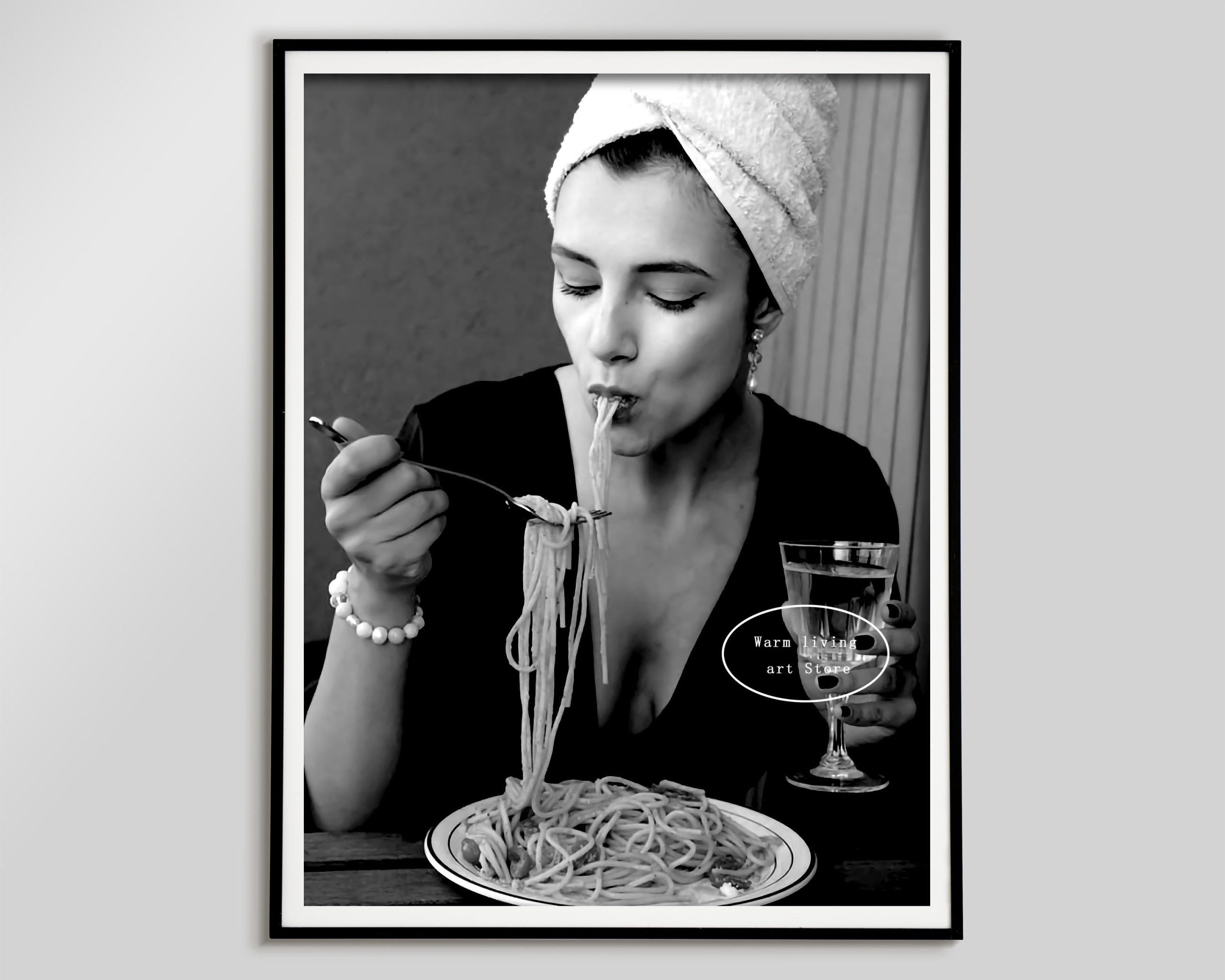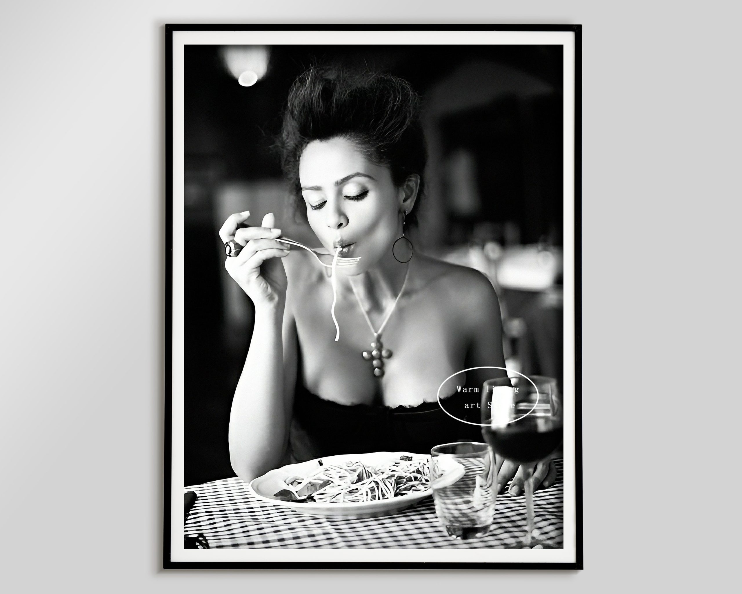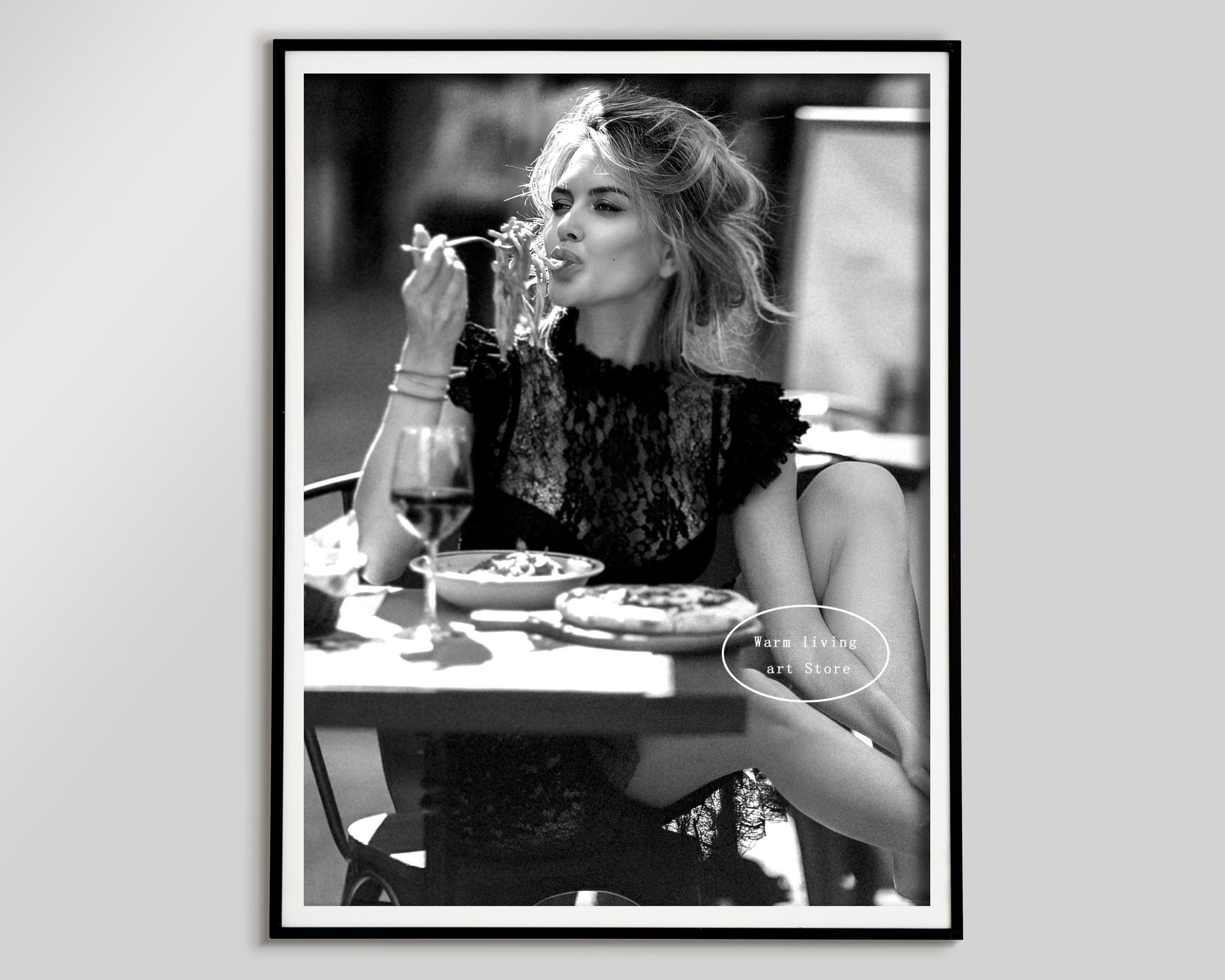 Retro Woman Eating Pasta in Paris Drinking Coffee Cocktail Black and White Canvas Painting Print Wall Art Room Kitchen Decor
