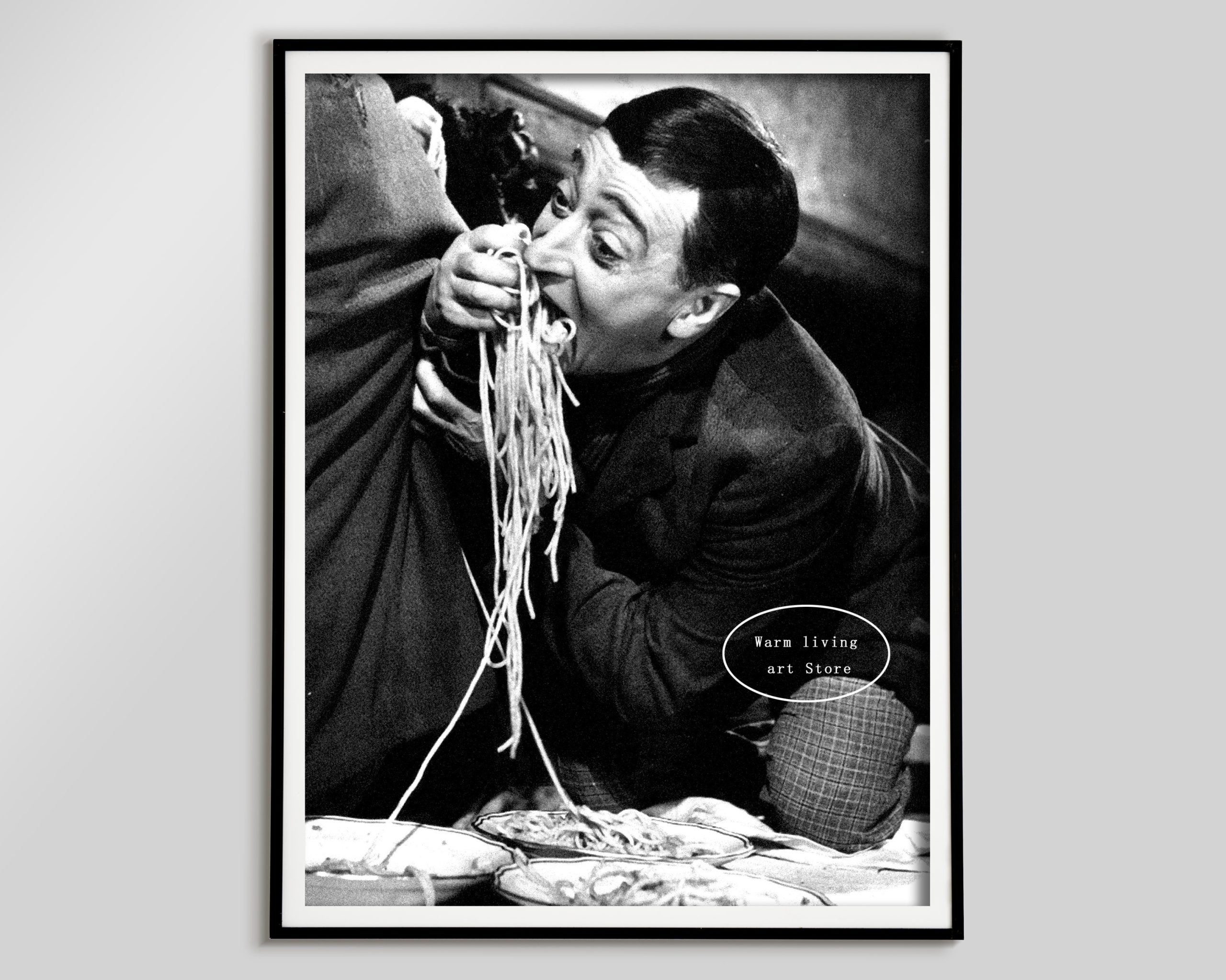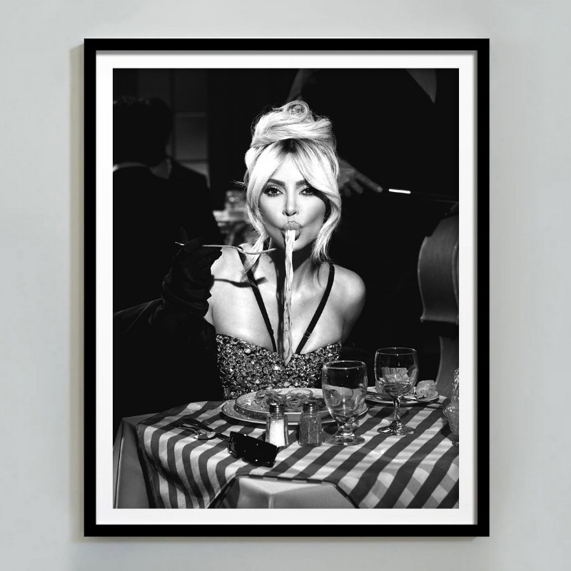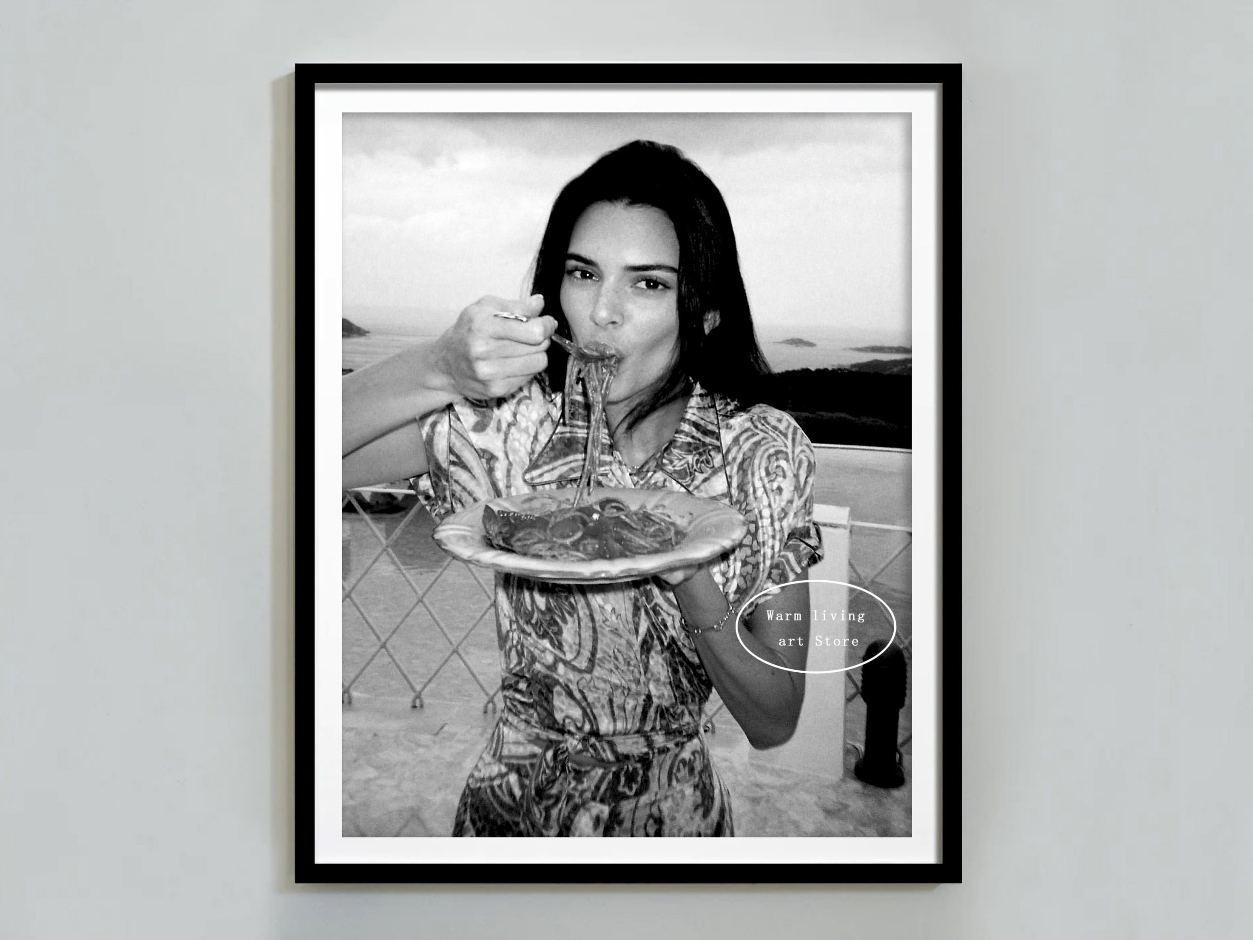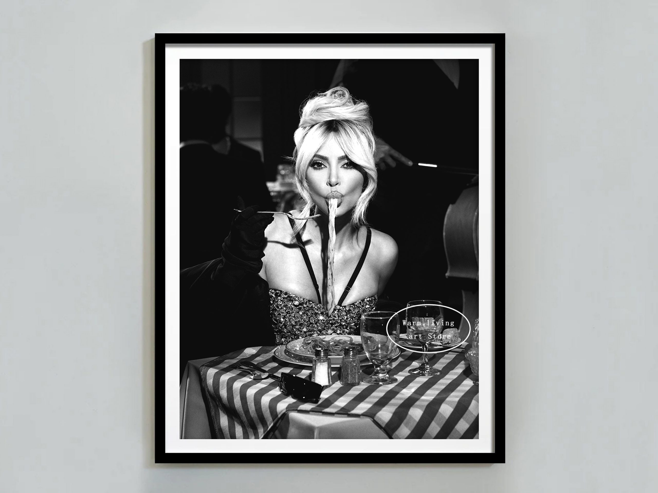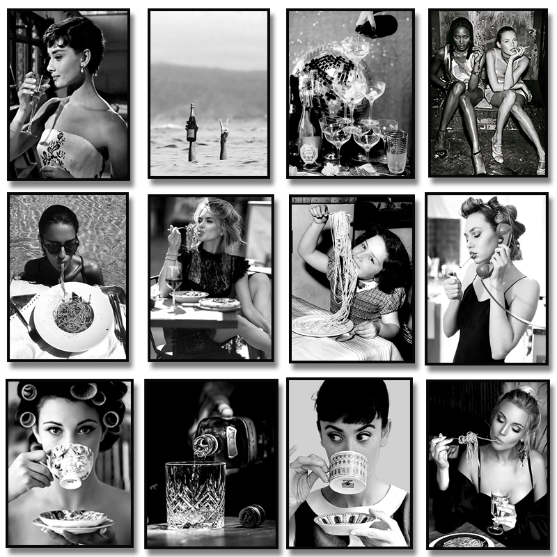 Retro Woman Eating Pasta in Paris Drinking Coffee Cocktail Black and White Canvas Painting Print Wall Art Room Kitchen Decor