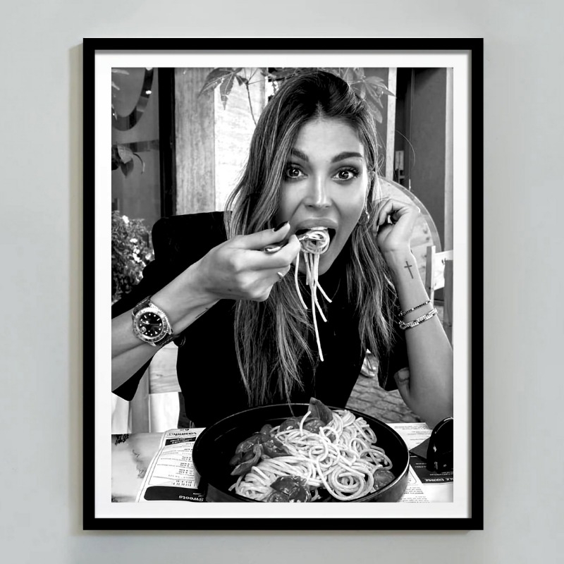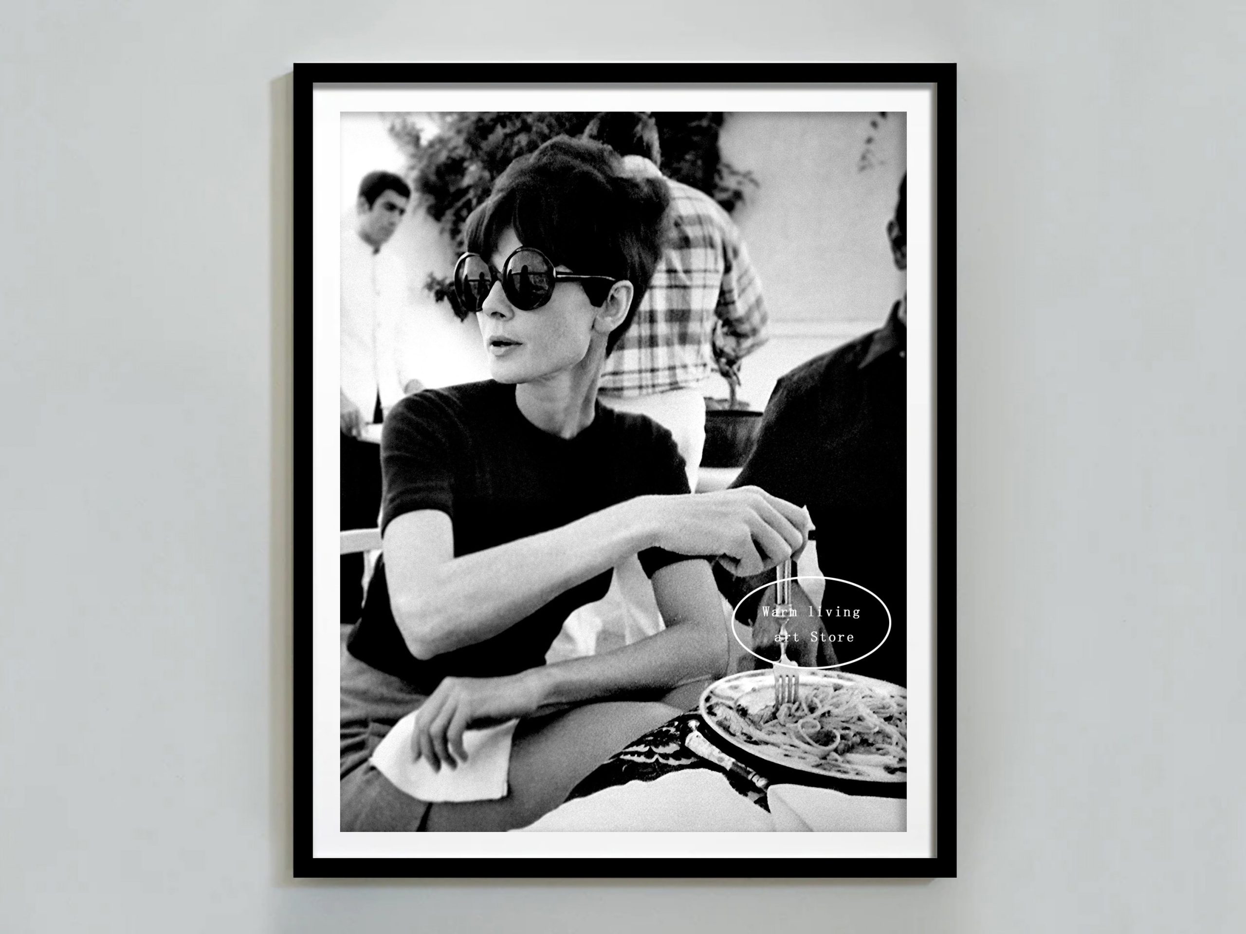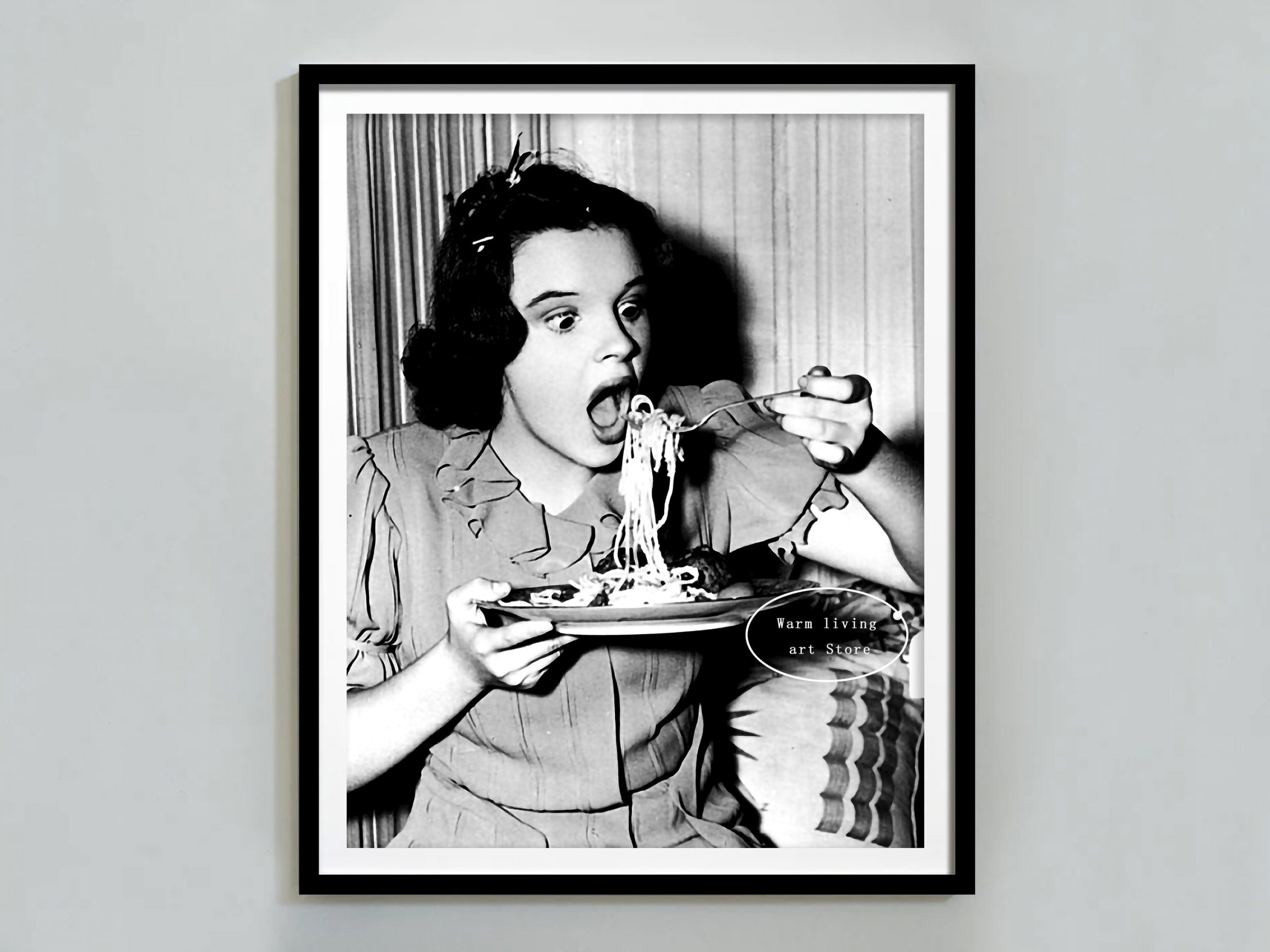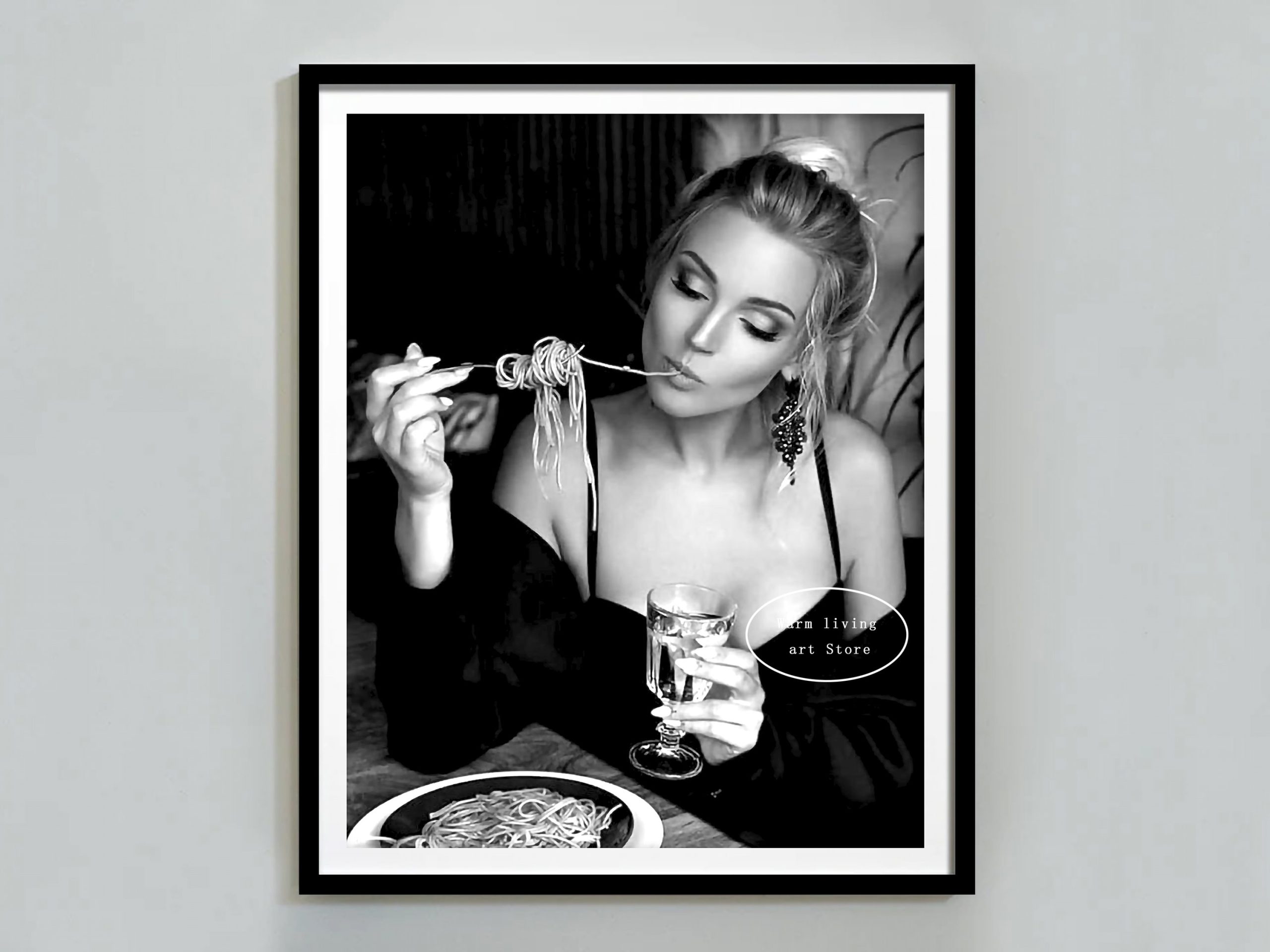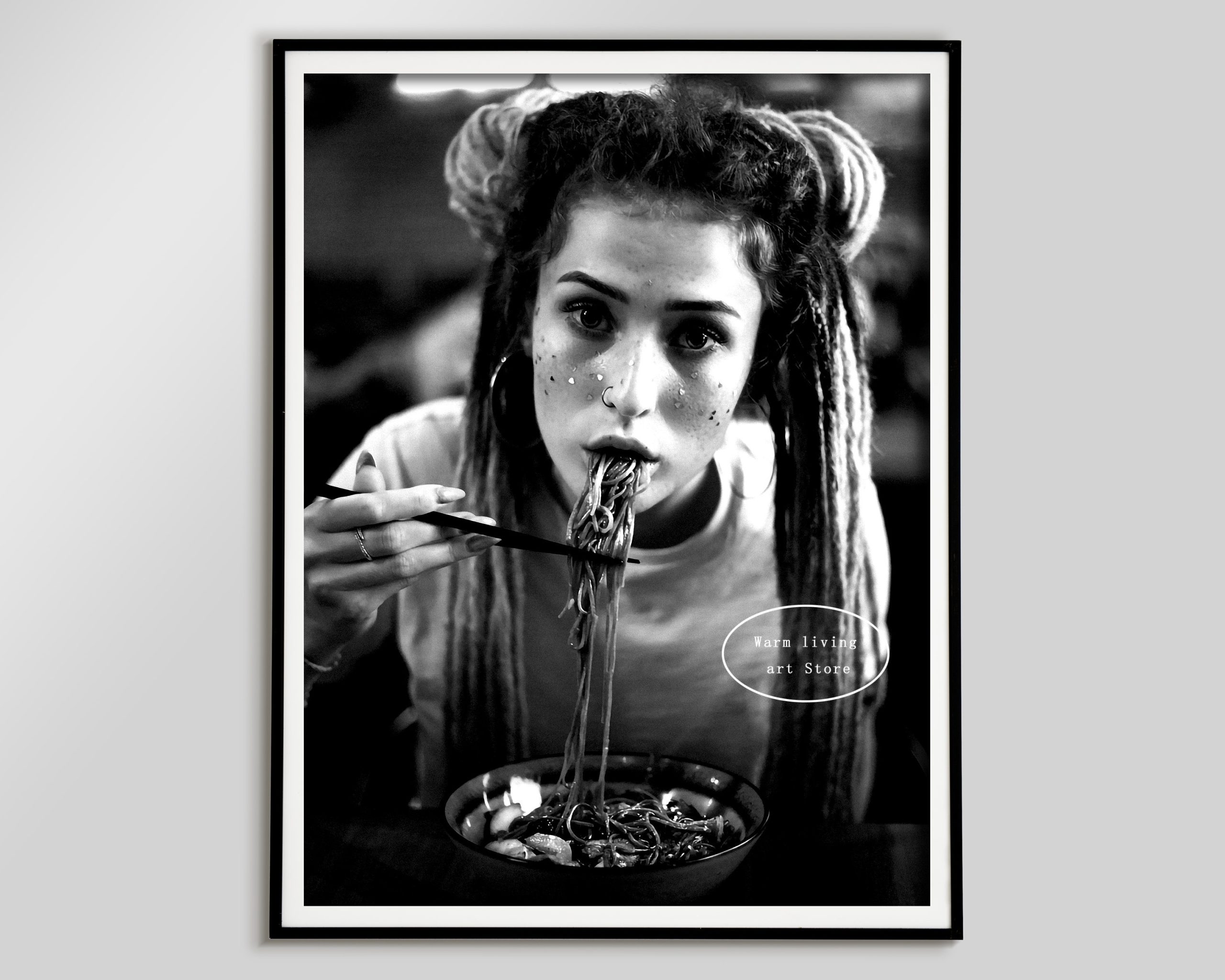 Retro Woman Eating Pasta in Paris Drinking Coffee Cocktail Black and White Canvas Painting Print Wall Art Room Kitchen Decor