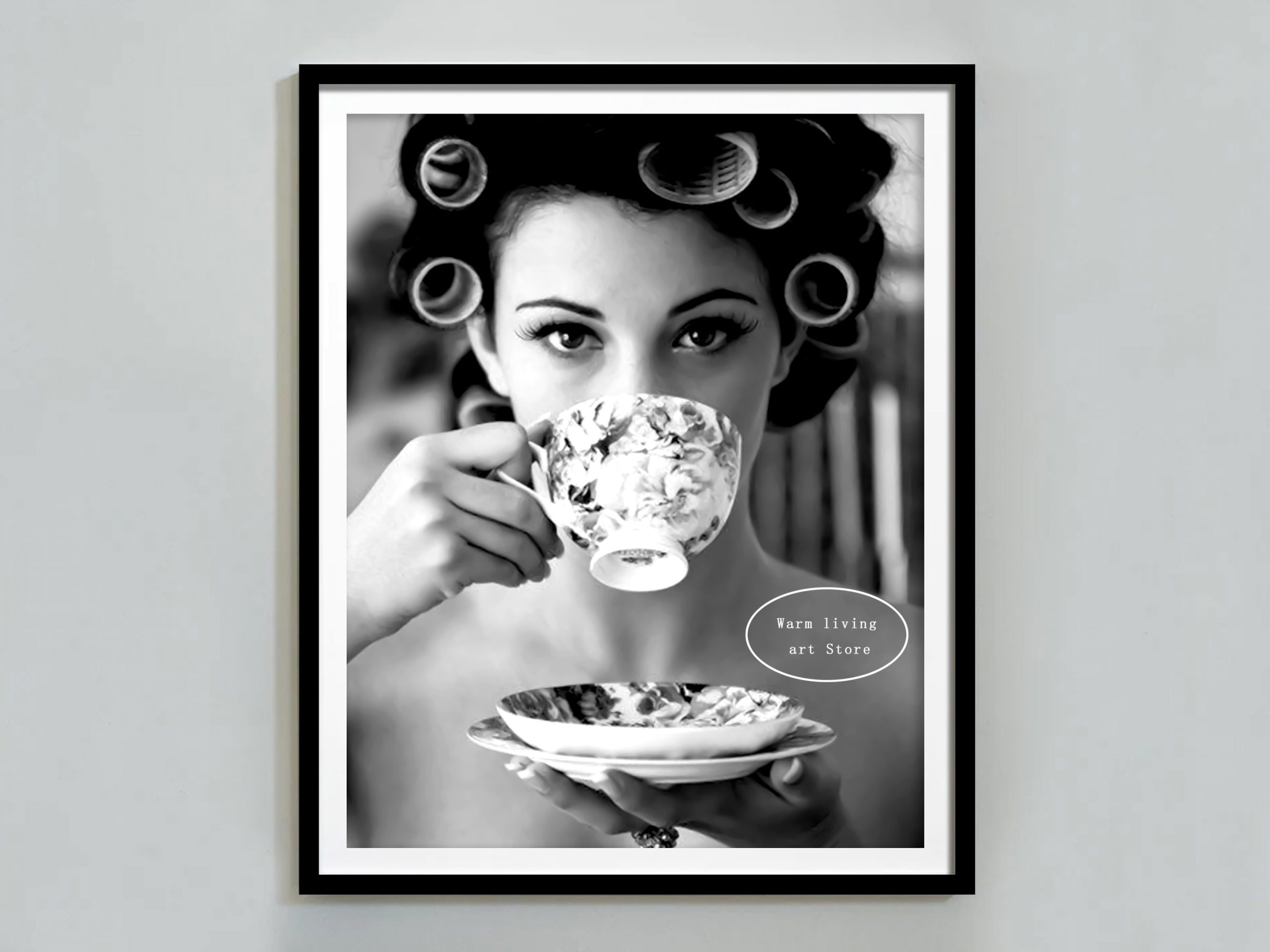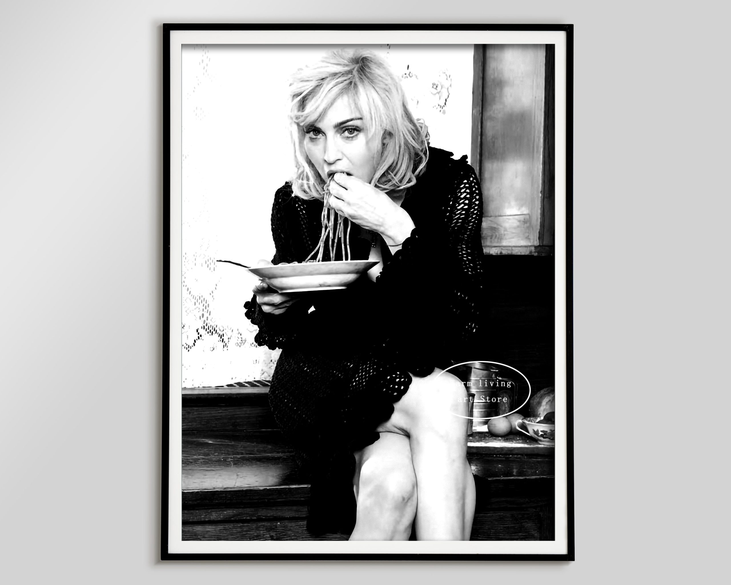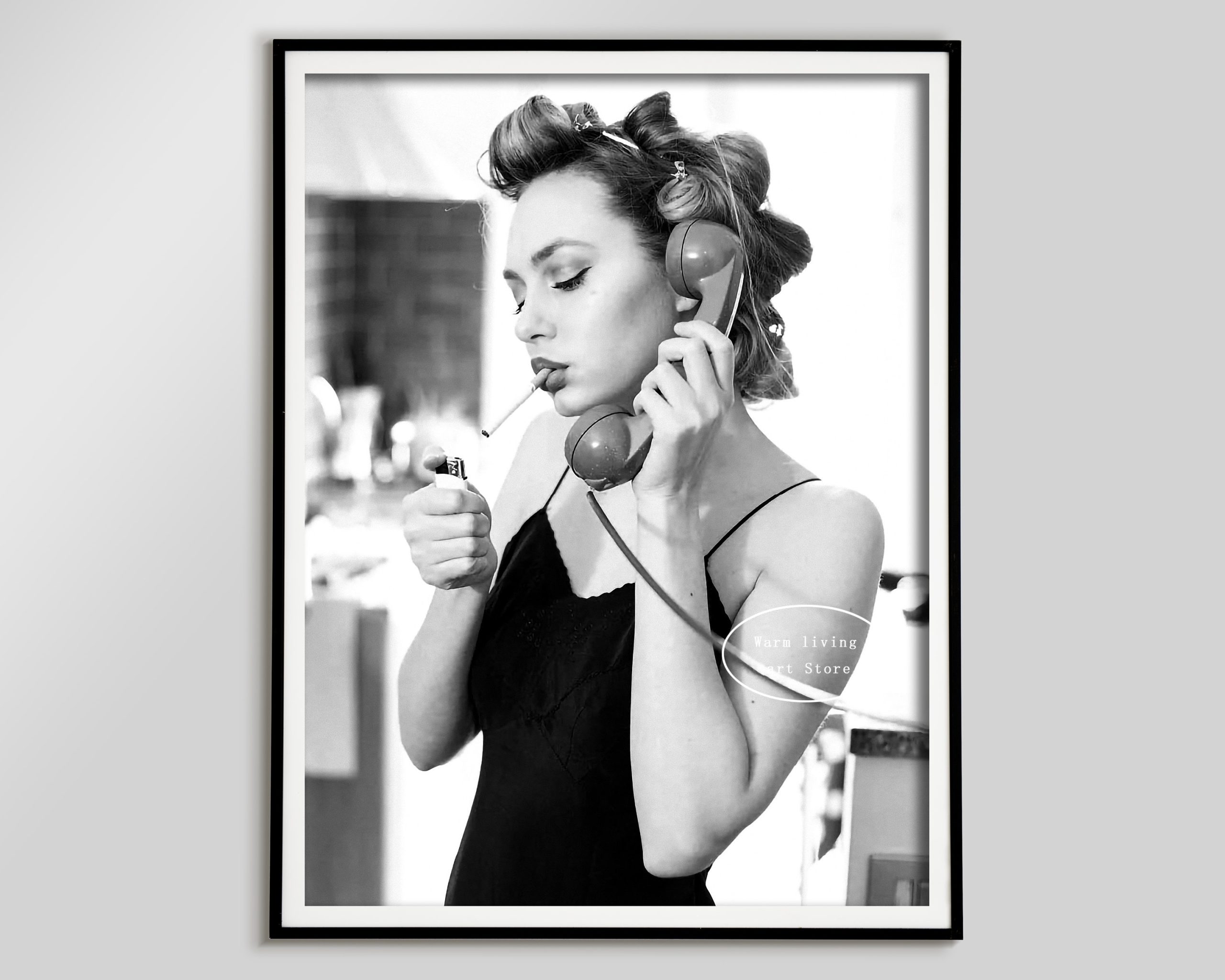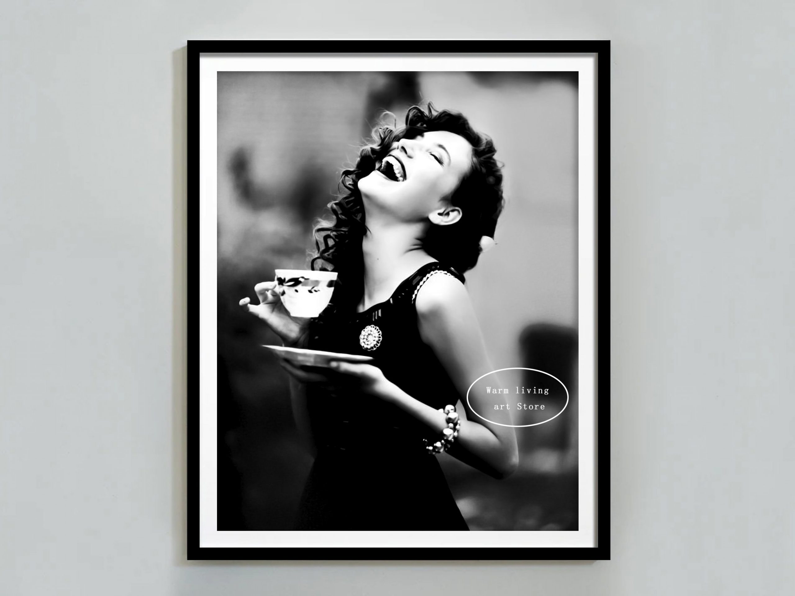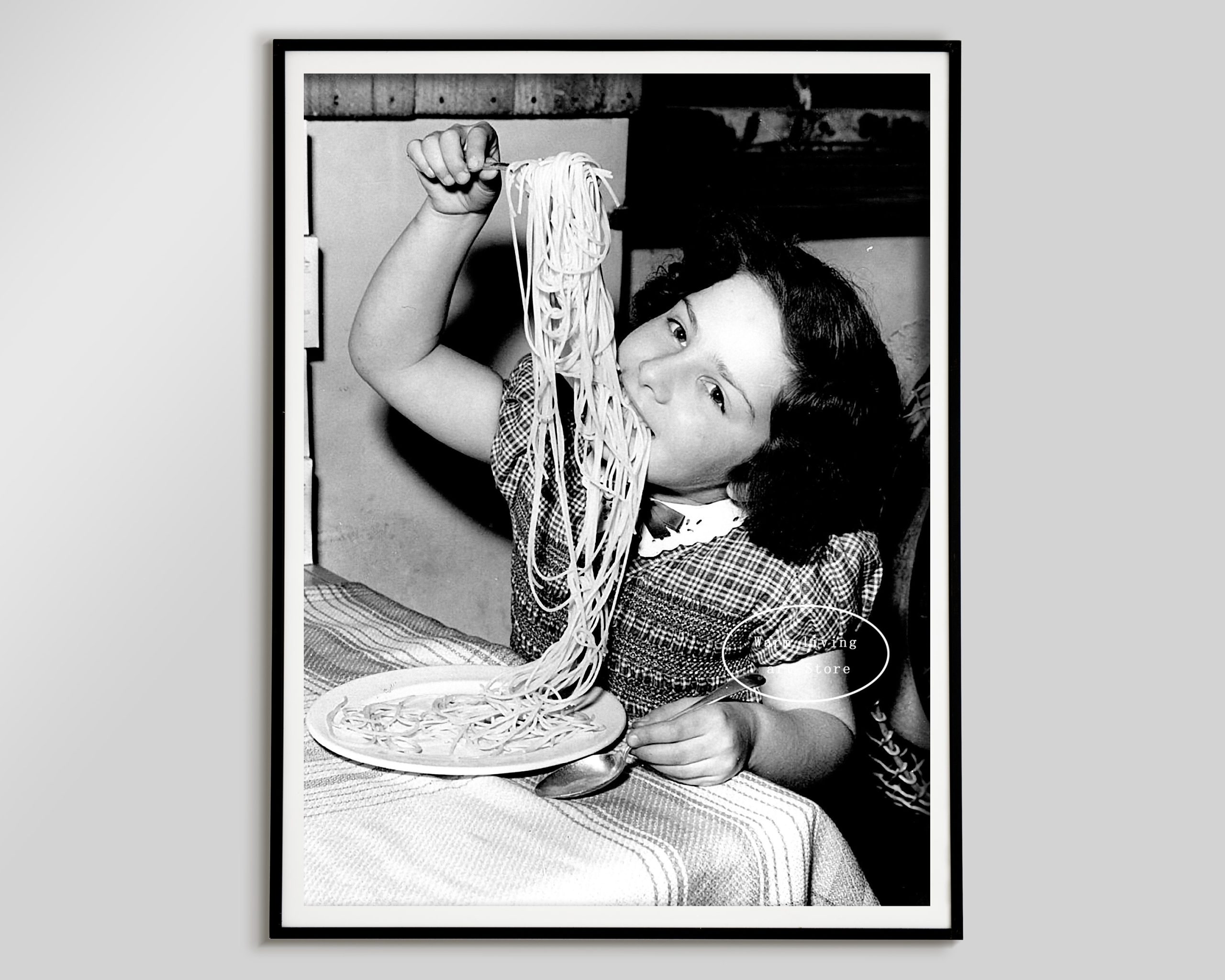 Retro Woman Eating Pasta in Paris Drinking Coffee Cocktail Black and White Canvas Painting Print Wall Art Room Kitchen Decor