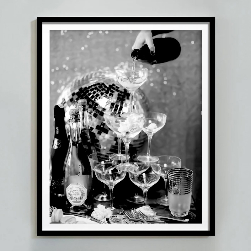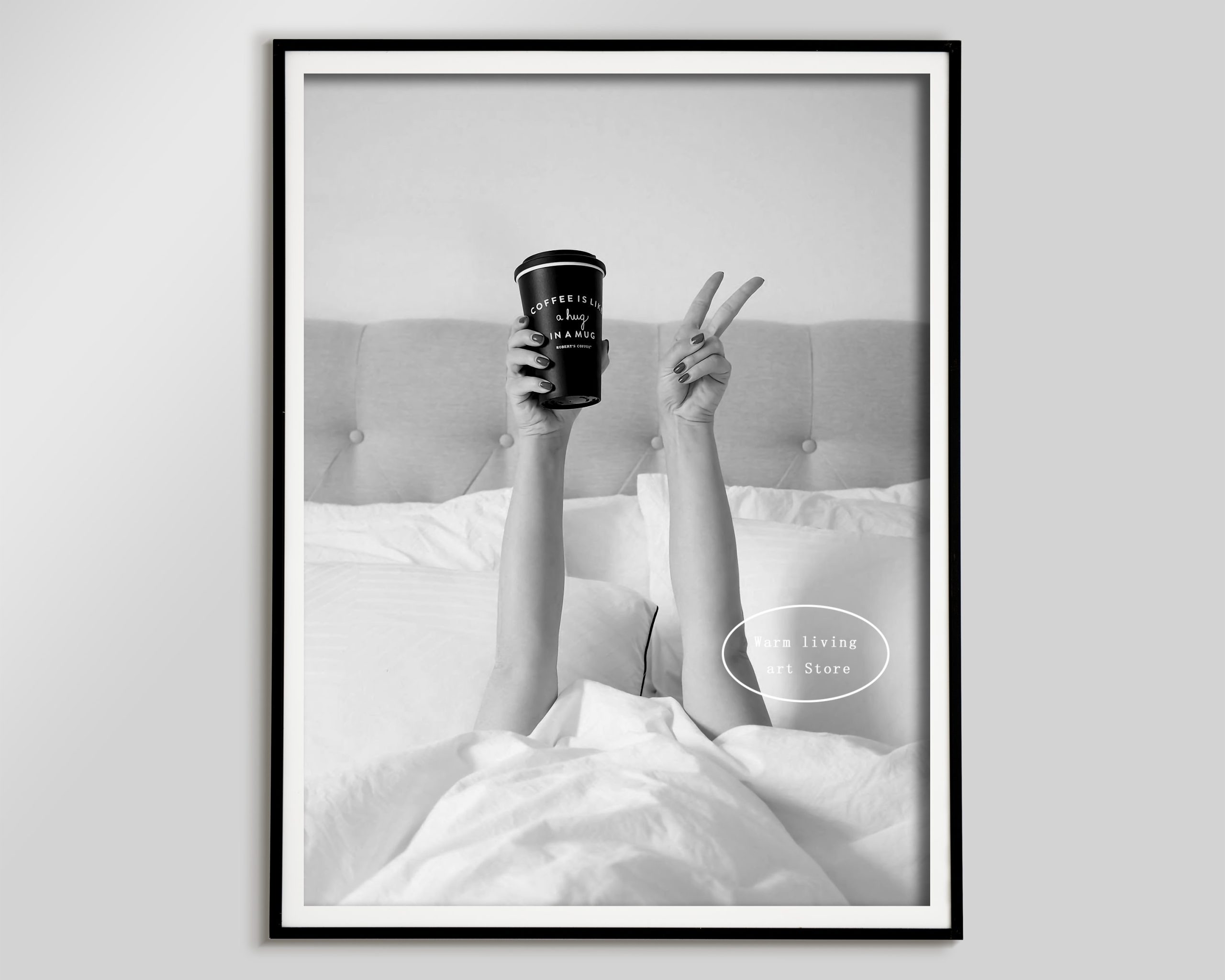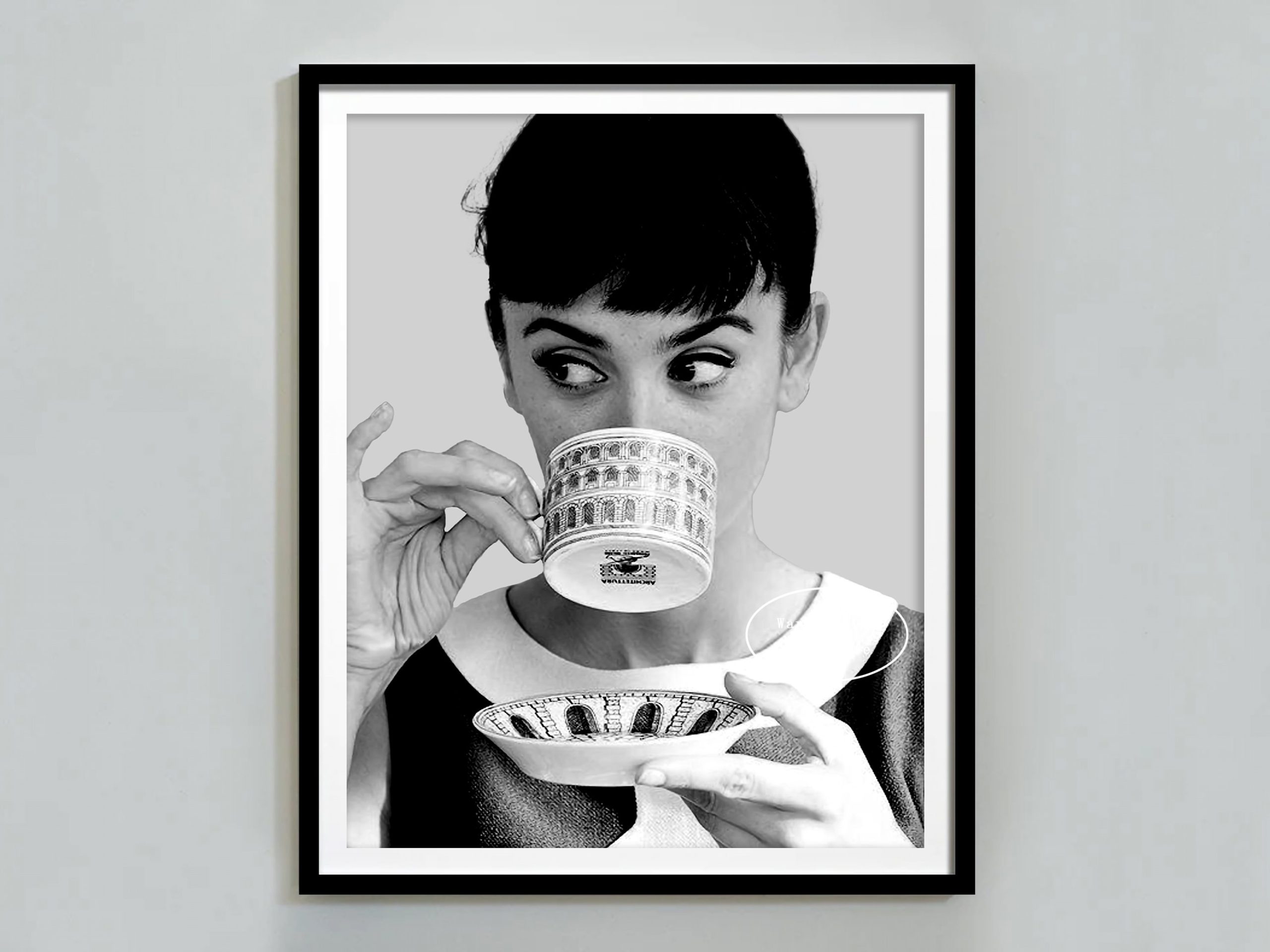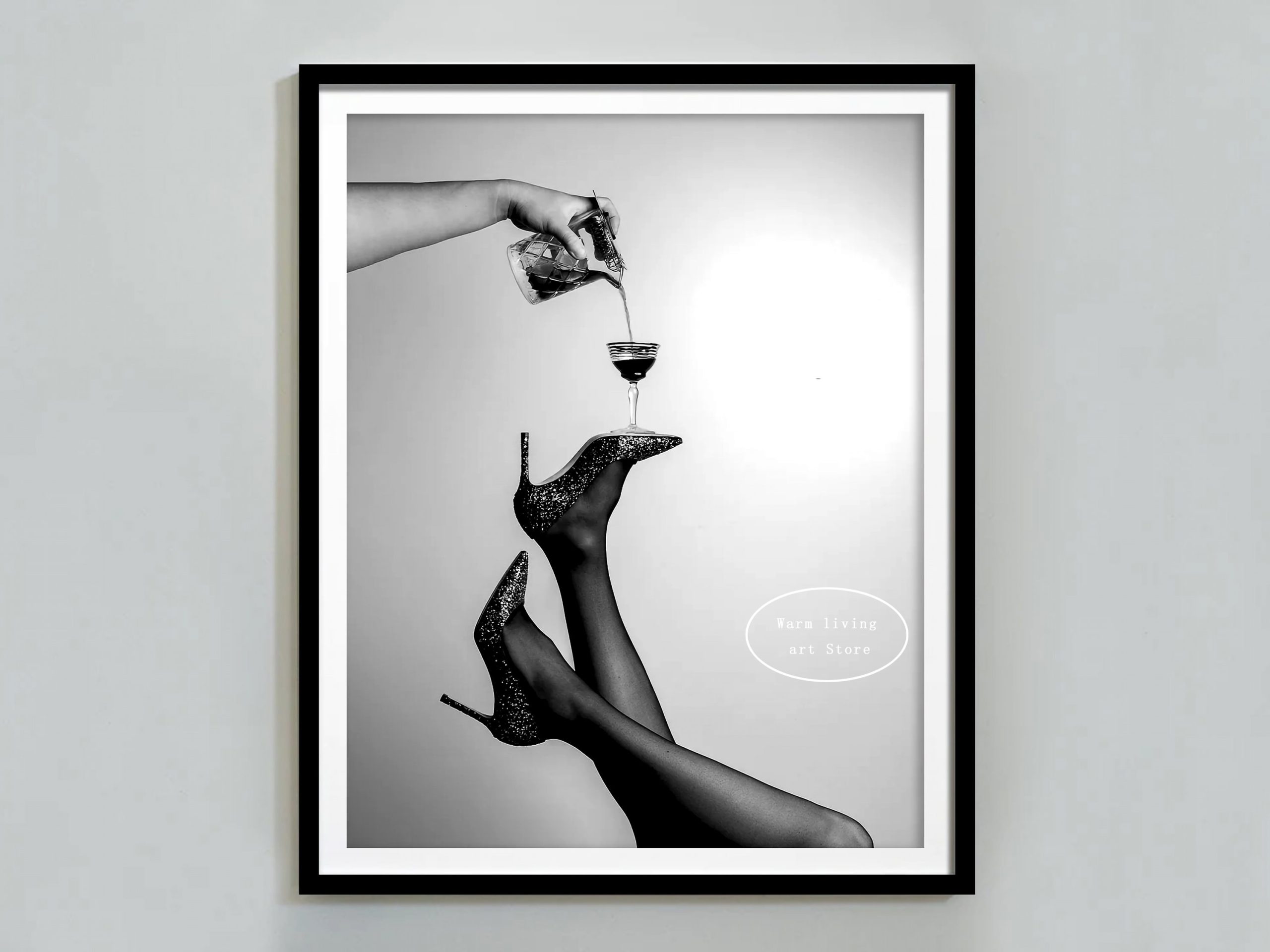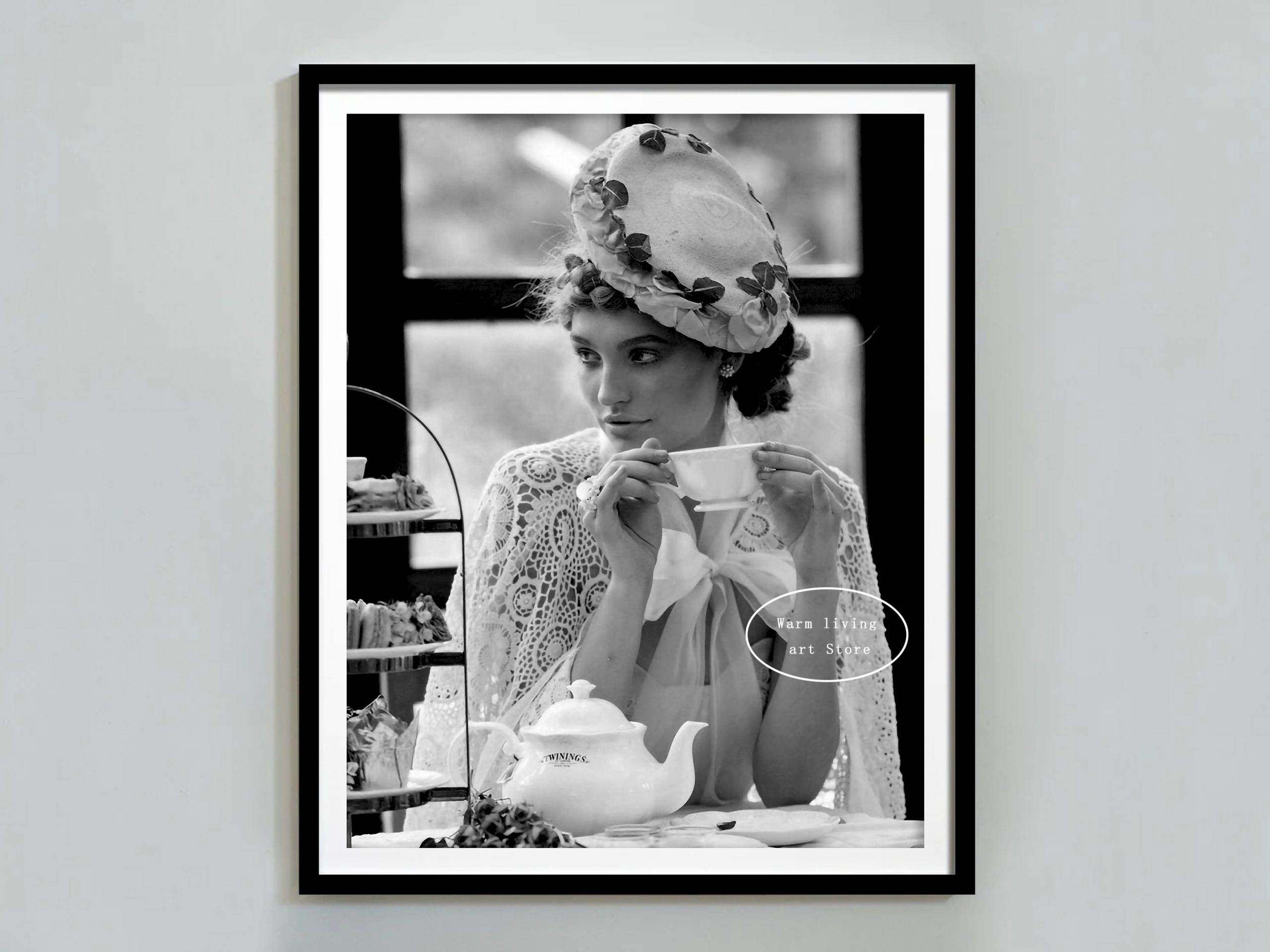 Retro Woman Eating Pasta in Paris Drinking Coffee Cocktail Black and White Canvas Painting Print Wall Art Room Kitchen Decor