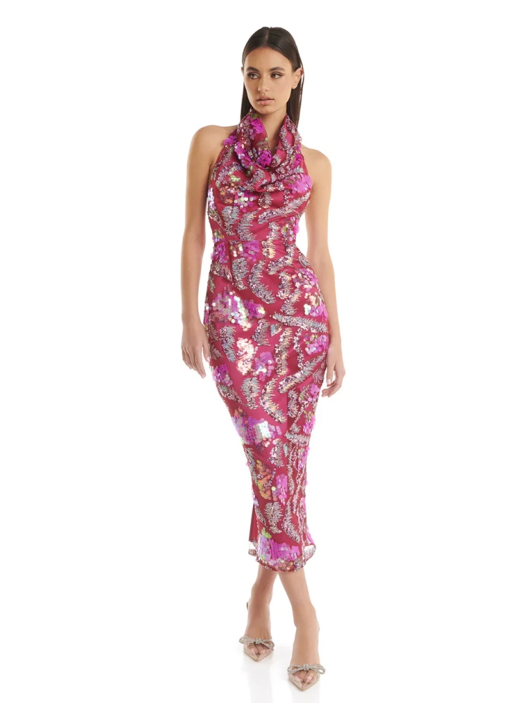 Sexy Halter Neck Luxury Sequins Midi Dress Women Sleeveless Backless Bright Sequined Slim Dresses Evening Party Cocktail Gowns