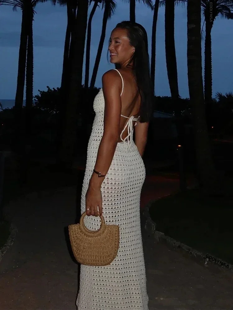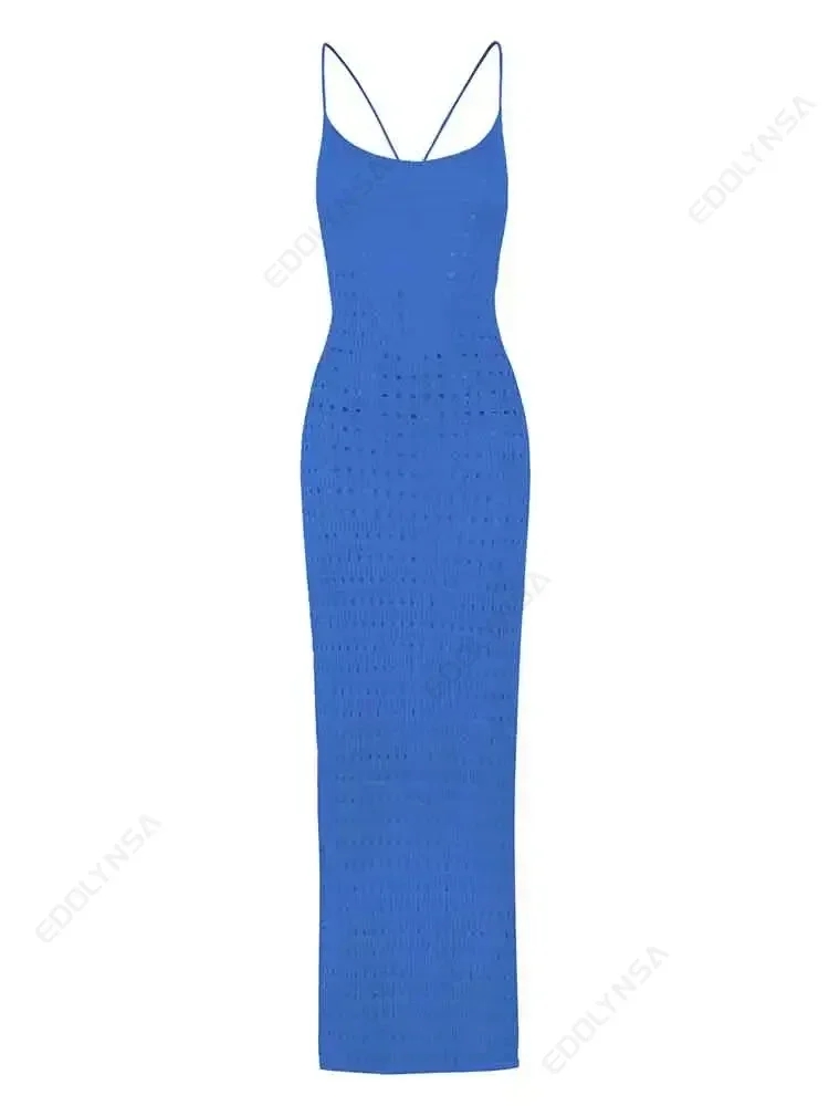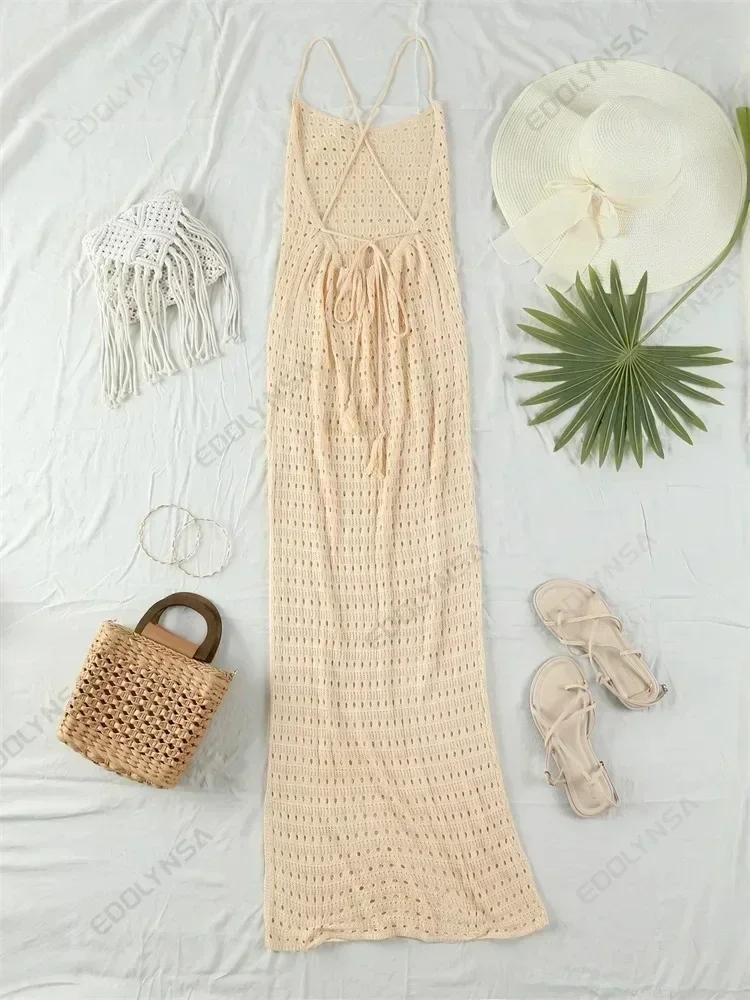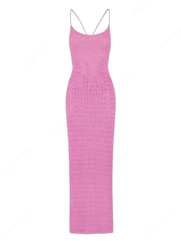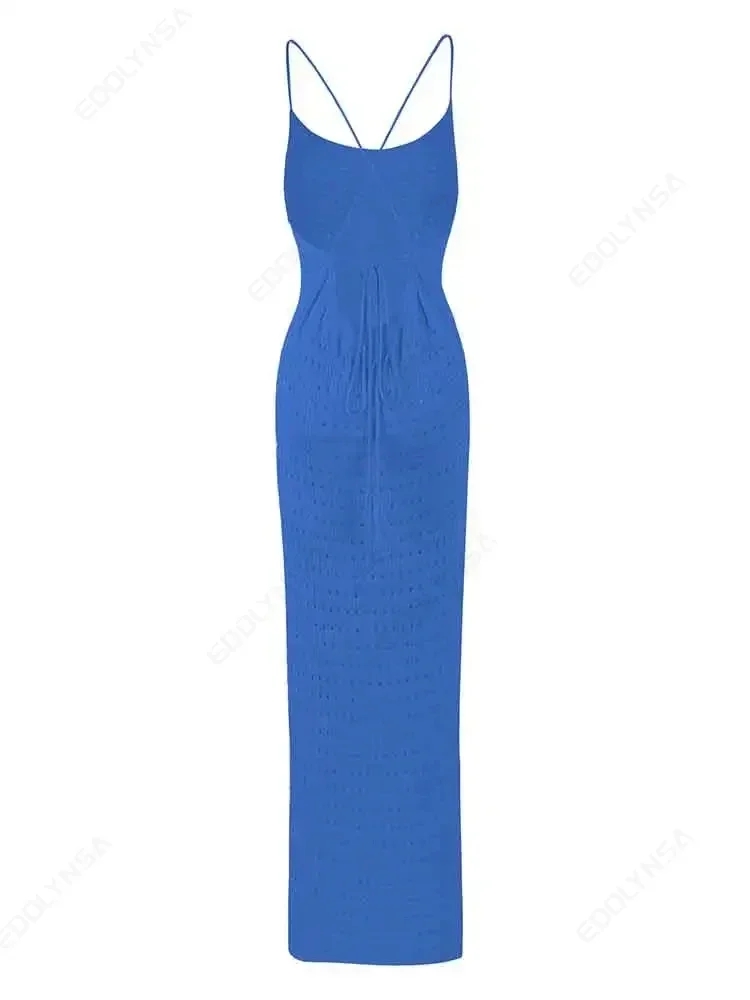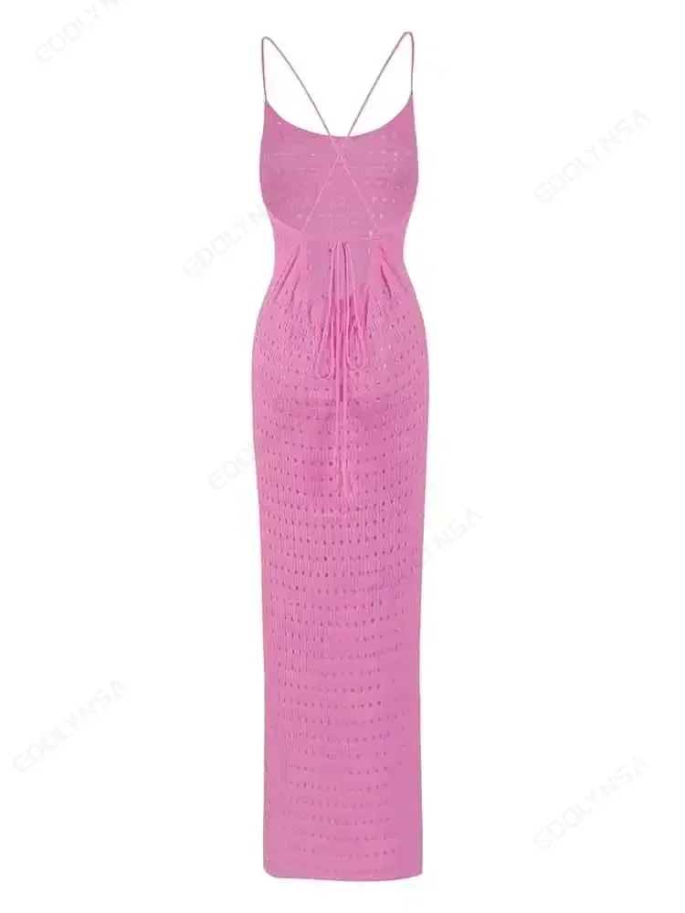 Sexy Knit Cut Out Tassel Spaghetti Strap Bodycon Beach Maxi Dress Summer Women’s Holiday Club Party Outfit Swimsuit Cover Up K10