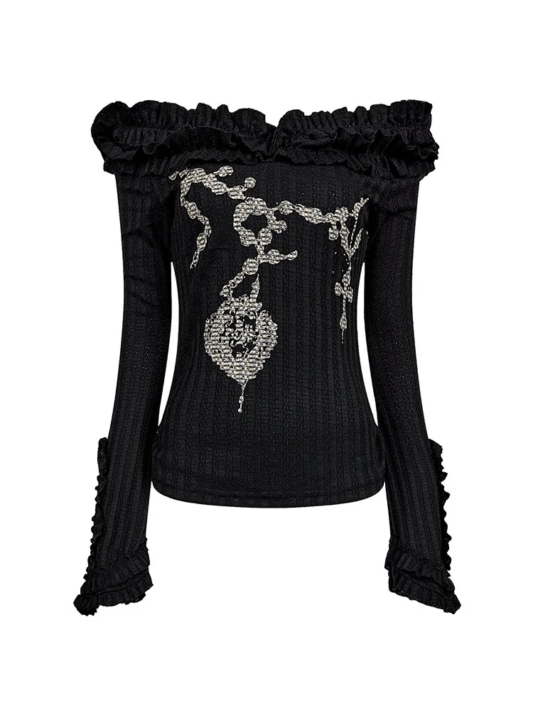 Sexy Punk Outfits 2 Piece Set Slash Neck Black Top Jacquard + Patchwork Wrapped Hip Skirt Asymmetrical Coquette Gothic Clubwear