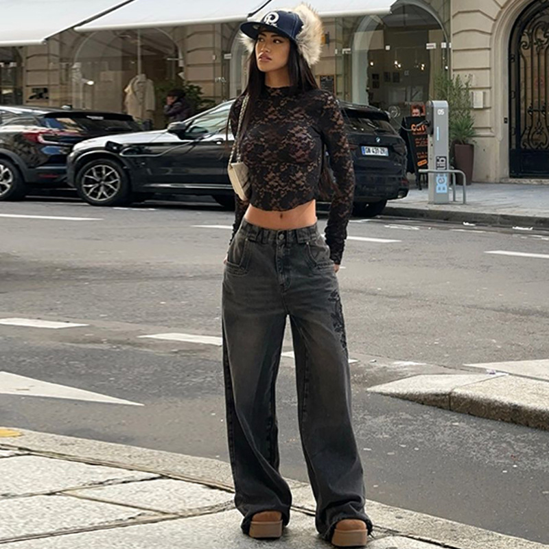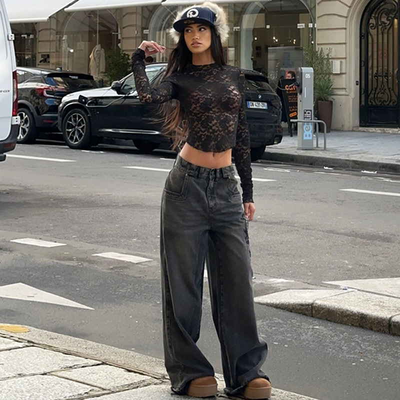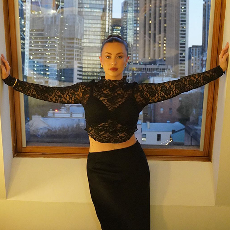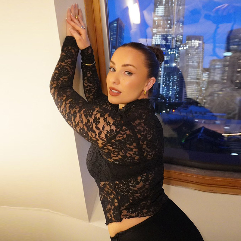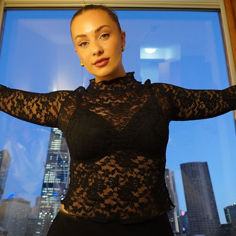 Sexy V-Neck Sheer T-Shirts Fashion Women Flare Long Sleeve Spring Lace Slim Pullovers Tops Casual Evening Party Club Chic Tees