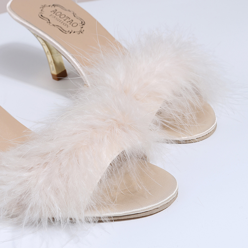 Solid Color Feather Fairy Slippers Summer Transparent Sandals Thin High Heels Sexy Fur Crystal 6cm Low Heel Derss Women Shoes