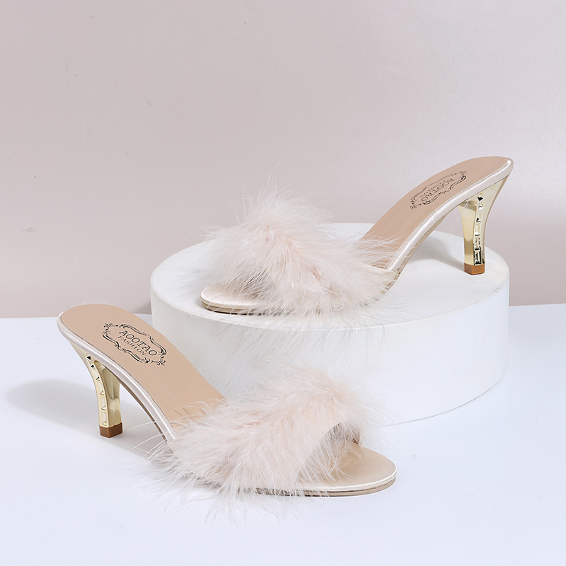 Shoes for Woman 2024 Summer Feather Thin High Heels Slippers Peep Toe Lady Pumps Slides Big Size Fur Peep Toe Fashion Designer