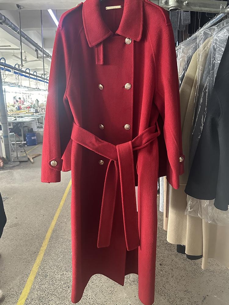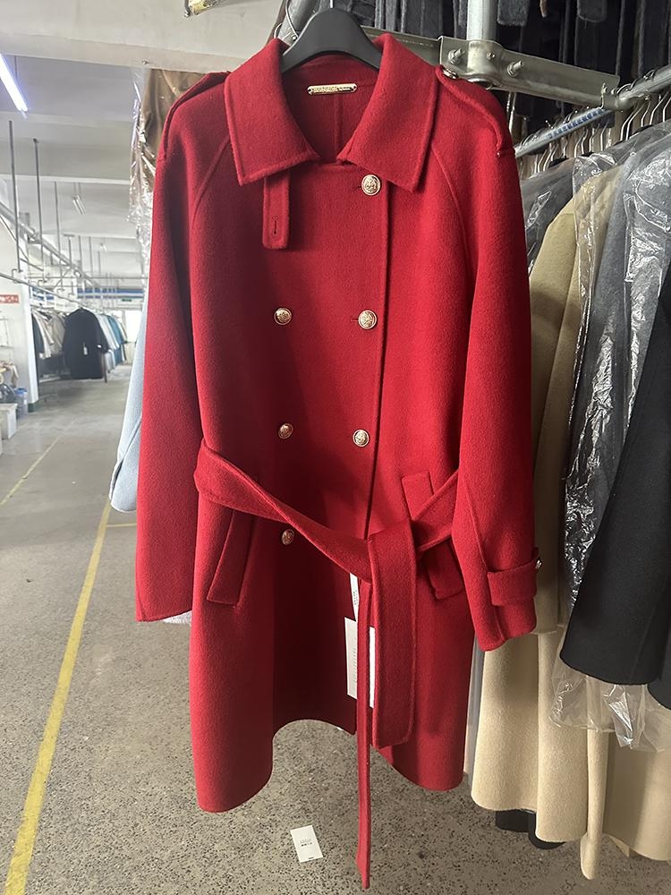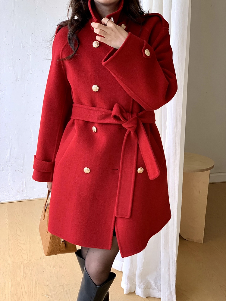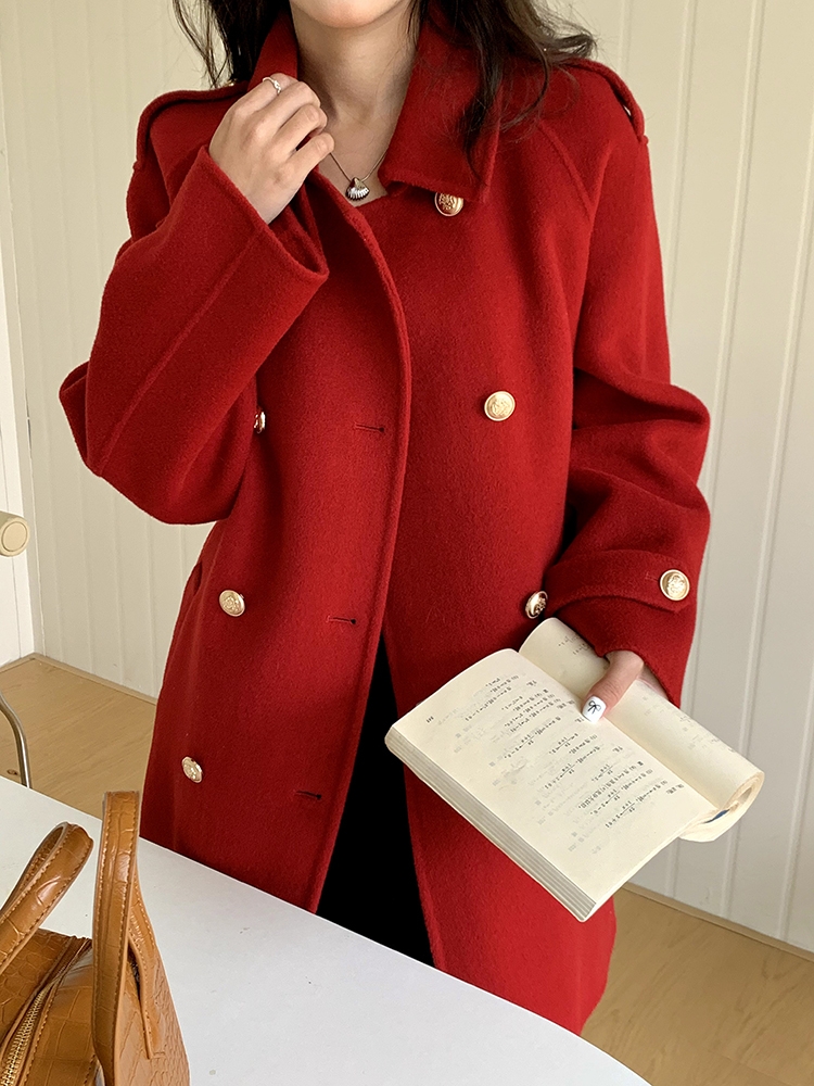 Shoulder Cover Office Lady Marth Red Woolen Jackets 2024 Autumn And Winter Double Breasted Lace-Up Women’s 100% Wool Coats