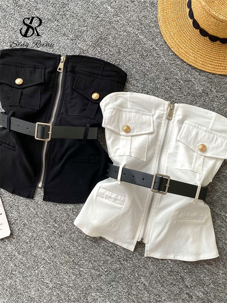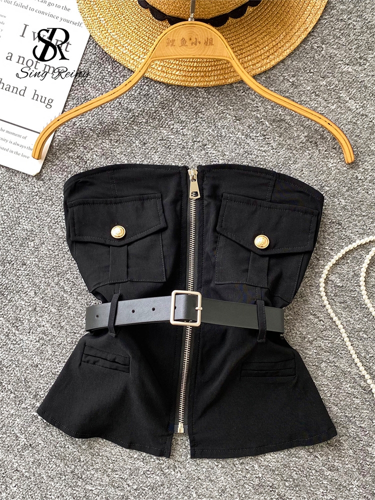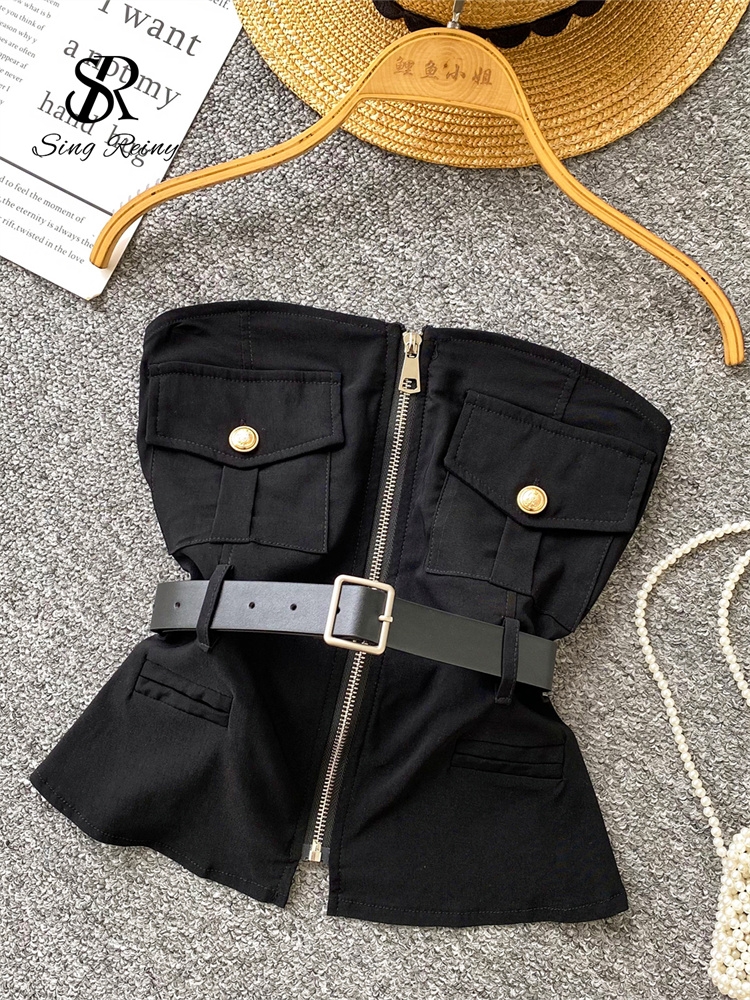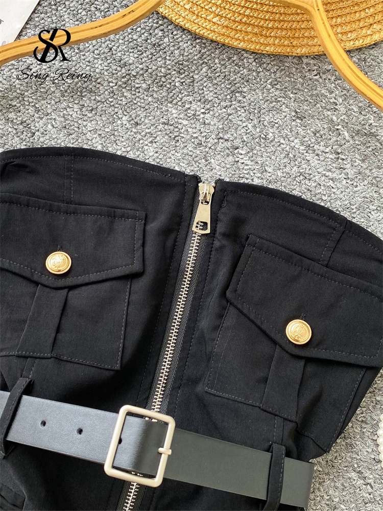 SINGREINY Safari Style Sexy Top 2025 Ladies Sleeveless Pockets Sashes Short Camisole Streetwear Strapless Zipper Retro Tank Top
