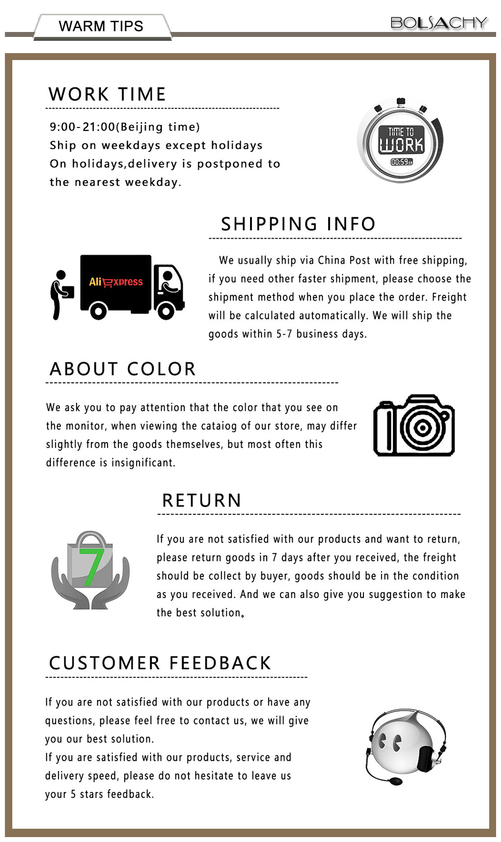 Q1:Wholesale and drop shipping are both welcomed? For wholesale ,we will offer discount or free express shipping . For drop shipping ,we could send the goods to your customers directly and wonrsquot leave information about us if yoursquod like to. Q2:How can I track my parcel? You can track your parcel on the following website using your tracking number: www.17track.net/en(copied to the browser to open) Q3:What can I do when purchase protection time is running out? If your purchase protection time is running out .please contact us and we can help you to expend it.So your money will not go to my account .