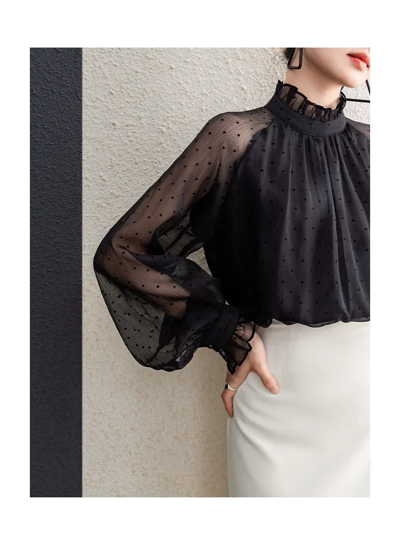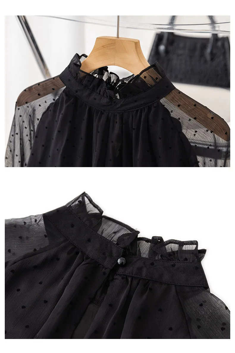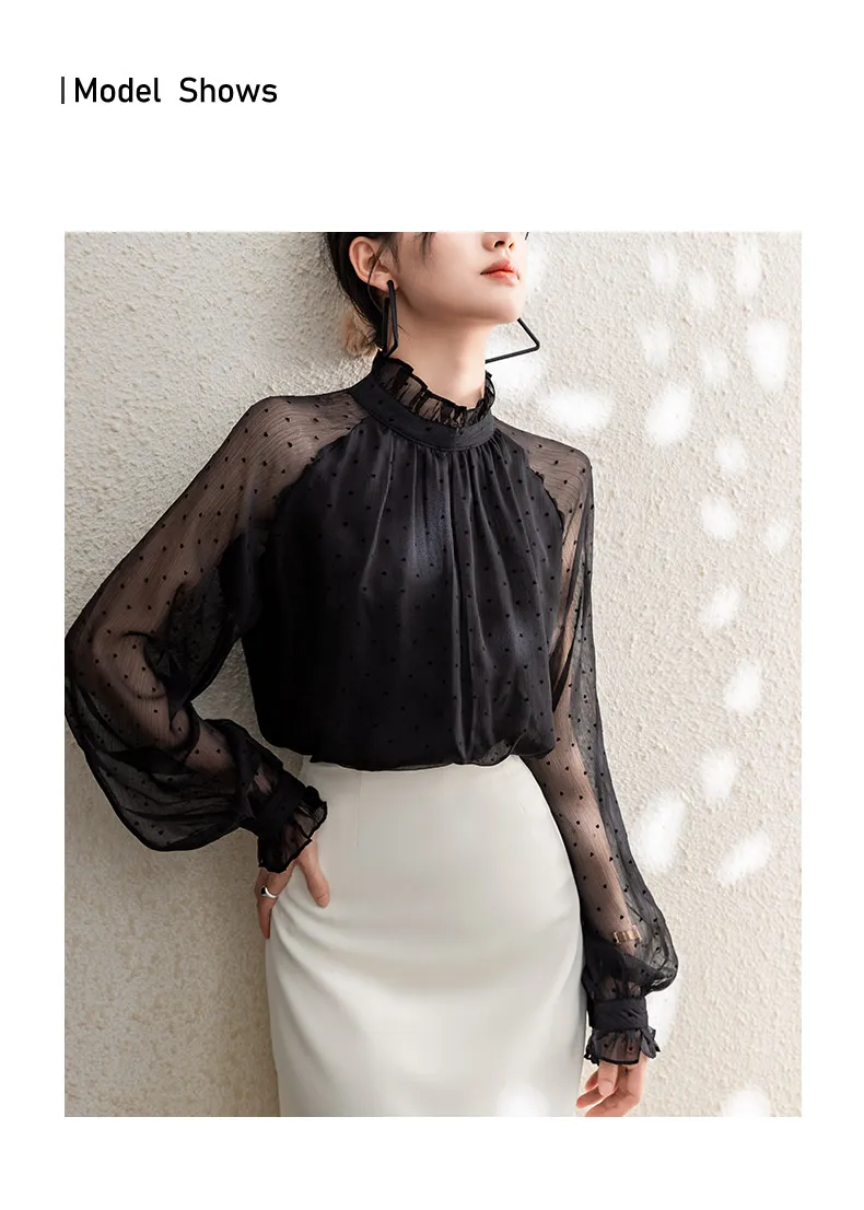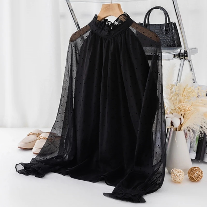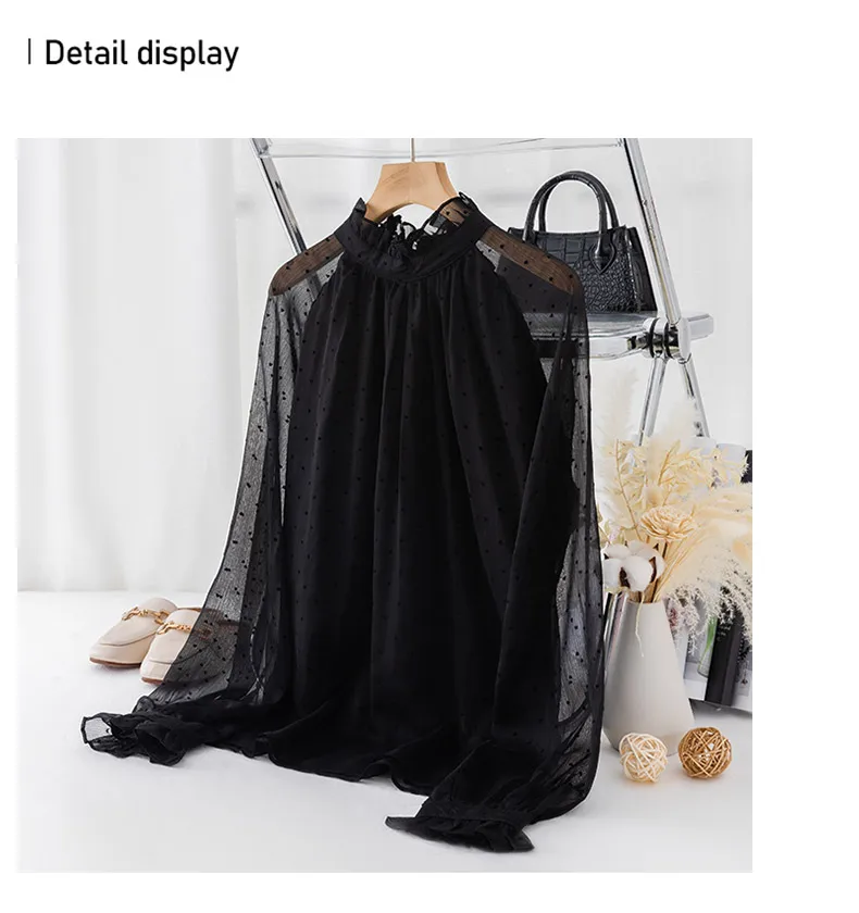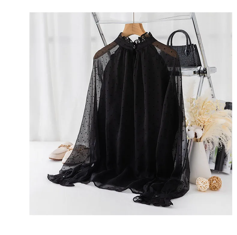 Spring Summer Black Polka Dots Mesh Women’s Chiffon Blouses 2025 New Long Sleeve Stand Collar Vintage Loose Shirts Female