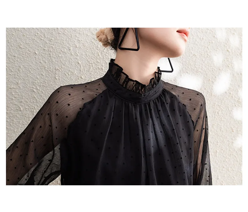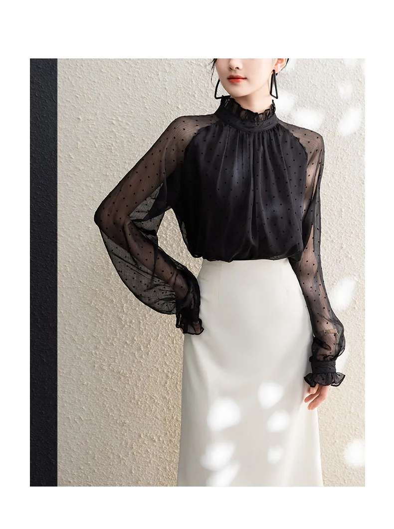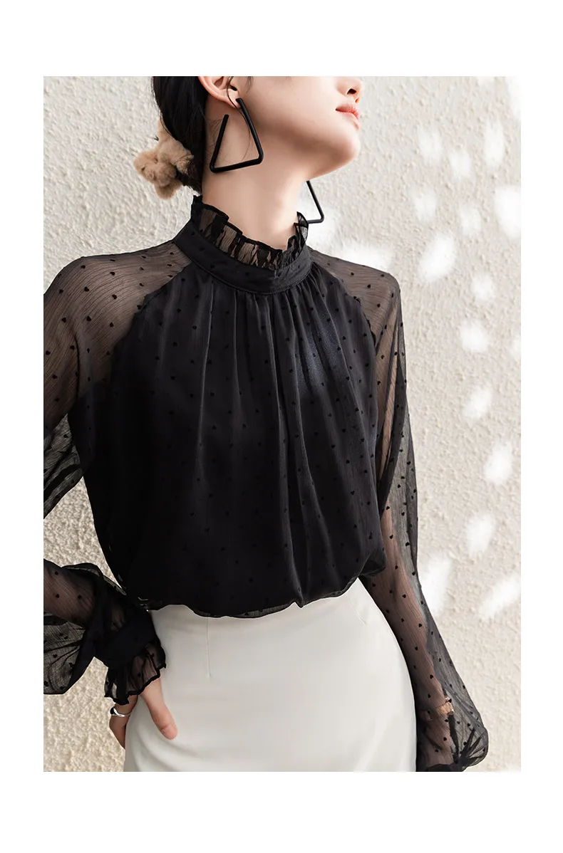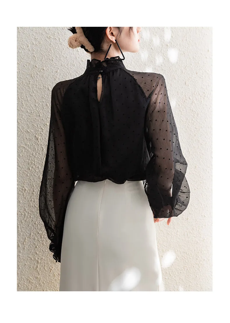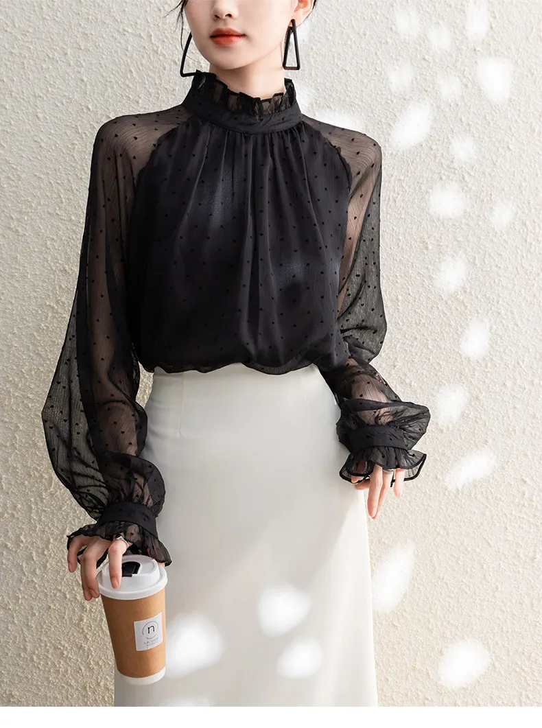 Spring Summer Black Polka Dots Mesh Women’s Chiffon Blouses 2025 New Long Sleeve Stand Collar Vintage Loose Shirts Female