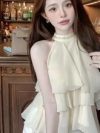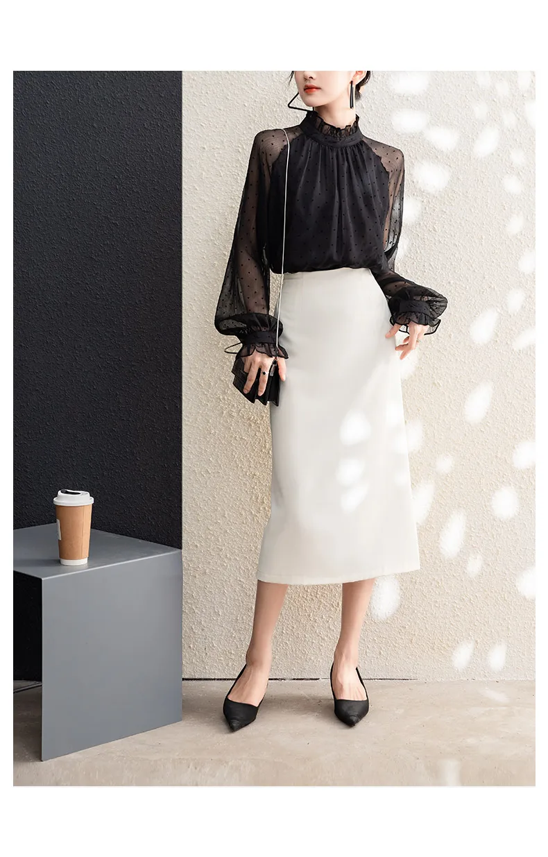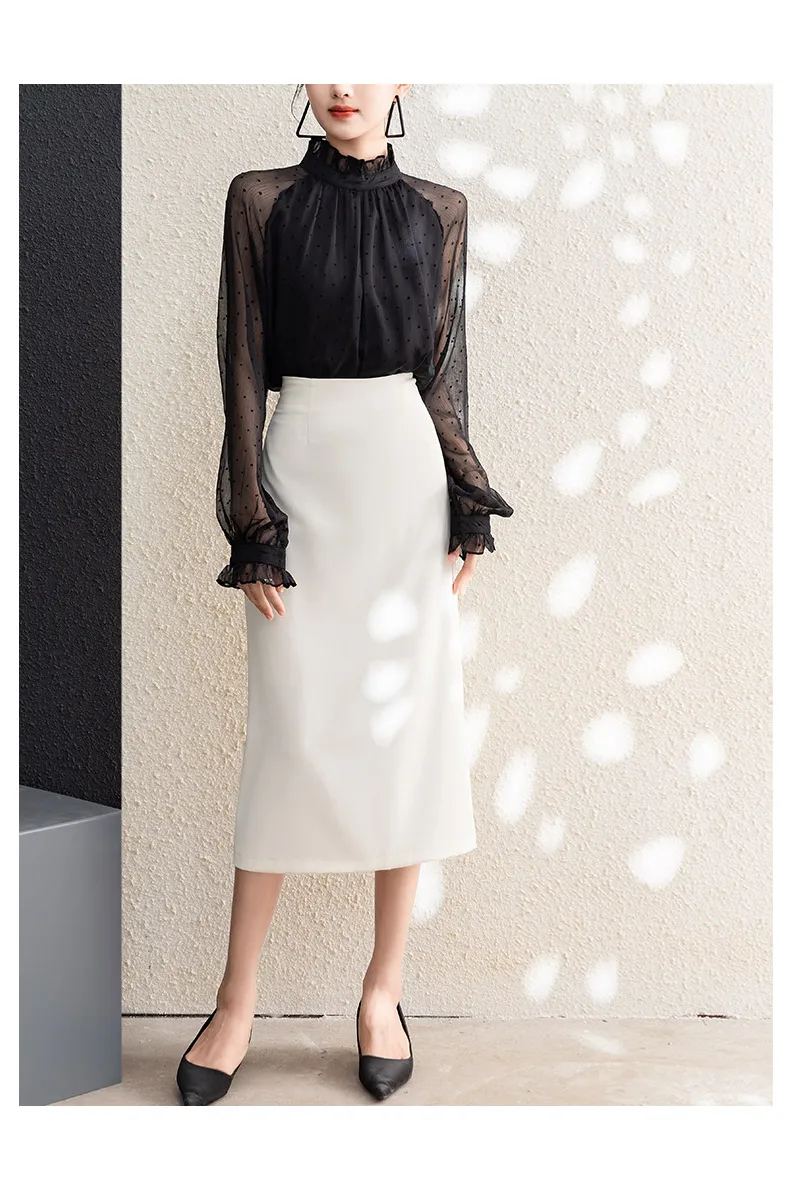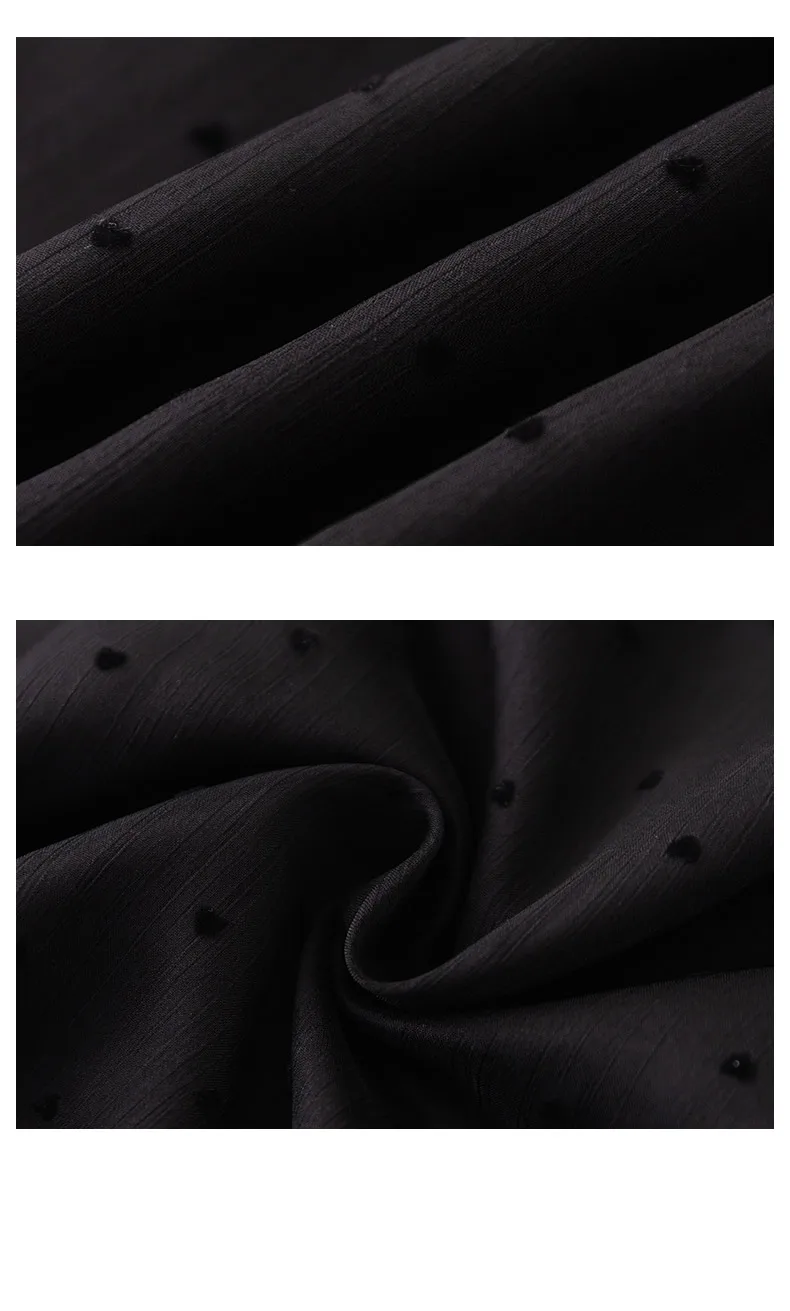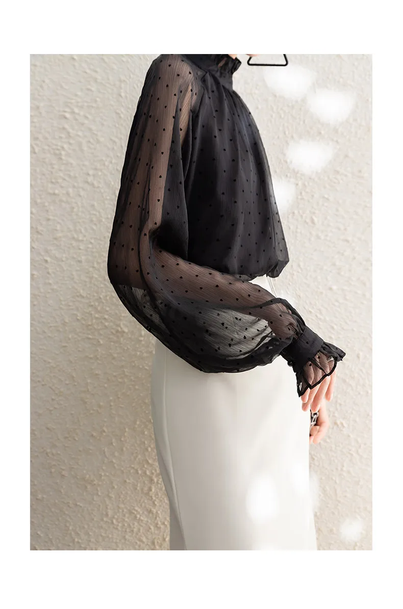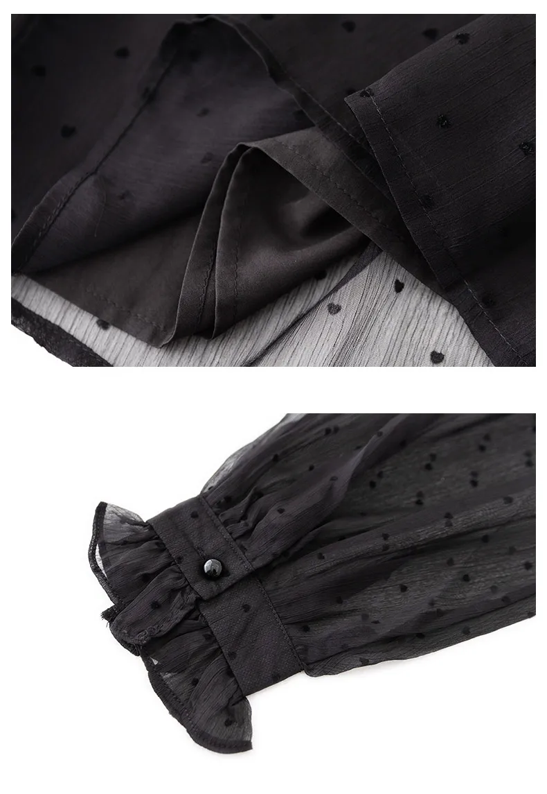 Spring Summer Black Polka Dots Mesh Women’s Chiffon Blouses 2025 New Long Sleeve Stand Collar Vintage Loose Shirts Female