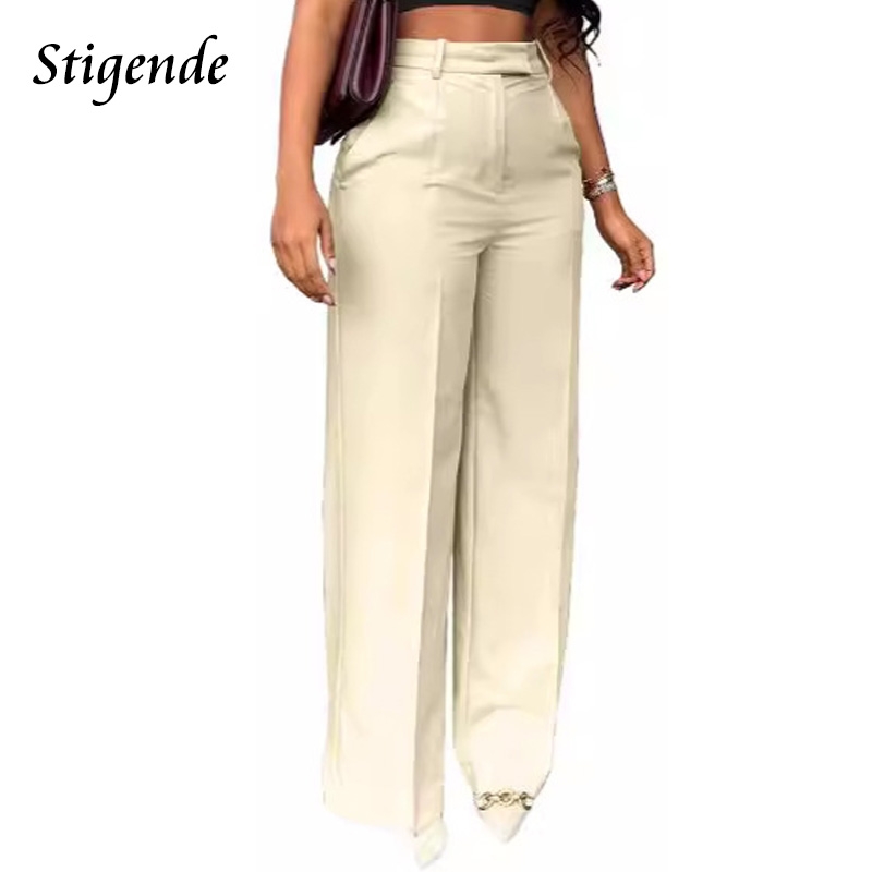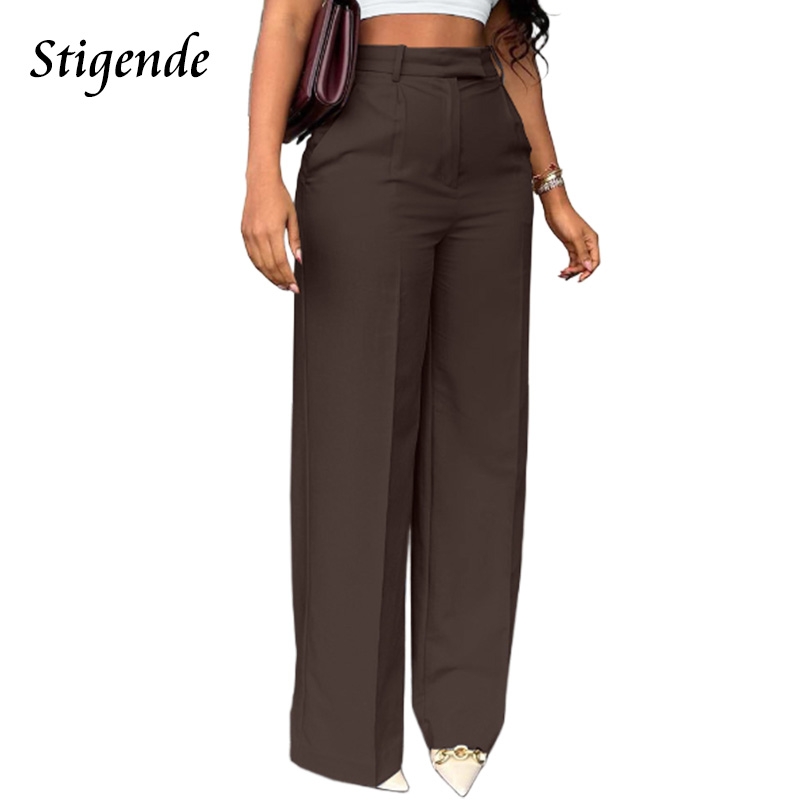 Stigende Wide Leg Straight Dress Pants with Pocket Women Plain Color Business Casual Pants Loose Fit Midi Waist Office Trousers