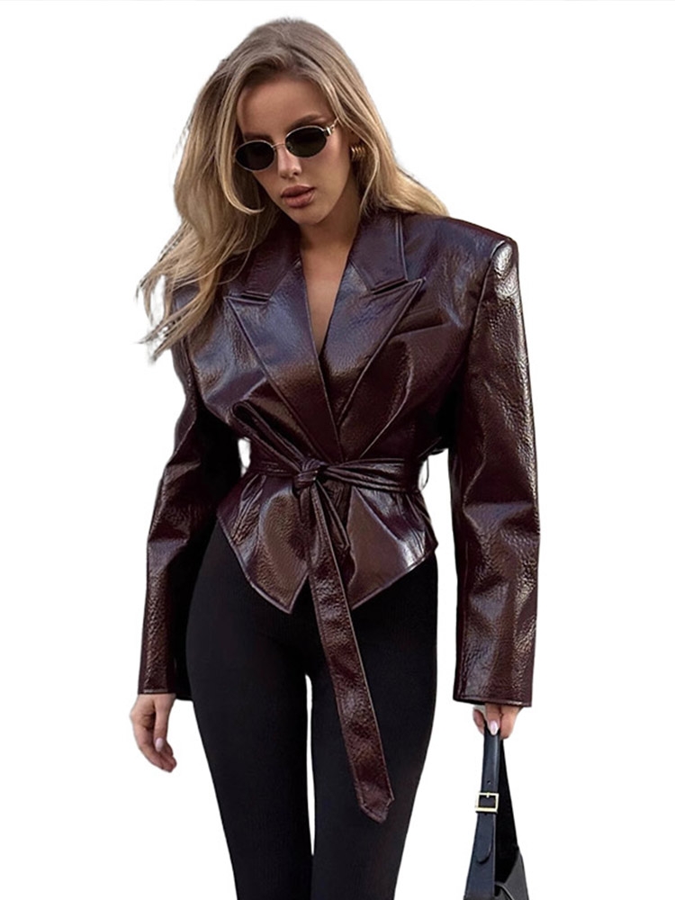 Street PU Belt Jacket Women Turn-down Collar Full Sleeve Solid Loose Short Jackets Female 2025 Autumn Winter Lady Outwears