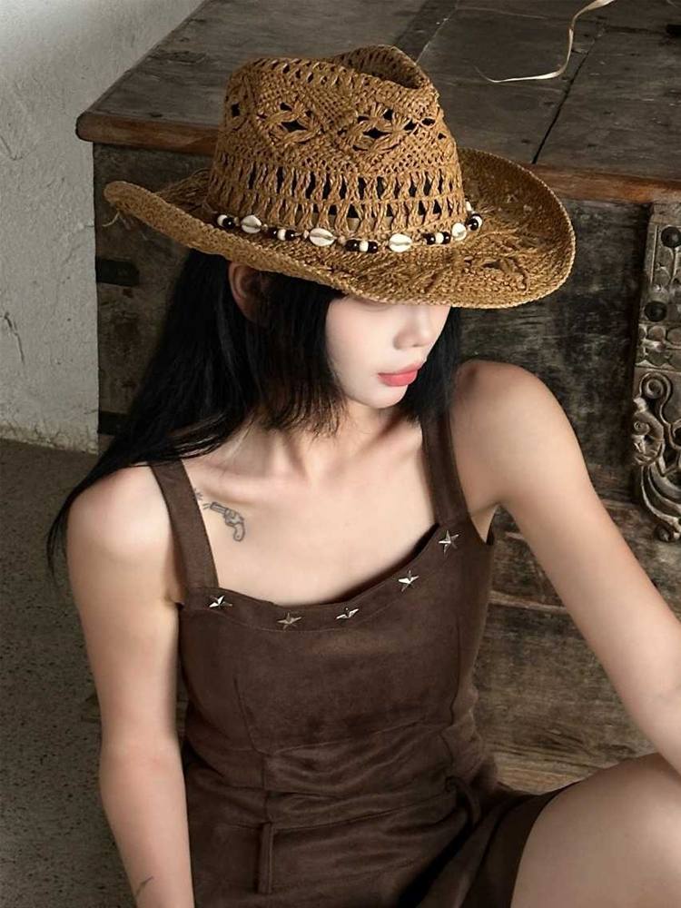 Summer Bohemian Shell Straw Hat Beach Women Men Cowboy Hats Wooden Beads Hollow Out Western Wide Brim Sun Hat Holiday Cap